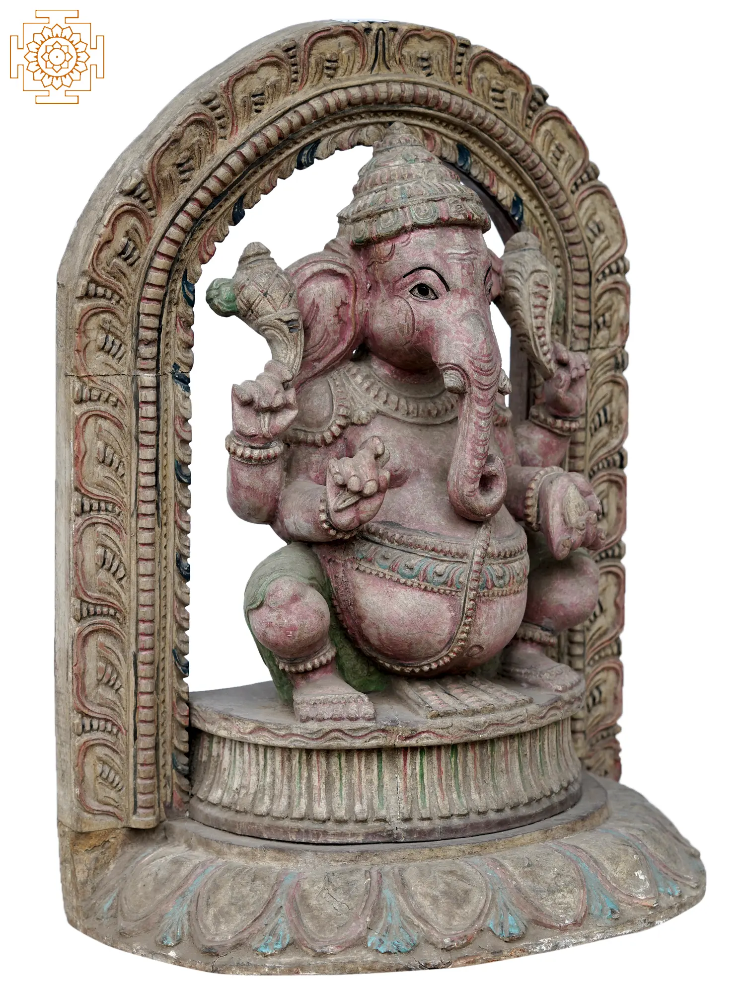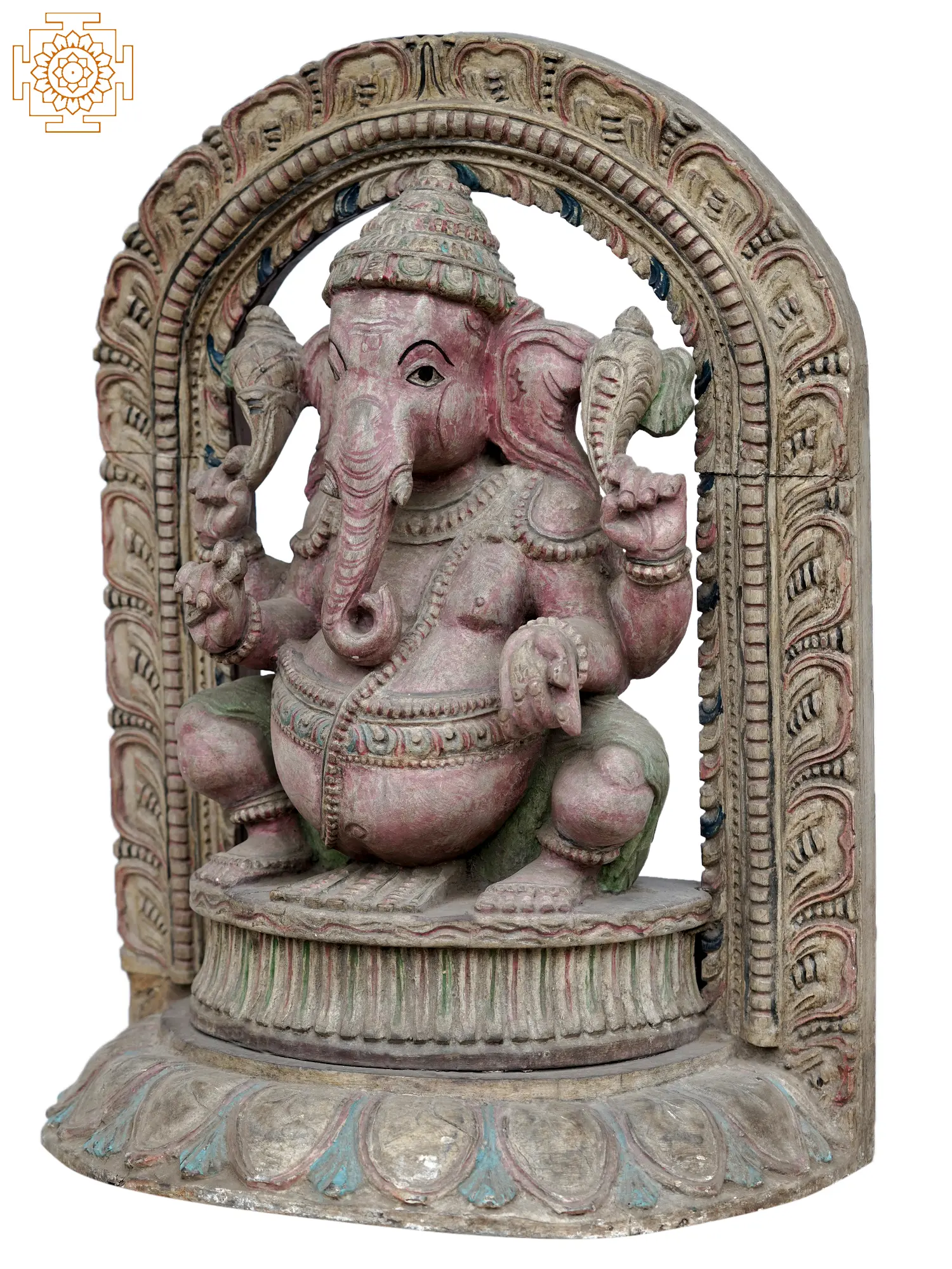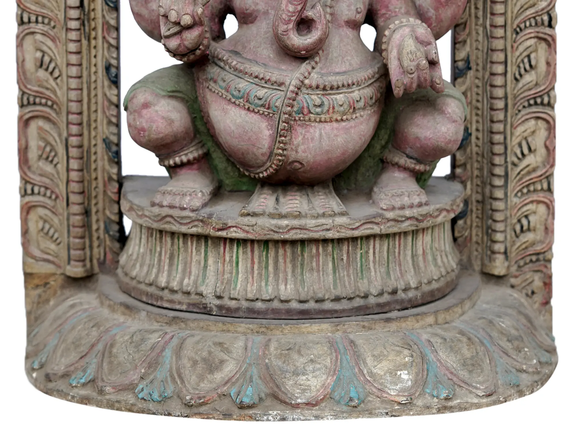 Crafted from solid wood, this sculpture showcases exceptional artisanal skill. The details are meticulously rendered, from the gentle curve of Ganesha's trunk, often associated with his discerning intellect, to the serene expression on his face. His four arms, a common depiction, signify his mastery over the four aspects of the human personality: mind, intellect, ego, and consciousness. In his hands, he may hold symbolic objects like a noose (to bind the devotee to his will), an elephant goad (to control the mind), a bowl of sweets (representing the rewards of spiritual practice), and a broken tusk (symbolizing his sacrifice for knowledge). The ornate pedestal and the decorative arch further enhance the visual appeal, providing a sacred backdrop that complements the divine form. The subtle coloring adds depth and character, evoking a sense of age and spiritual sanctity.