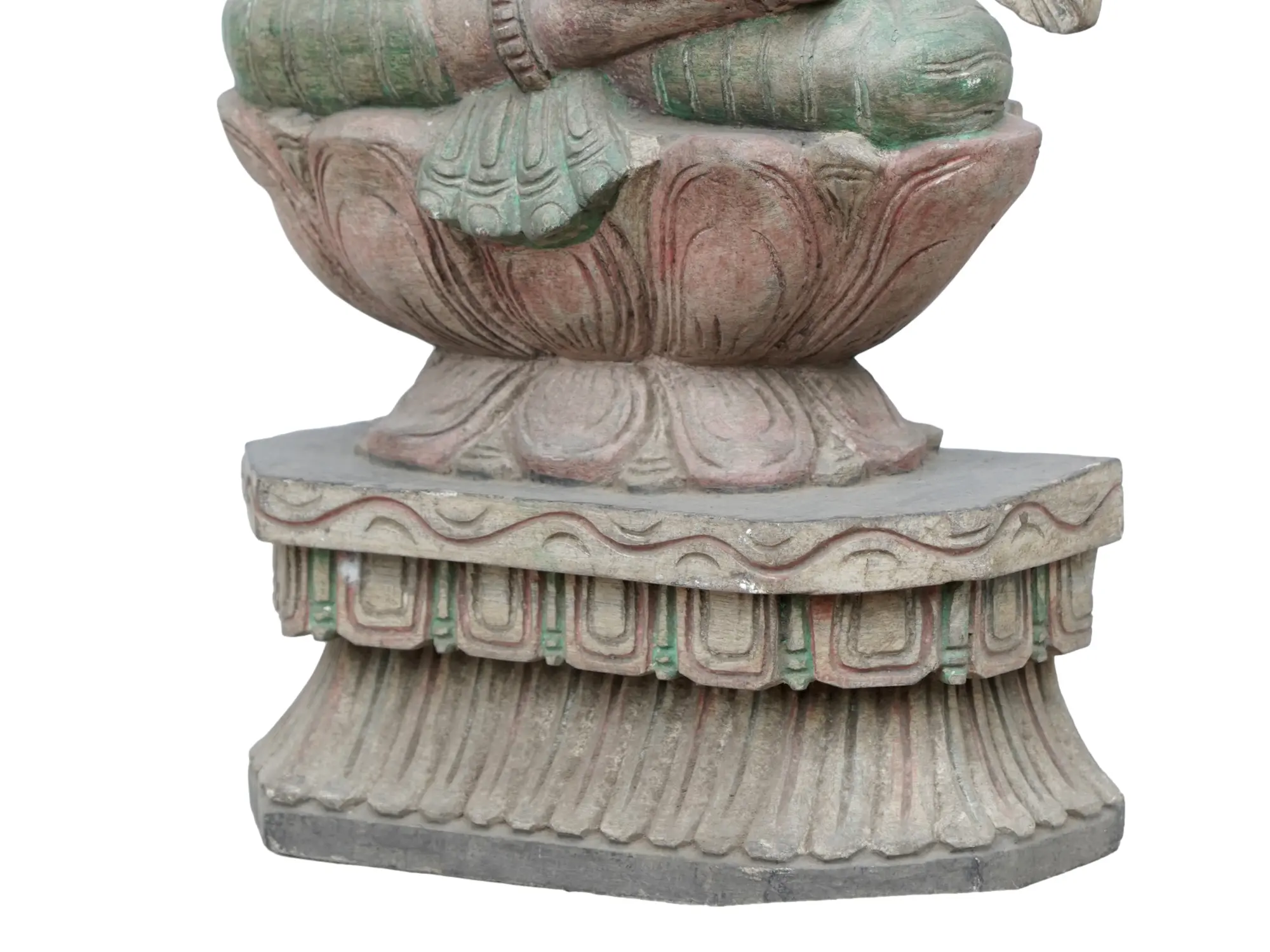 The image of Garuda, a revered deity in Hinduism, symbolizes power, courage, and divine intervention. The Lord Garuda statue, seated in Vajrasana on a lotus with hands in namaskar mudra, exudes a sense of serenity and devotion. The wooden statue's distressed finish adds a timeless and weathered charm, enhancing its aesthetic appeal.