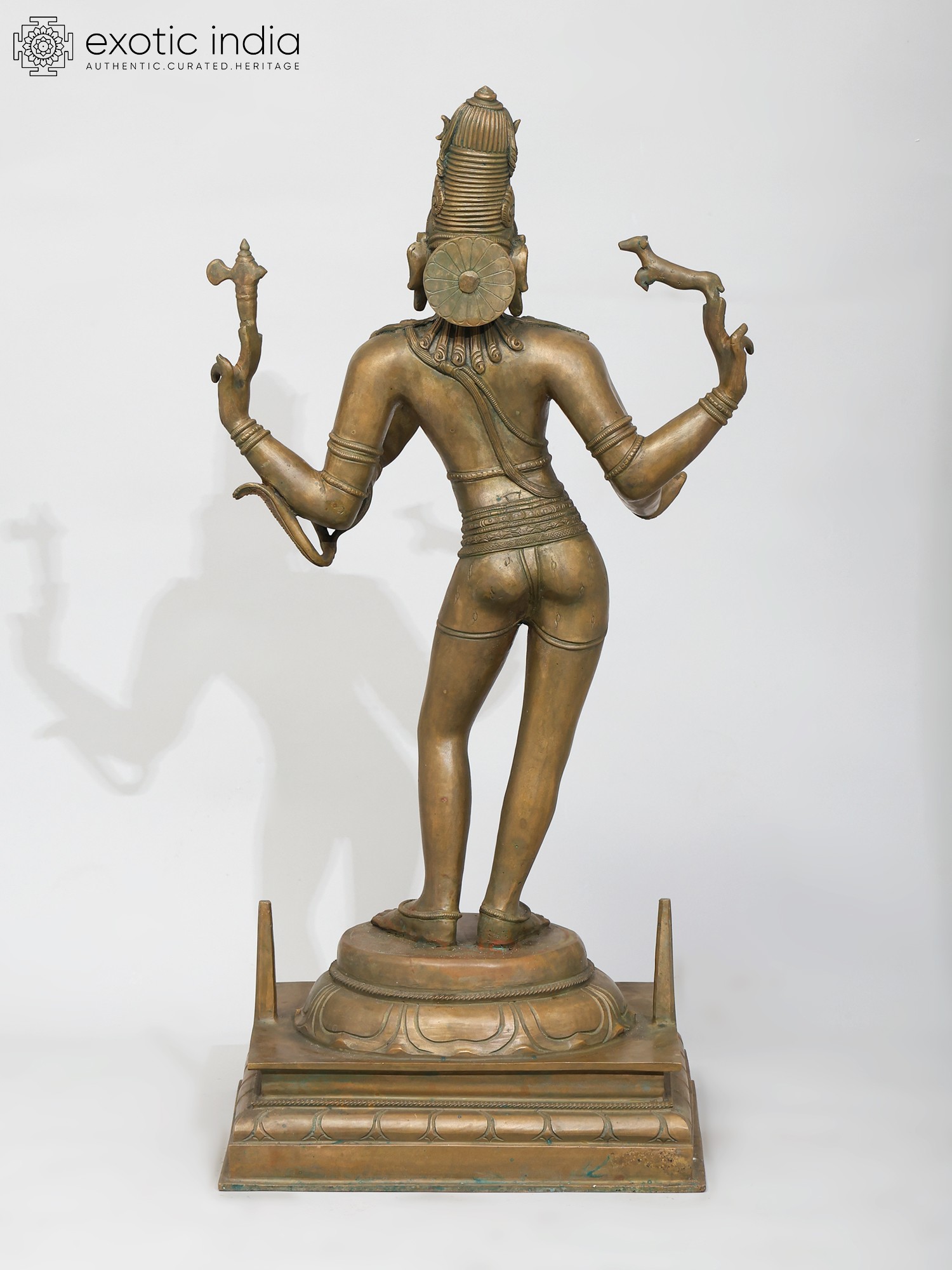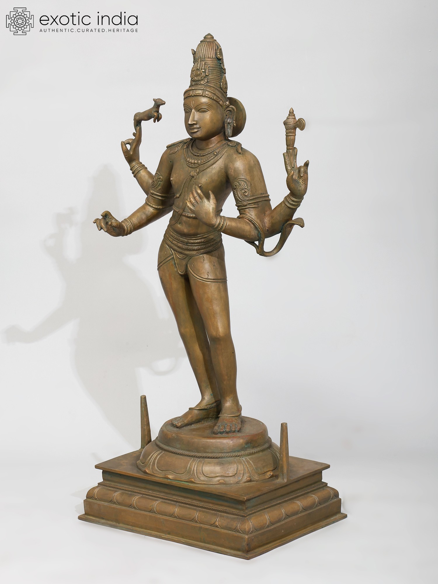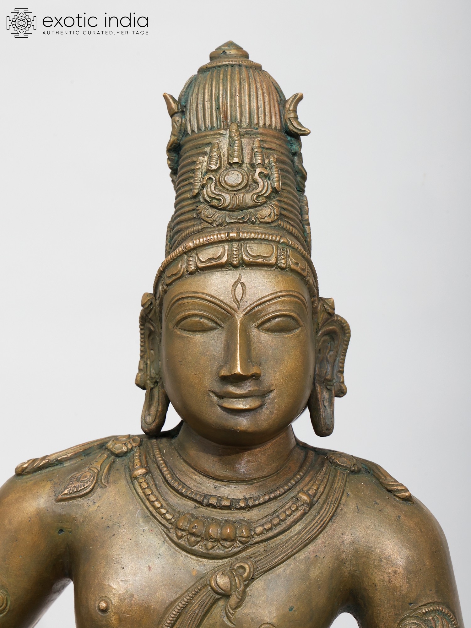 His hair is styled in a long Jatamukuta, which is embellished with the crescent moon, Ganga, and Makara emblem.