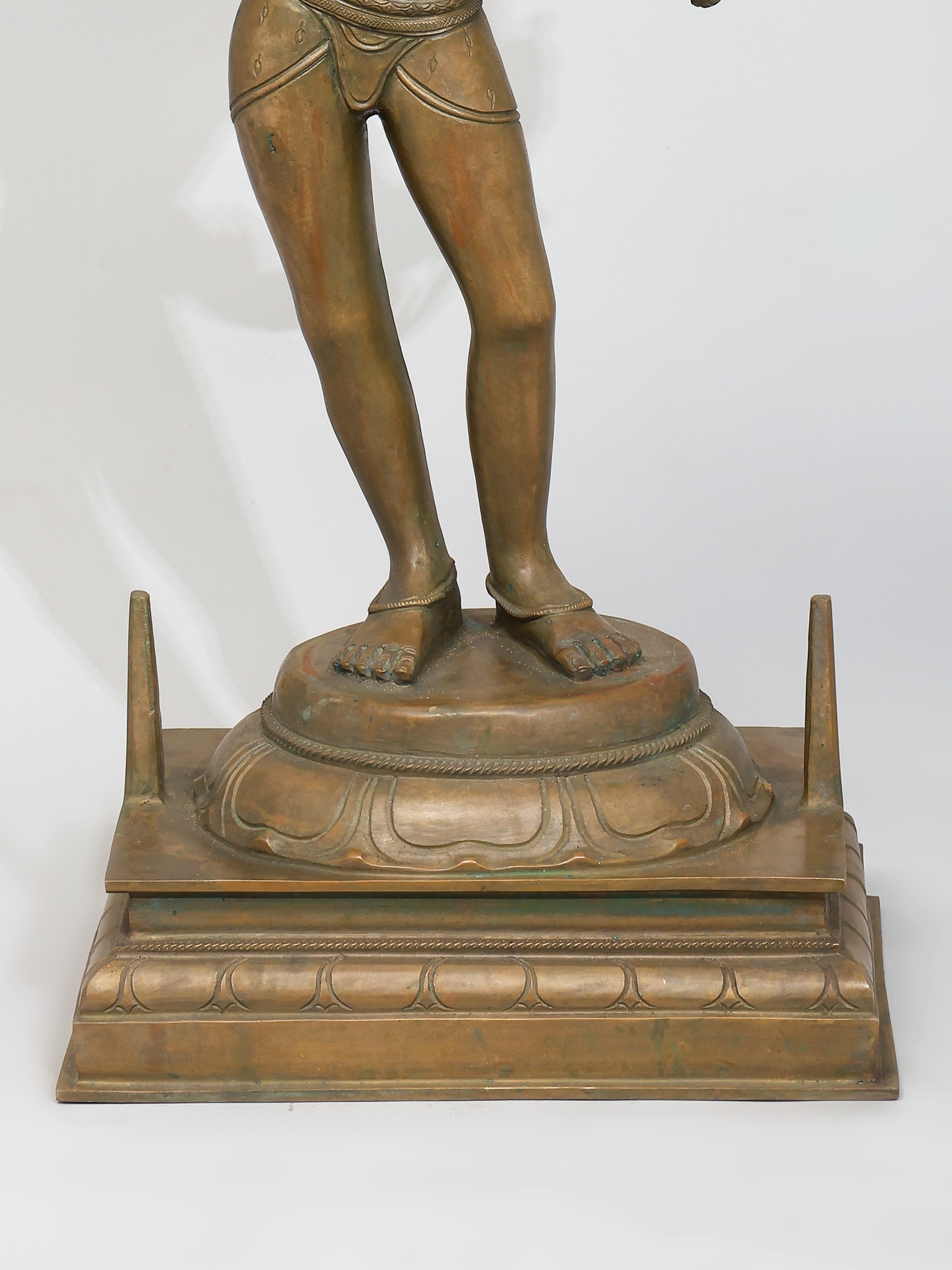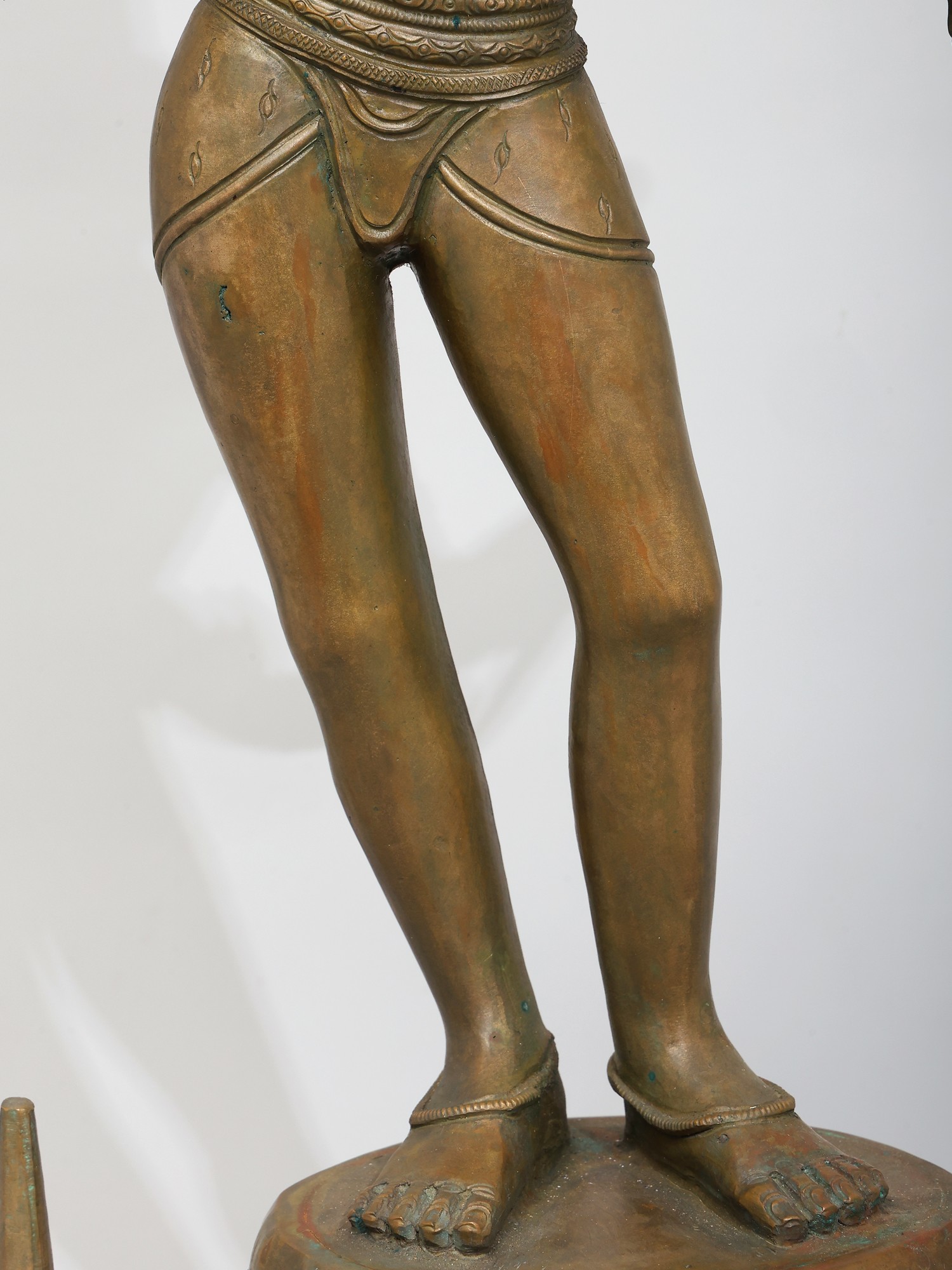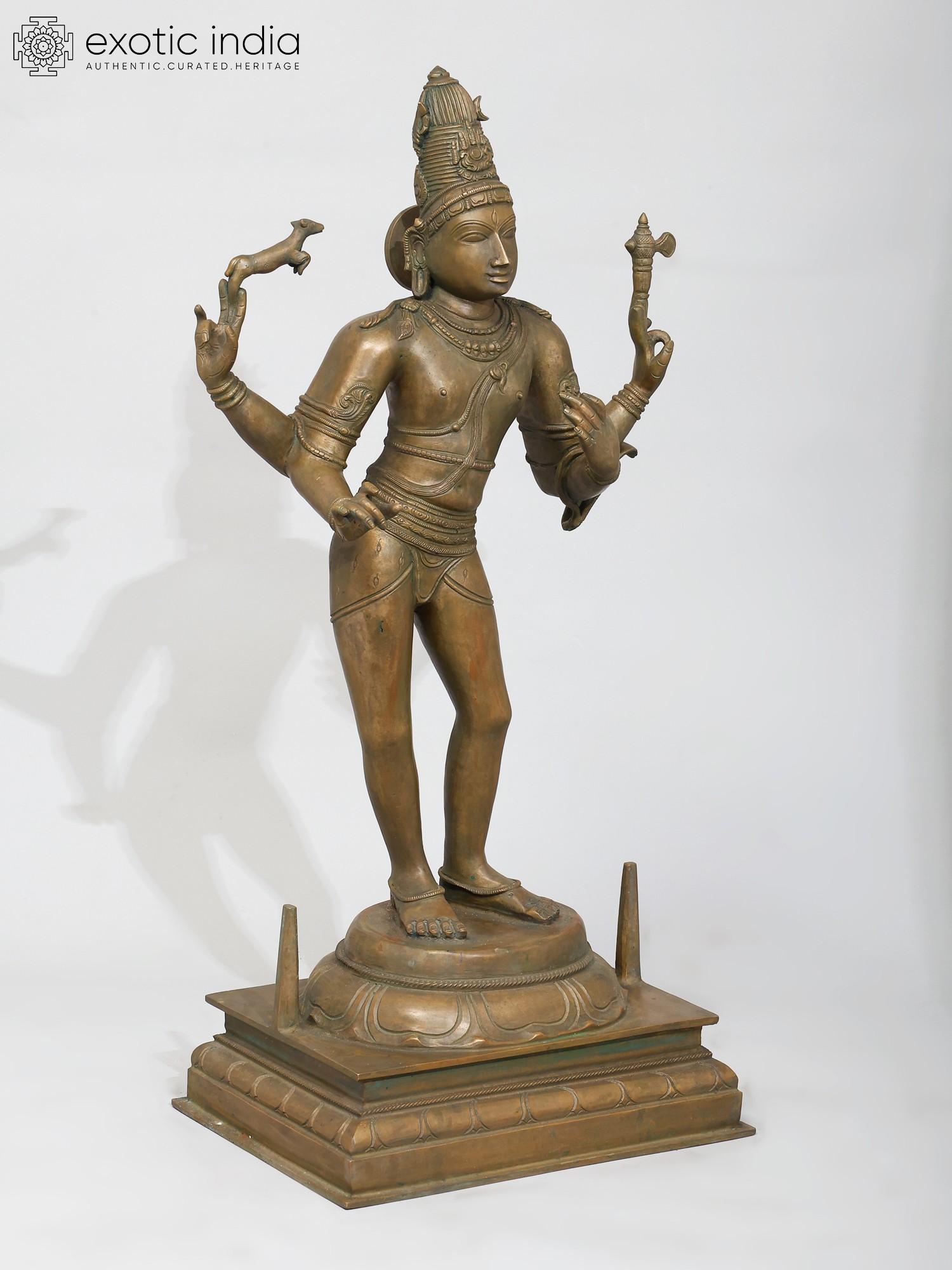 His hair is styled in a long Jatamukuta, which is embellished with the crescent moon, Ganga, and Makara emblem.