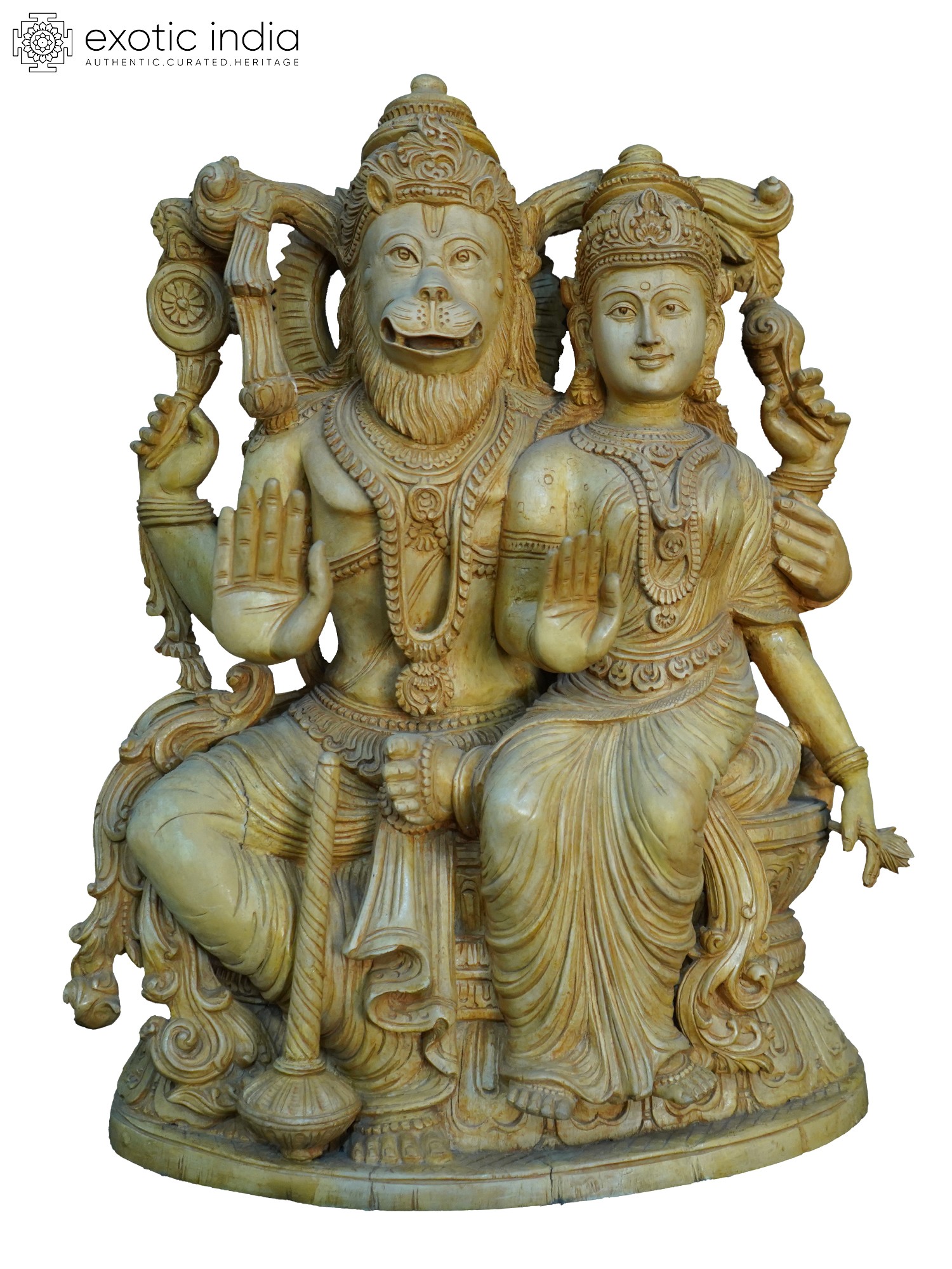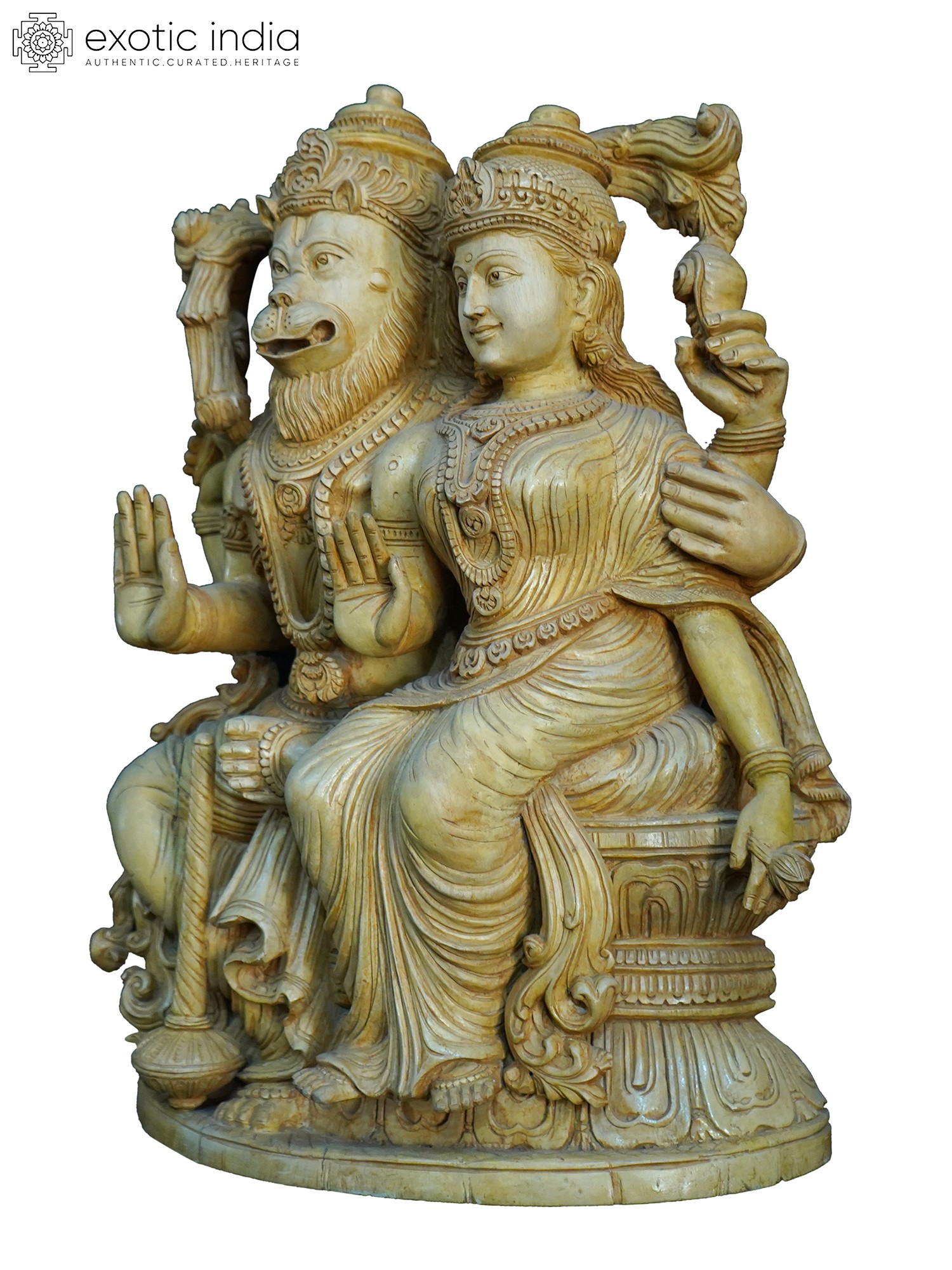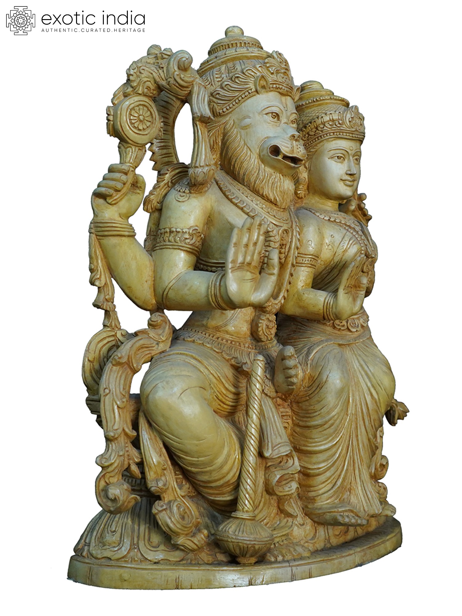 24" Lord Vishnu As Narasimha With Goddess Lakshmi | Handmade White Wood Statue