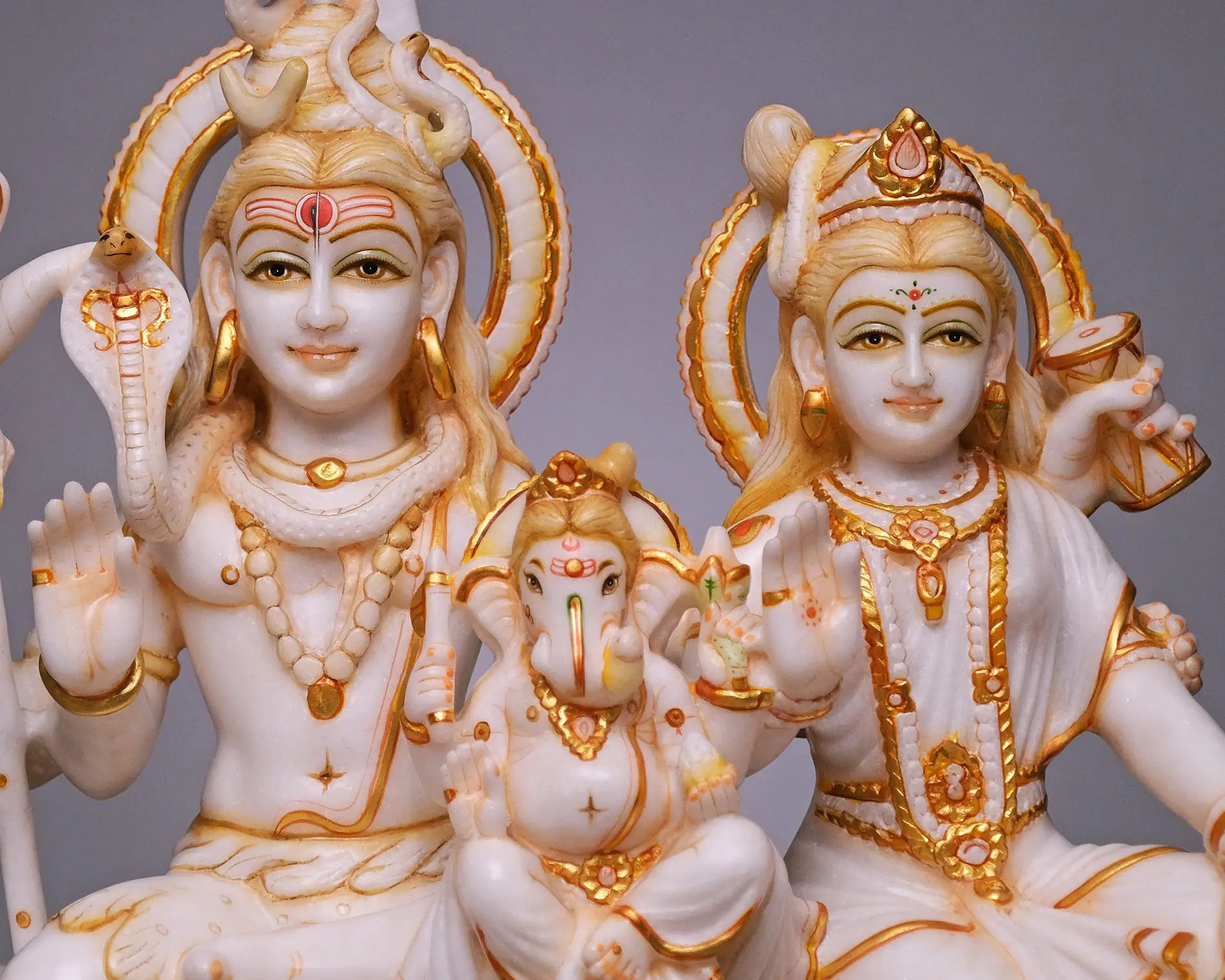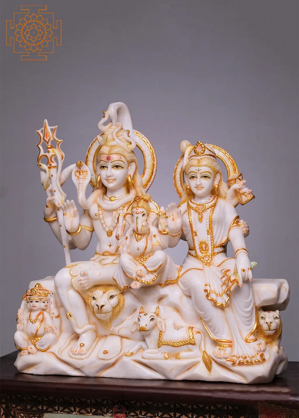 This exquisite statue captures the serene and powerful presence of Lord Shiva and Goddess Parvati, seated with their beloved sons, Lord Ganesha and Kartikeya. Crafted from luminous white marble, this handmade masterpiece embodies divine grace and intricate artistry, making it a truly captivating centerpiece for any sacred space or discerning collection. The delicate gold accents, meticulously applied, highlight the divine features, flowing garments, and symbolic adornments, imbuing the sculpture with an ethereal glow. The composition depicts Lord Shiva, the Great God, in his benevolent aspect, adorned with the crescent moon and the sacred serpent coiled around his neck. Beside him, Goddess Parvati, the divine mother, radiates compassion and strength. Nestled between them is the elephant-headed Lord Ganesha, remover of obstacles, symbolizing wisdom and good fortune. To their side, the young Kartikeya is represented, the god of war, often depicted as a beautiful youth. The presence of Nandi, Shiva's loyal bull mount, and a graceful cow, representing purity and abundance, further enriches the narrative of this divine family.