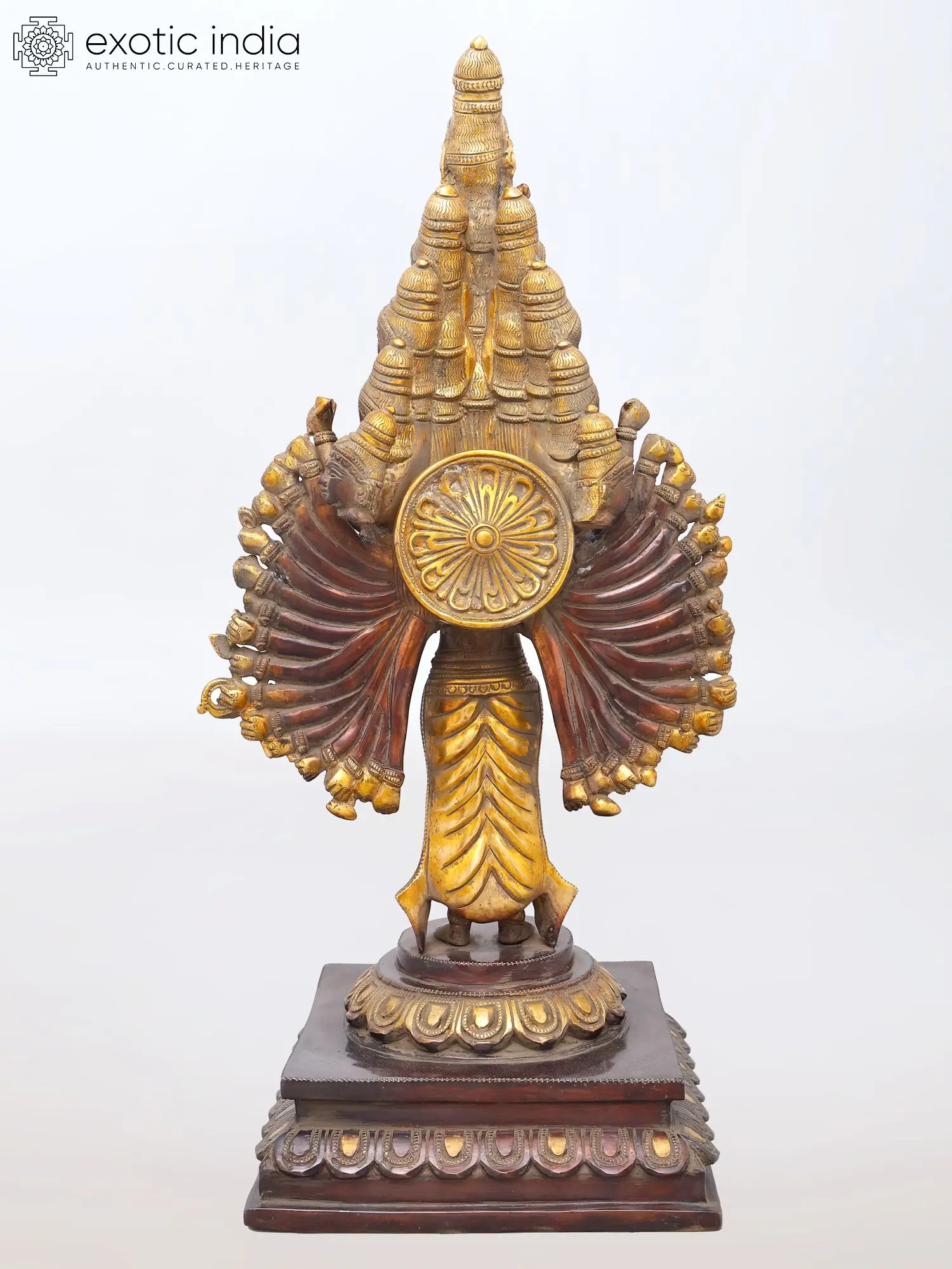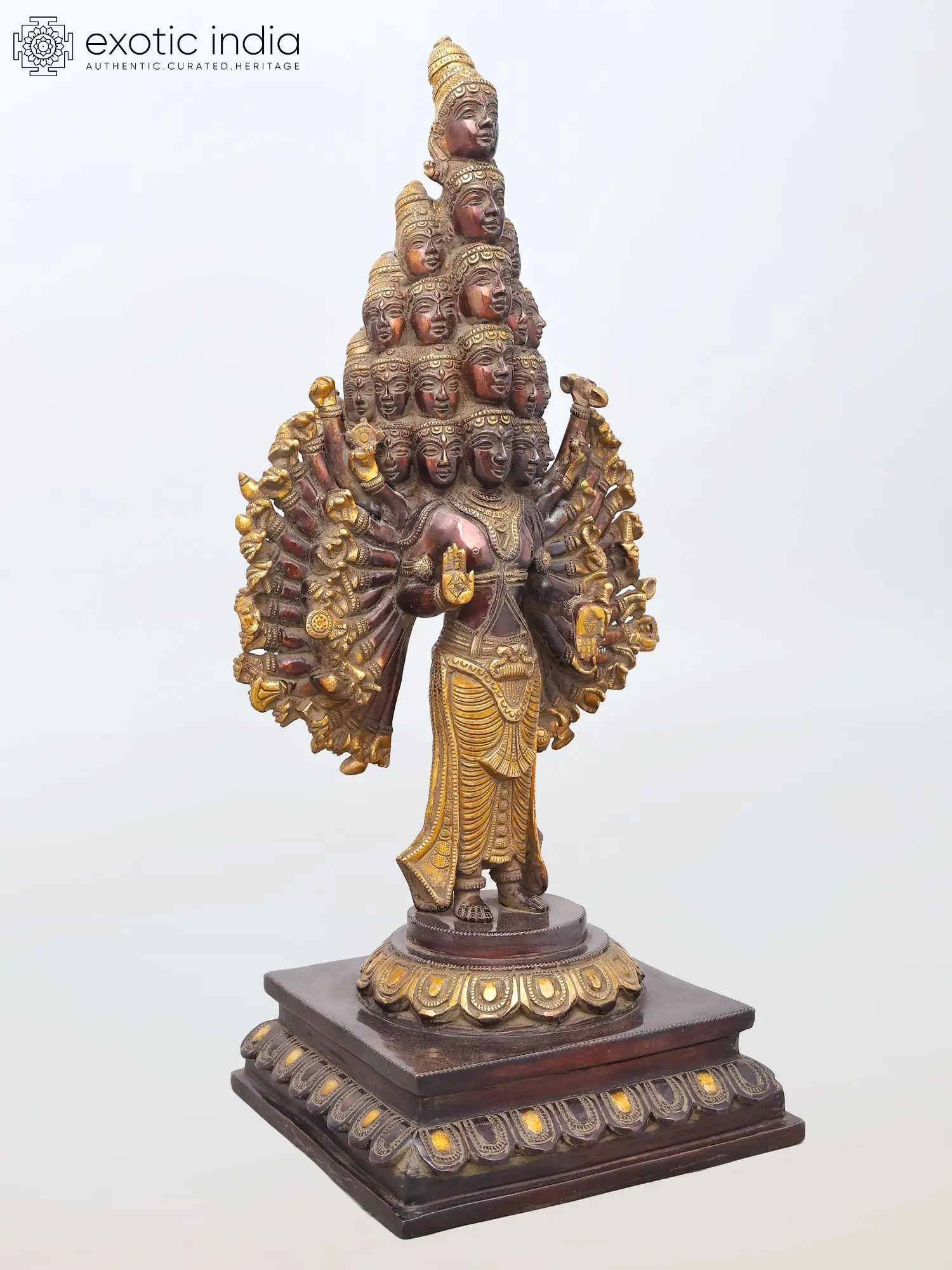 You will immediately appreciate the commanding presence this piece commands, standing at a substantial 24 inches in height. Its captivating form unfolds with a central figure surrounded by a cascade of faces, each unique yet harmoniously integrated, culminating in an apex of divine awareness. The sheer volume of arms, extending outwards in various gestures, signifies omnipotence and the boundless reach of divine energy. The rich patina of the brass, coupled with the subtle interplay of polished and darker tones, accentuates the sculptural prowess and adds a tangible sense of history. The base, a deep, dark wood-toned brass structure, provides a stable and elegant foundation, adorned with intricate motifs that echo the celestial theme.