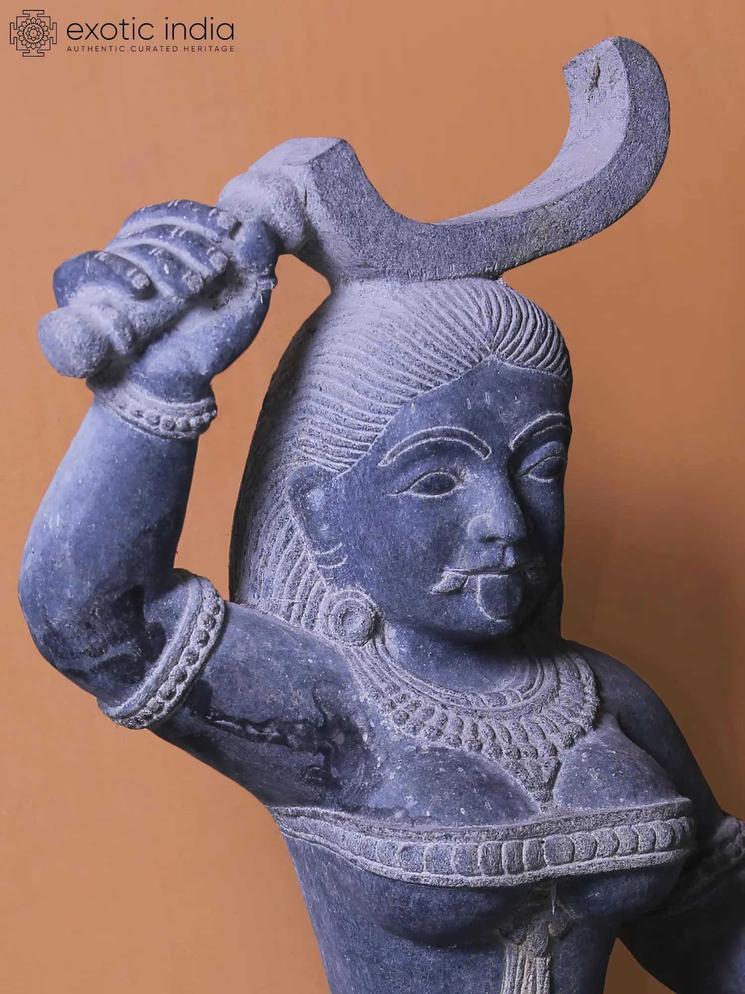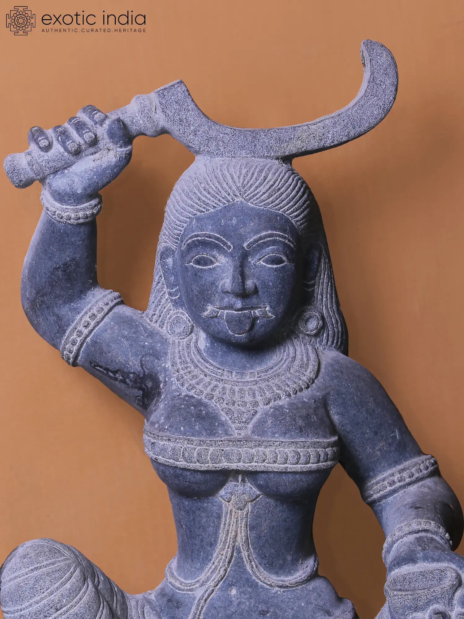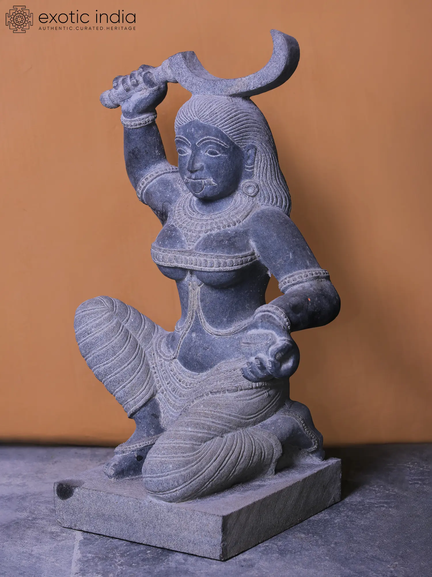 The Chandra (crescent moon) that adorns the head of Kali, becomes her crescent-shaped Khadaga in this animated sculpture of the warrior Hindu goddess, presented in a valiant pose of severing demon-heads to drink their blood.