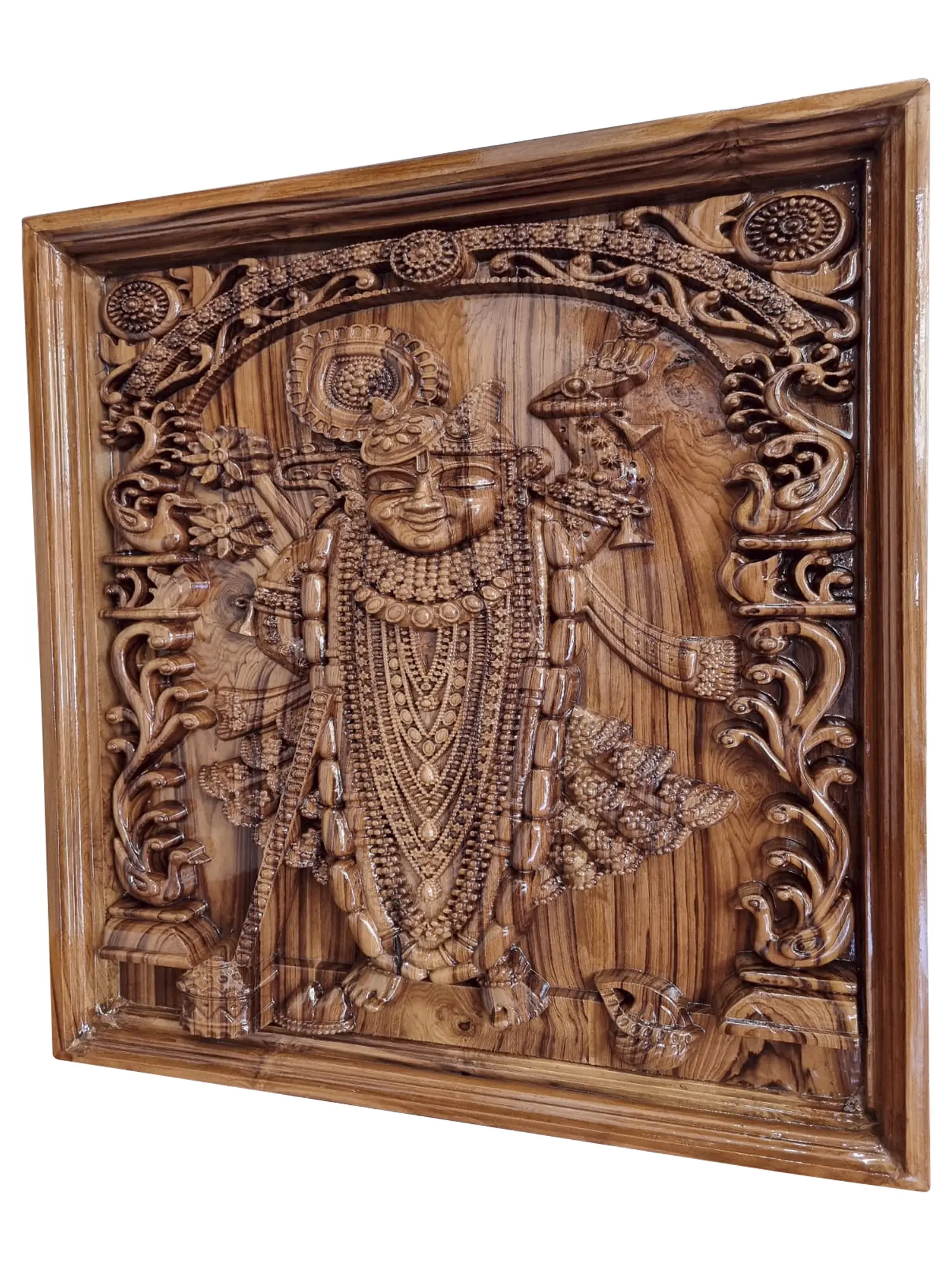 The natural grain of the teak wood adds a warm and organic feel, highlighting the depth and texture of the carving. The panel is framed by intricate floral and foliate designs, creating a visually captivating composition. It's not just a decorative item, but a work of art that embodies the divine presence of Shrinathji.