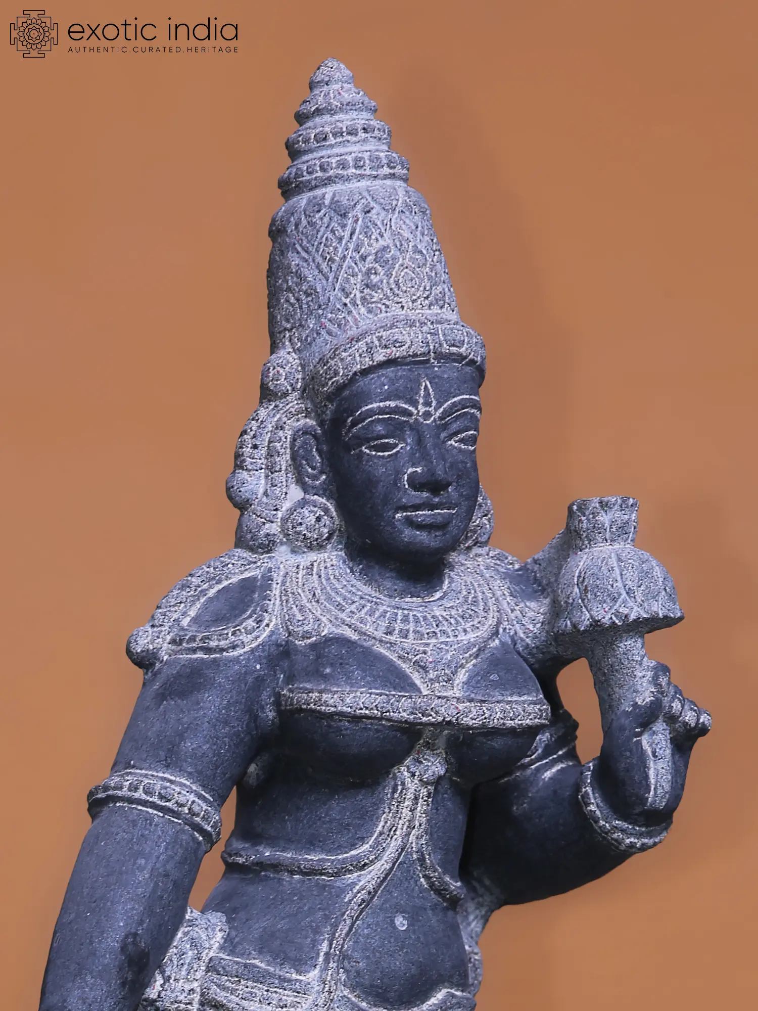 The graceful Tribhanga pose, lotus in her hand, concial crown, delicate Kuchabandha (breast band), necklace, ornaments, a beautiful dhoti with fine folds, and a heavy waist ornament, this aspect of Devi Parvati in South Indian sacred art is labled “Shivakami” or “Shivakamasundari”, representing her role as the beloved, Shakti of Shiva.