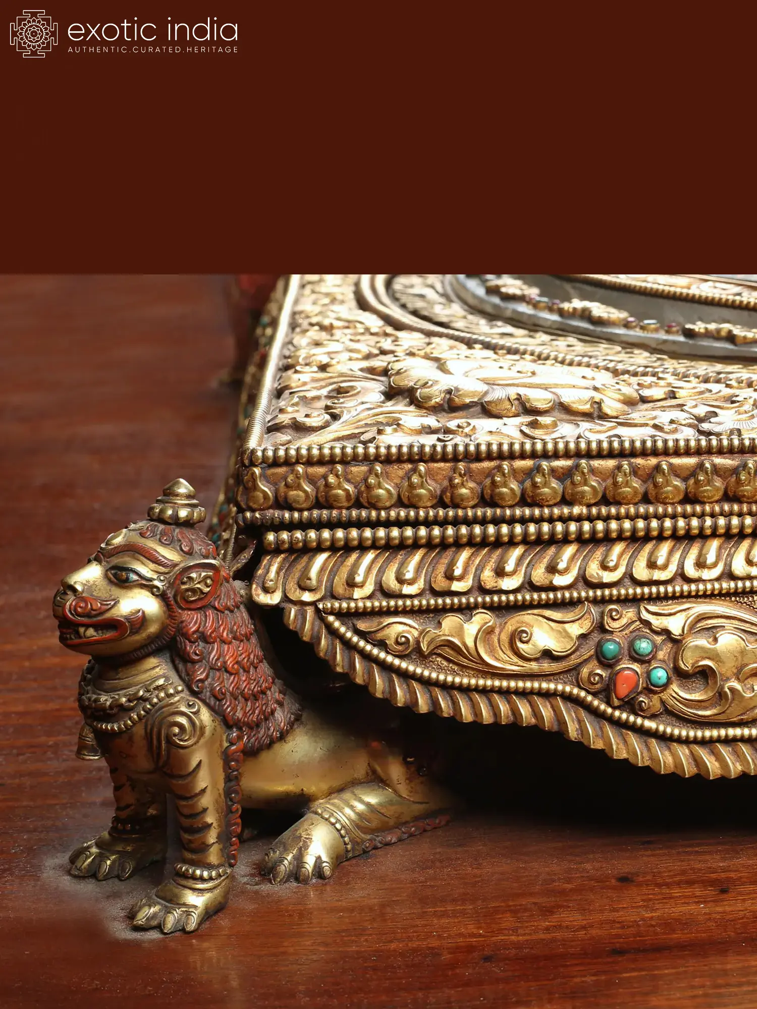 A Mandala in Buddhism represents the divine realm of the Buddha and is used by an initiate for meditation rituals. The aesthetically marvelous Buddha Mandala here is in the Nepalese idiom, made of gilded copper. Placed on the shoulders of a crouching lion, the Mandala has intricate motifs such as floral patterns, fire, Vajra, lotus, dragons, and deer with Dhammachakra in the different levels, and in the center, the Buddha sits surrounded by the Ashtamangala or eight auspicious signs. Studded with coral and turquoise, this is an ostentatious example of Nepalese art.