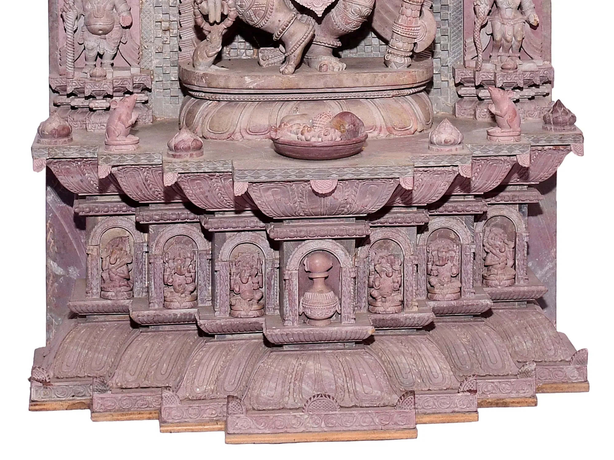 Immerse yourself in the divine presence of Lord Ganpati, the remover of obstacles and the harbinger of good fortune, captured in a breathtakingly intricate pink stone sculpture. This magnificent piece, hewn from the very earth, depicts the beloved elephant-headed deity in a vibrant, dancing posture upon a majestic throne. The artistry transcends mere representation; it is a testament to the skill of Odishan artisans, renowned for their mastery of stone carving, who have breathed life into this solid block of pink stone.