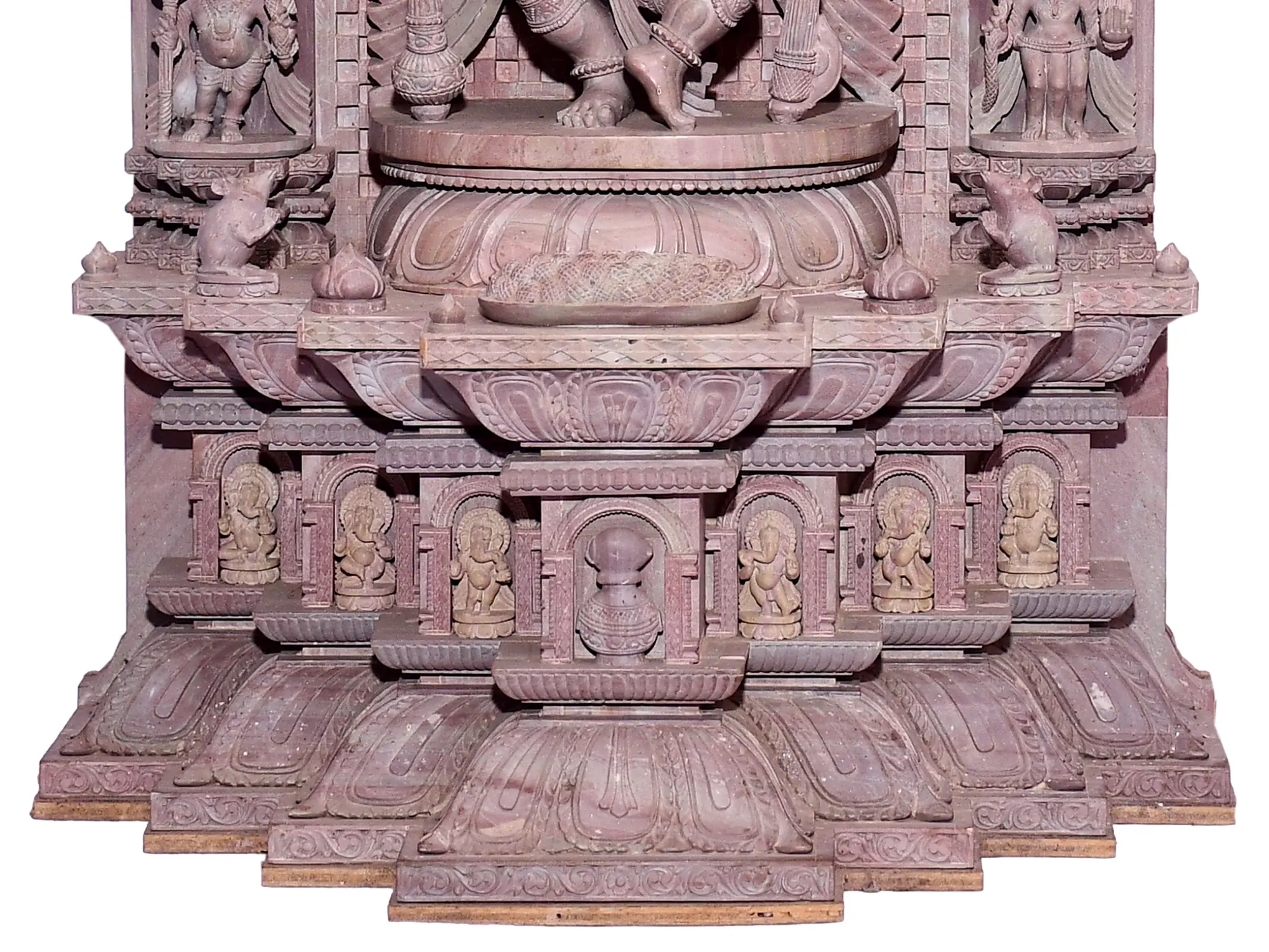 This masterpiece made out of Pinkstone draws inspiration from the temple architect of Central and Southern India. Ganesha dances in a curved stance of jubilation. In his Ashtabhuja form - Lambodara holds a Gada, Battleaxe, Pasa, Ankush, Broken tusk, and a bowl of Naivedyam (laddoos) as he bestows his guidance through Abhaya Mudra. His five heads represent the Panchabrahman, namely - Ishana, Tatpurusha, Aghora, Vamadeva, and Sadyojata. Above Ganesha in the center is Kirtimukha, accompanied by Gandharvas and Peacocks.