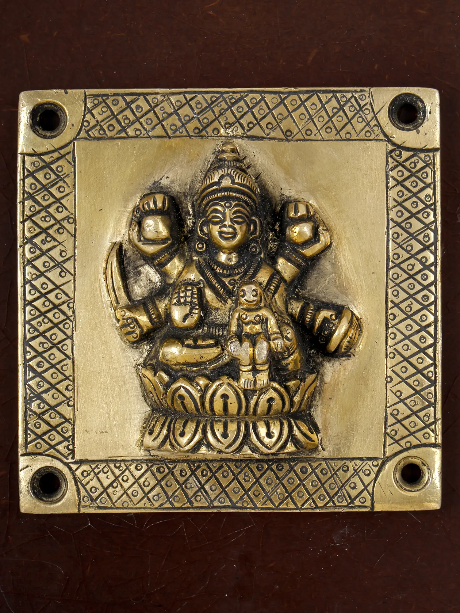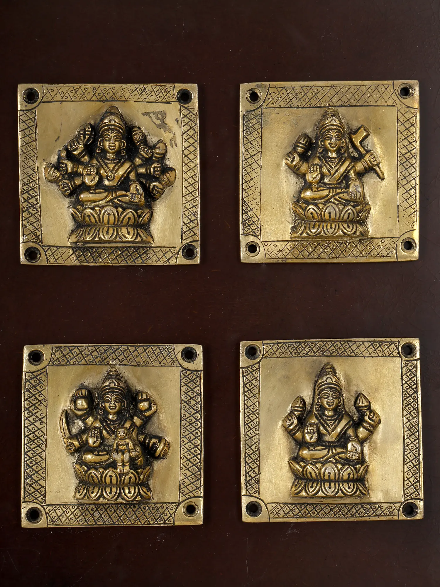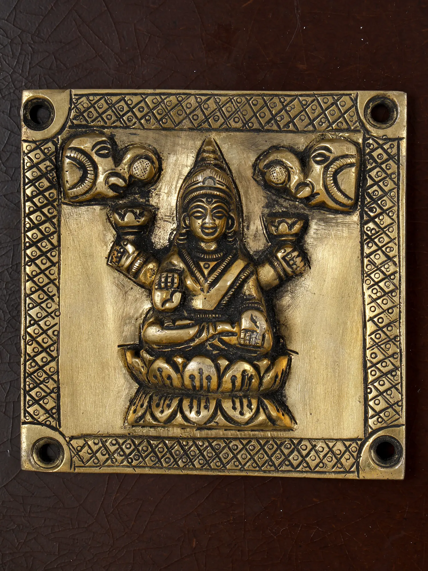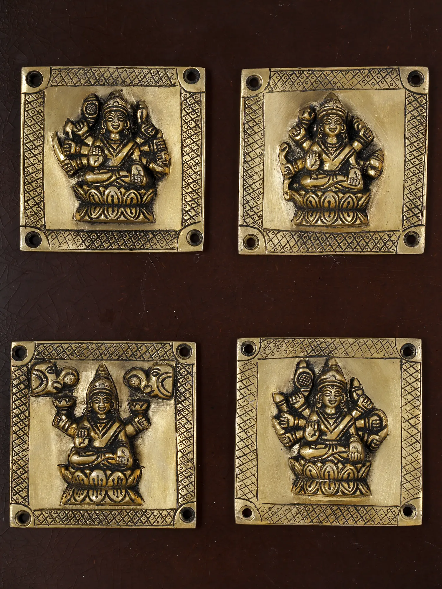 This wood and brass wall hanging frames the images of Ashtalakshmi, each goddess depicted with her distinct attributes, enthroned on lotuses.