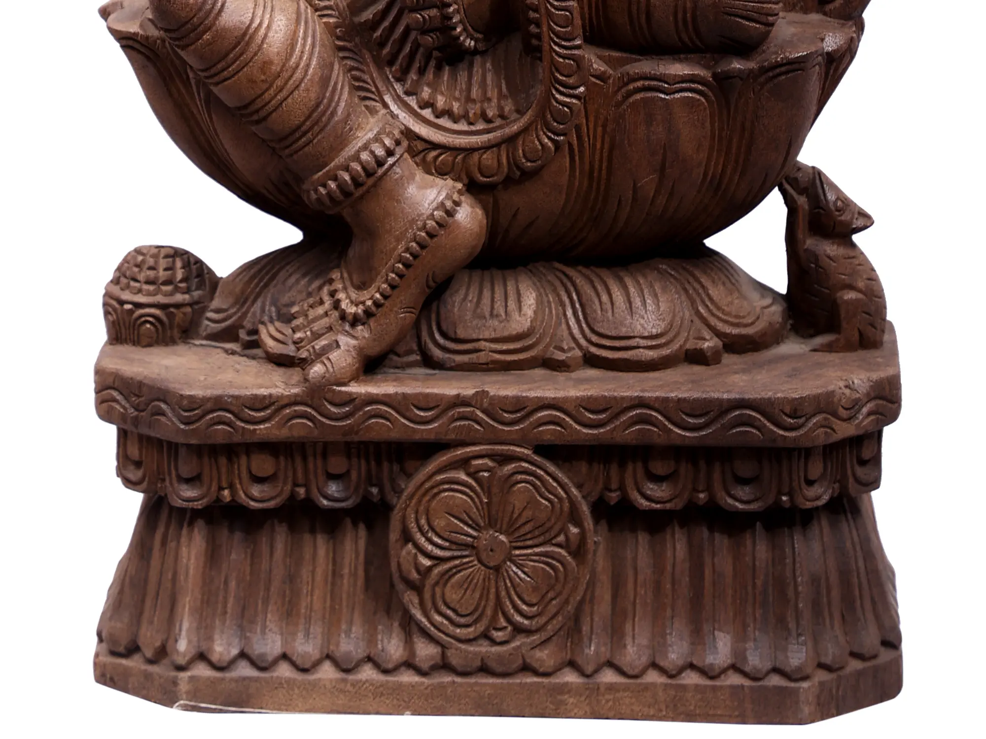 Ganesha carries a majestic aura, adorned with a crown and ornaments fit for supreme rulers. Ornamented by the Tripunda mark on his forehead and revered by his minuscule Mushaka, Ganesha in this wooden artwork is the supreme king of three realms, eternally guarding it with his fortunate presence.