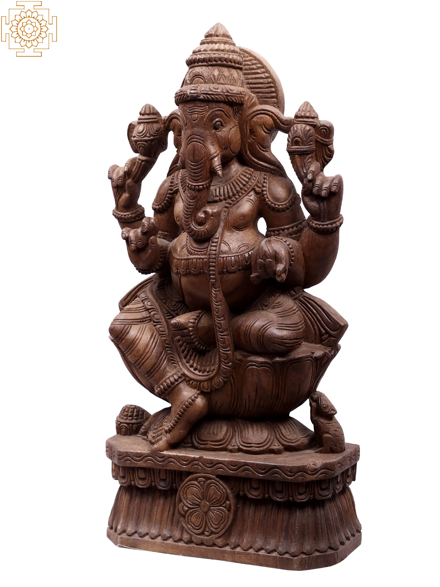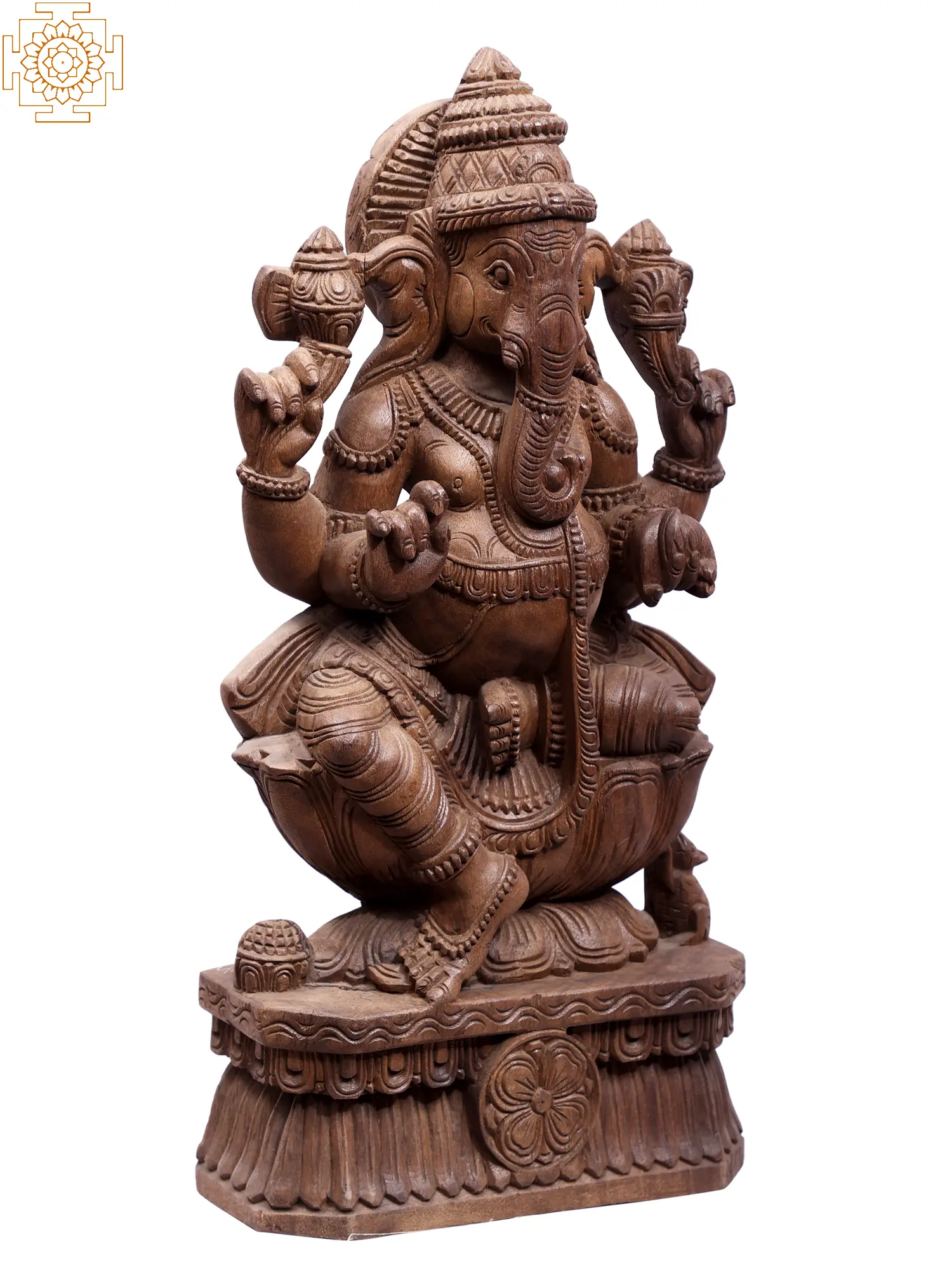 The elephant-faced child of Uma and Shiva, Sri Ganesha is the first-revered or Prathama-puja, whose presence in any space transforms it into a sacred and serene world. This splendid wooden statue of Lord Ganesha, where he appears in his Chaturbhuja or four-armed form, is a masterful representation of the deity, and a source of auspiciousness.