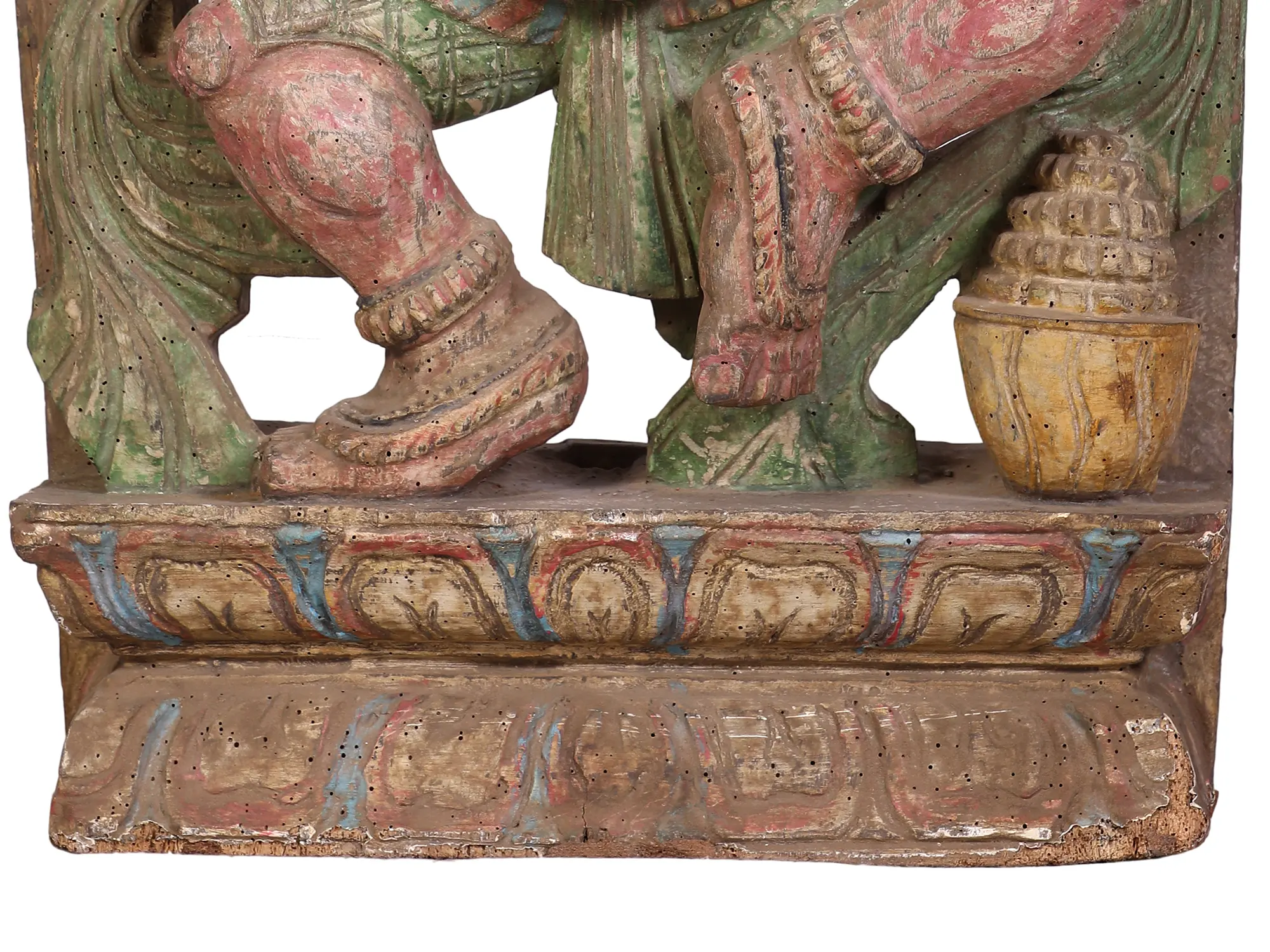 Embrace the vibrant energy and auspicious presence of Lord Ganesha with this exquisite hand-carved wooden masterpiece. Standing at an impressive height, this sculpture captures the beloved deity in a dynamic dancing pose, a powerful representation of cosmic movement and joyous celebration. The intricate detailing showcases the skill of the artisan, bringing to life the divine form with flowing lines and expressive features. The rich patina, achieved through time and traditional finishing techniques, lends a sense of age and profound spirituality to the carving. Hints of color – rosy reds, calming greens, and celestial blues – are subtly integrated, evoking the vibrant festivals and sacred rituals dedicated to Ganesha. Each stroke of the chisel has meticulously sculpted the elephantine head, the wise eyes, and the flowing garments, creating a piece that is both aesthetically captivating and spiritually resonant. The arched decorative frame behind Ganesha adds to the grandeur, reminiscent of temple architecture and the divine aura that surrounds him. The presence of his ever-loved modak (sweet dumpling) near his feet further grounds the divine figure in familiar iconography.