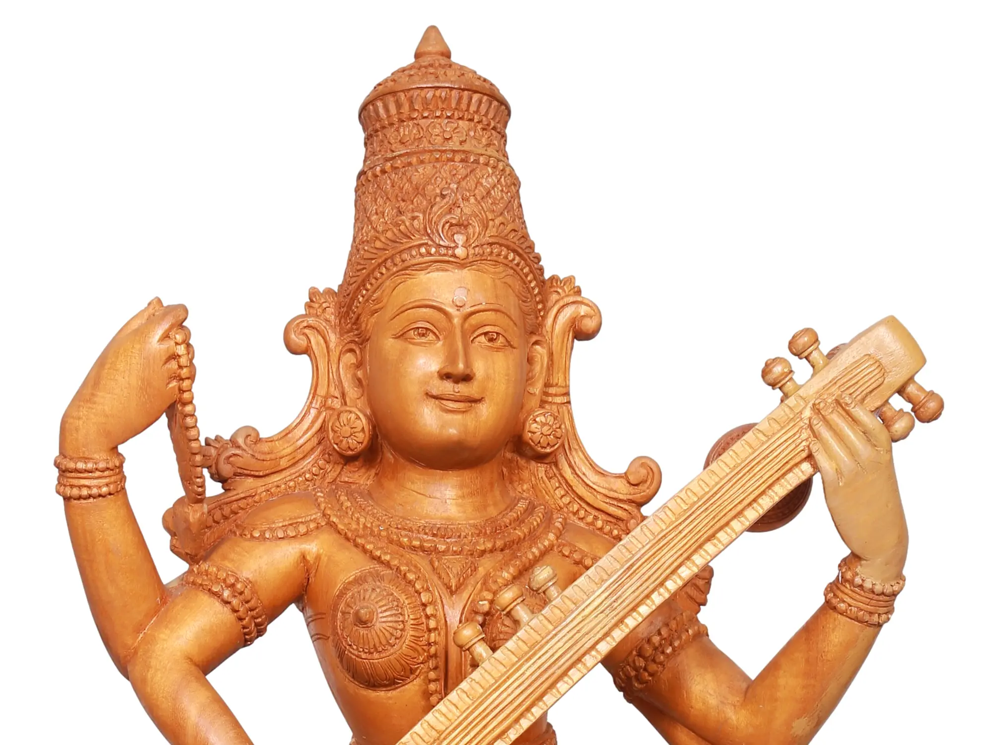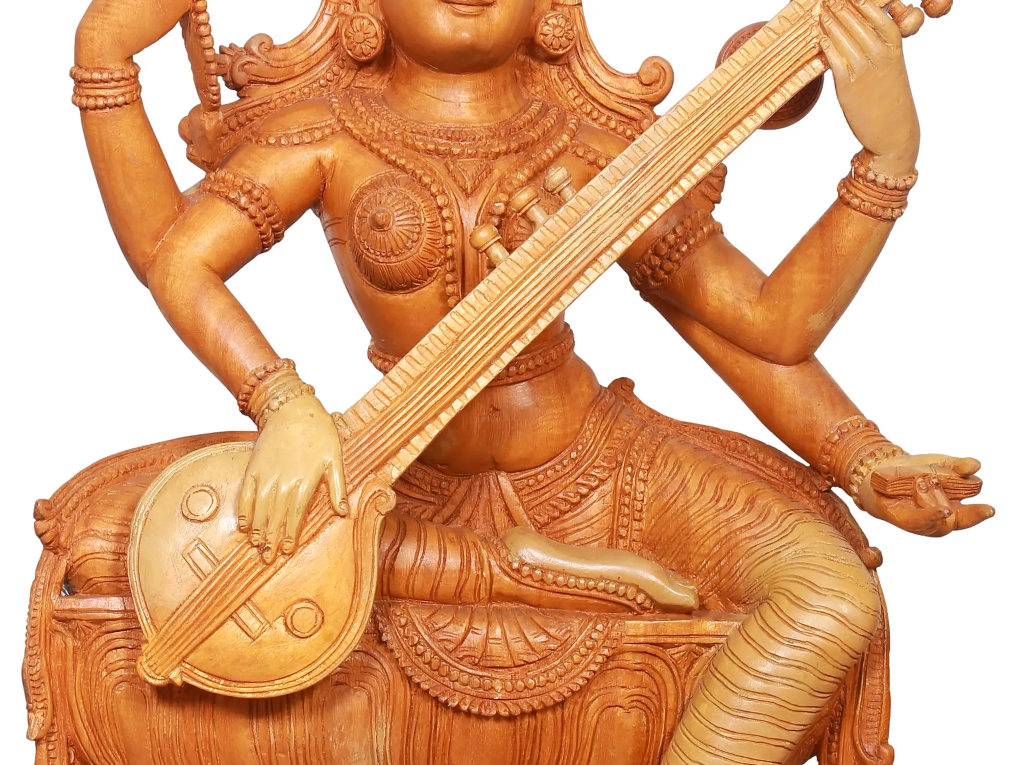 This intricately carved wooden sculpture depicts Devi Saraswati, the Hindu goddess of knowledge, music, and art, gracefully playing the veena, a traditional Indian musical instrument. Standing 24 inches tall, every detail of her form and attire is meticulously crafted. The artist's skill is evident in the fluid lines and delicate expressions, capturing Saraswati's divine essence. This sculpture holds great significance as it symbolizes the pursuit of knowledge and the arts. Placing it in a home or sacred space can inspire and invoke creativity, wisdom, and a deep connection with the divine feminine.