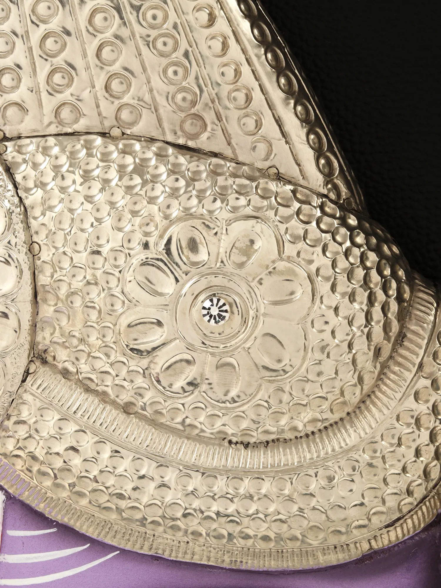 Shrinath Ji is particularly venerated in the Vaishnavism tradition, especially in the regions of Rajasthan and Gujarat. The story of Shrinath Ji's appearance as a seven-year-old boy lifting the Govardhan Hill to protect the cowherds and villagers from the wrath of Lord Indra is a central narrative in Hindu mythology. This image, with its serene expression and majestic adornments, reflects that powerful yet compassionate divinity. Such depictions are often found in temples and homes, serving as a focal point for devotion and a reminder of divine protection and love. The tradition of adorning deities with elaborate jewelry and headwear, as seen in this piece, speaks to a deep cultural reverence and artistic heritage.