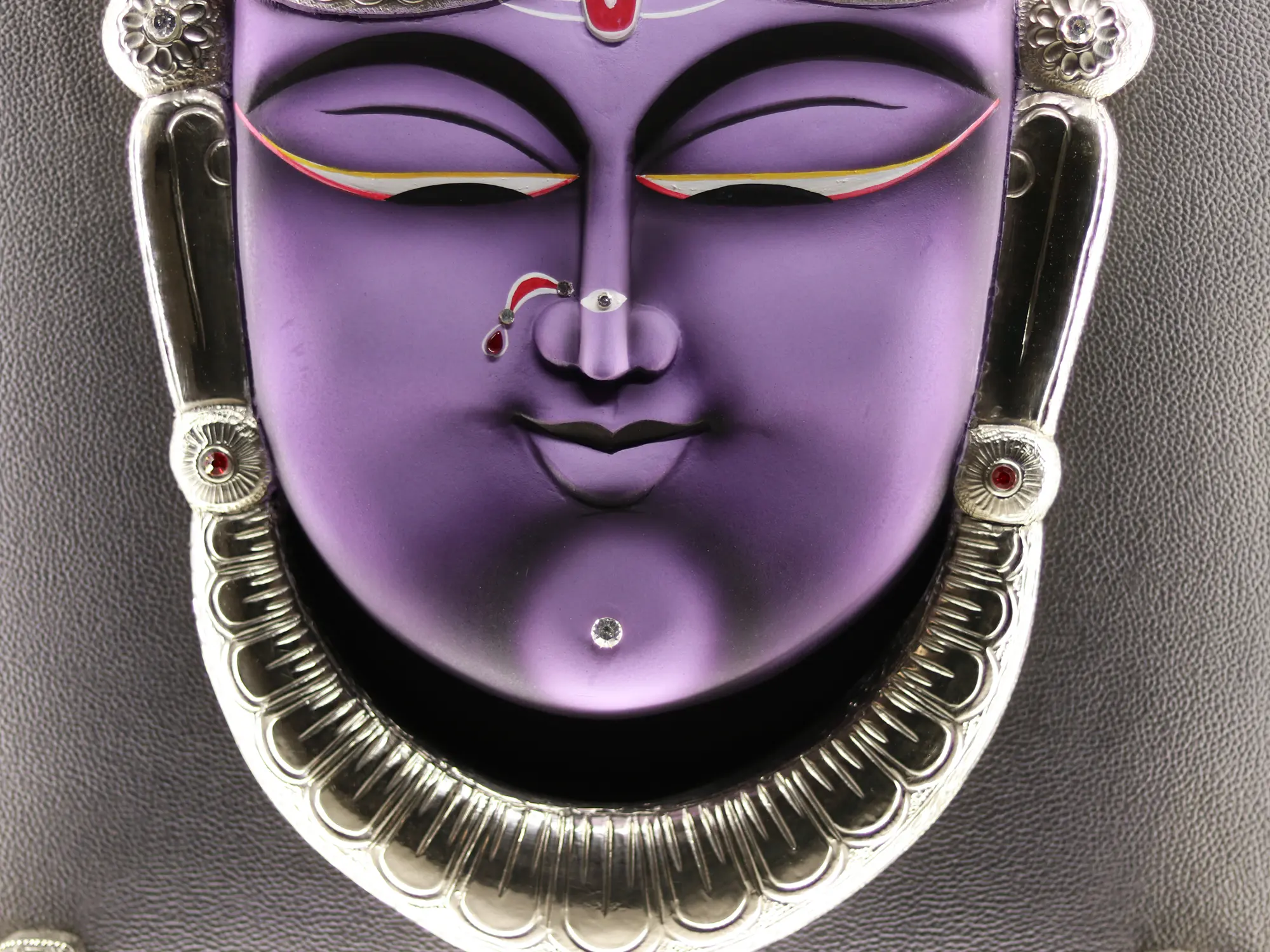 Invite the serene presence of Lord Krishna into your home with this exquisite wall hanging. Crafted with meticulous attention to detail, this piece captures the divine beauty of Shrinath Ji, a revered manifestation of Lord Krishna. The deep, tranquil purple of the deity's face is set against a rich black background, creating a striking contrast that draws the eye and evokes a sense of spiritual depth.