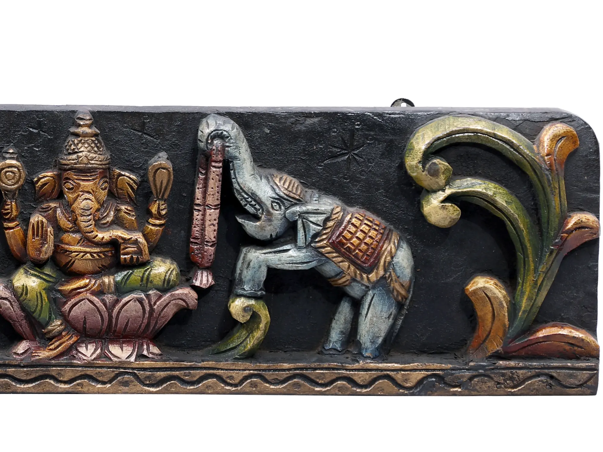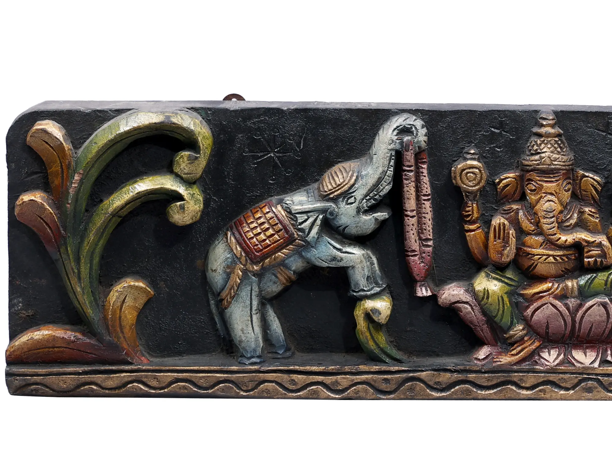 This wall panel is more than just a decorative item; it is a piece of art imbued with deep spiritual significance. The dark, textured background serves to highlight the vibrant, hand-painted colors of the figures and the ornate floral motifs that frame the scene. The rich hues of gold, green, and red applied with skillful precision bring depth and vibrancy to the carved wood. The decorative border at the base, with its wave-like pattern, adds an elegant finishing touch. Each element is thoughtfully designed to create a harmonious and captivating composition, reflecting the dedication and artistry of the craftsman.