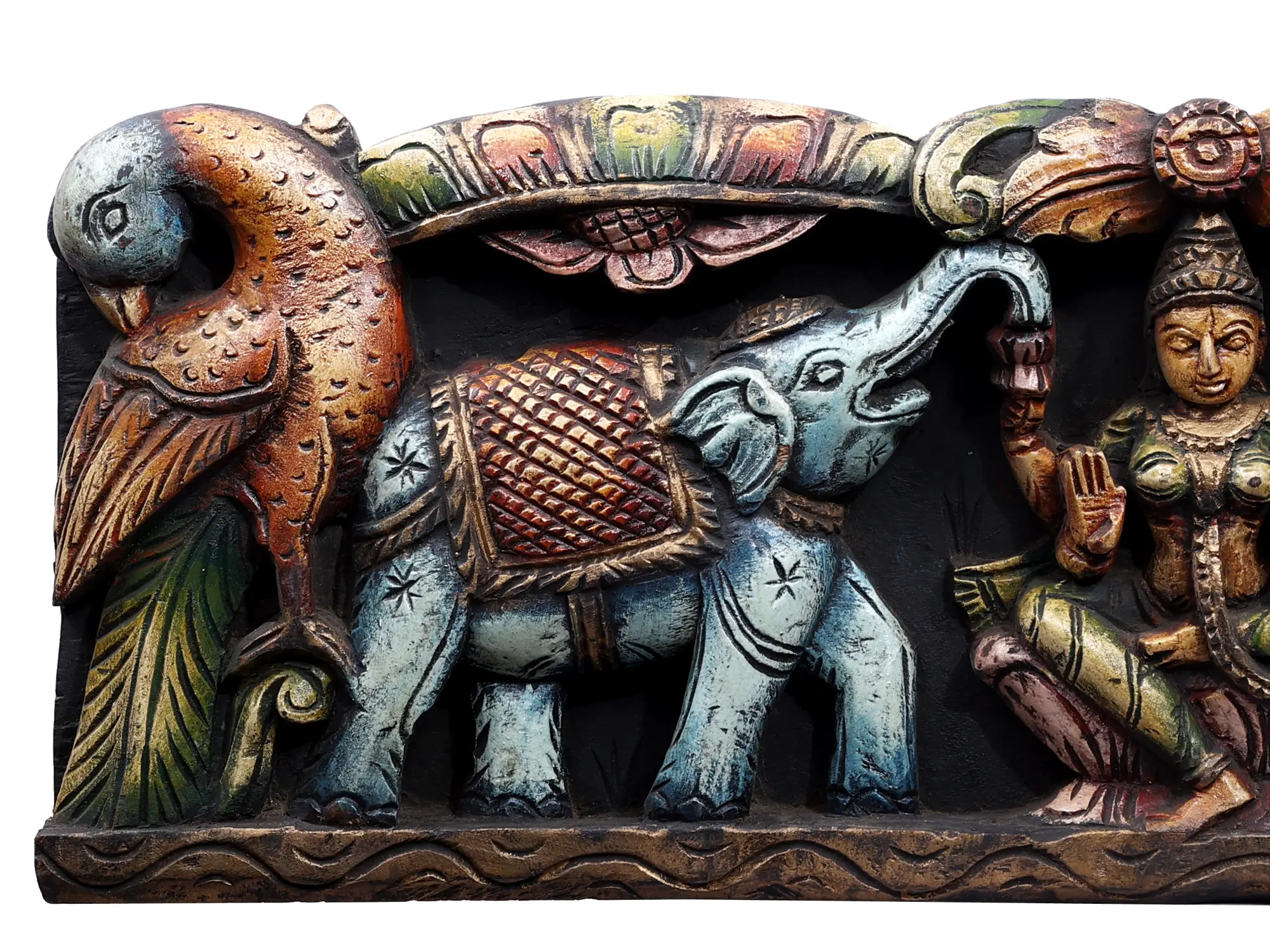 This exquisite wooden wall panel is a captivating depiction of Gaja Lakshmi, a benevolent form of the goddess Lakshmi, the deity of wealth, prosperity, and good fortune. The intricate carvings showcase a scene steeped in rich mythology and cultural symbolism, making it a powerful statement piece for any home or sacred space. The central figure is Goddess Lakshmi, seated gracefully on a lotus flower. Her four hands are raised, bestowing blessings and dispelling fears, a gesture of protection and grace. She is adorned with traditional jewelry, her serene countenance radiating divine compassion. The lotus, a symbol of purity, beauty, and spiritual awakening, signifies her divine origin and her role in nurturing life and abundance. Flanking the goddess are two majestic elephants, their trunks raised in a gesture of greeting and showering of blessings. In Hindu tradition, elephants are revered as symbols of strength, wisdom, and royalty. The story of Gaja Lakshmi itself is deeply rooted in the Puranas, where it is said that during a great drought, Lakshmi appeared to the distressed sages and kings, raining down gold and prosperity from the heavens. The elephants, often associated with rain and abundance (as they are believed to control the clouds), are fitting companions to the goddess who brings forth such blessings. The ornate coverings on their backs further emphasize their regal bearing. To the outer edges of the panel, two vibrantly colored peacocks add another layer of auspicious symbolism. The peacock is the vahana (mount) of Goddess Saraswati, the deity of knowledge and arts, and is also considered a harbinger of good luck and prosperity. Its iridescent feathers are said to represent a multitude of blessings. The inclusion of peacocks alongside Gaja Lakshmi amplifies the overall message of good fortune, abundance, and auspicious beginnings.