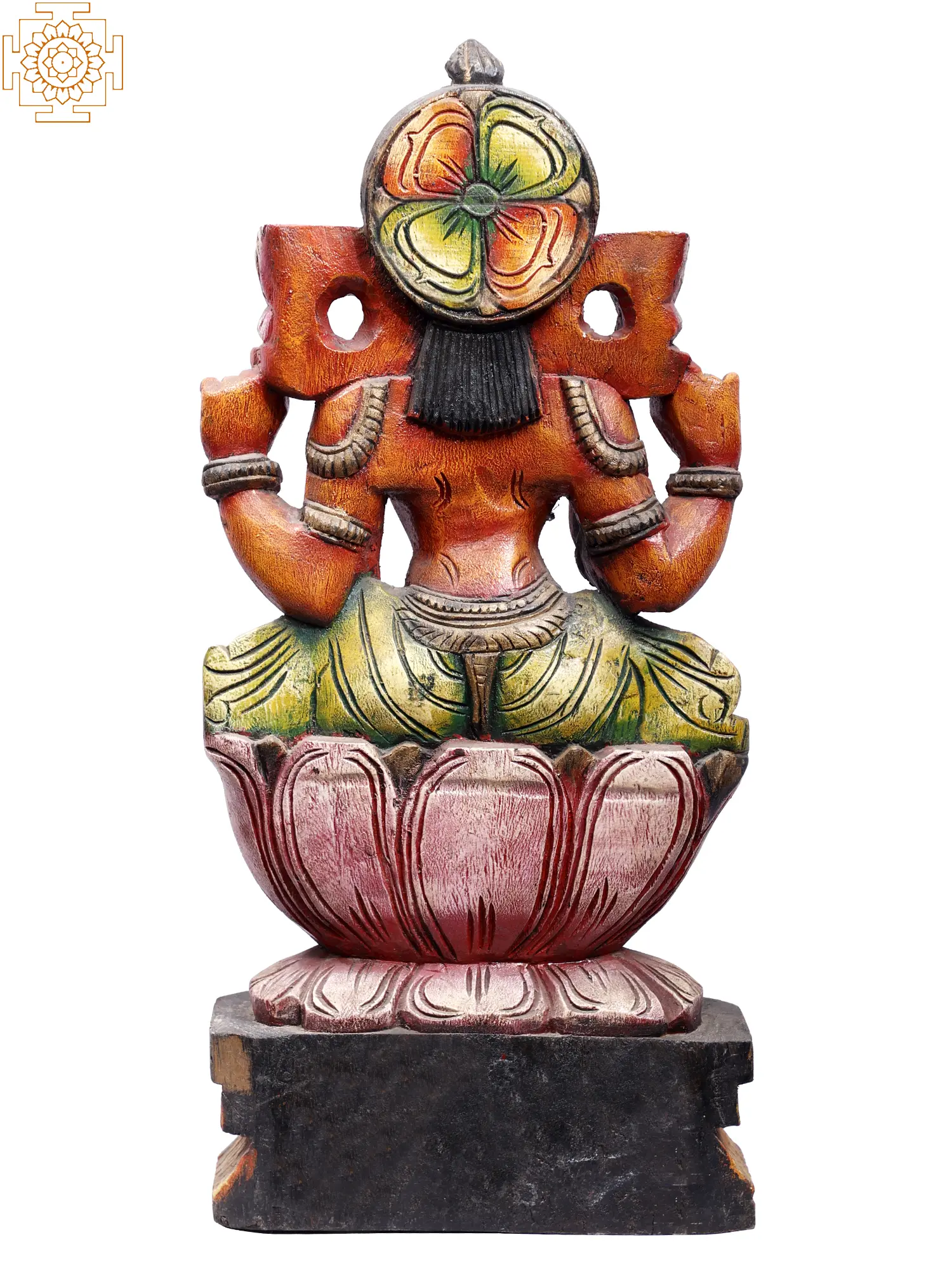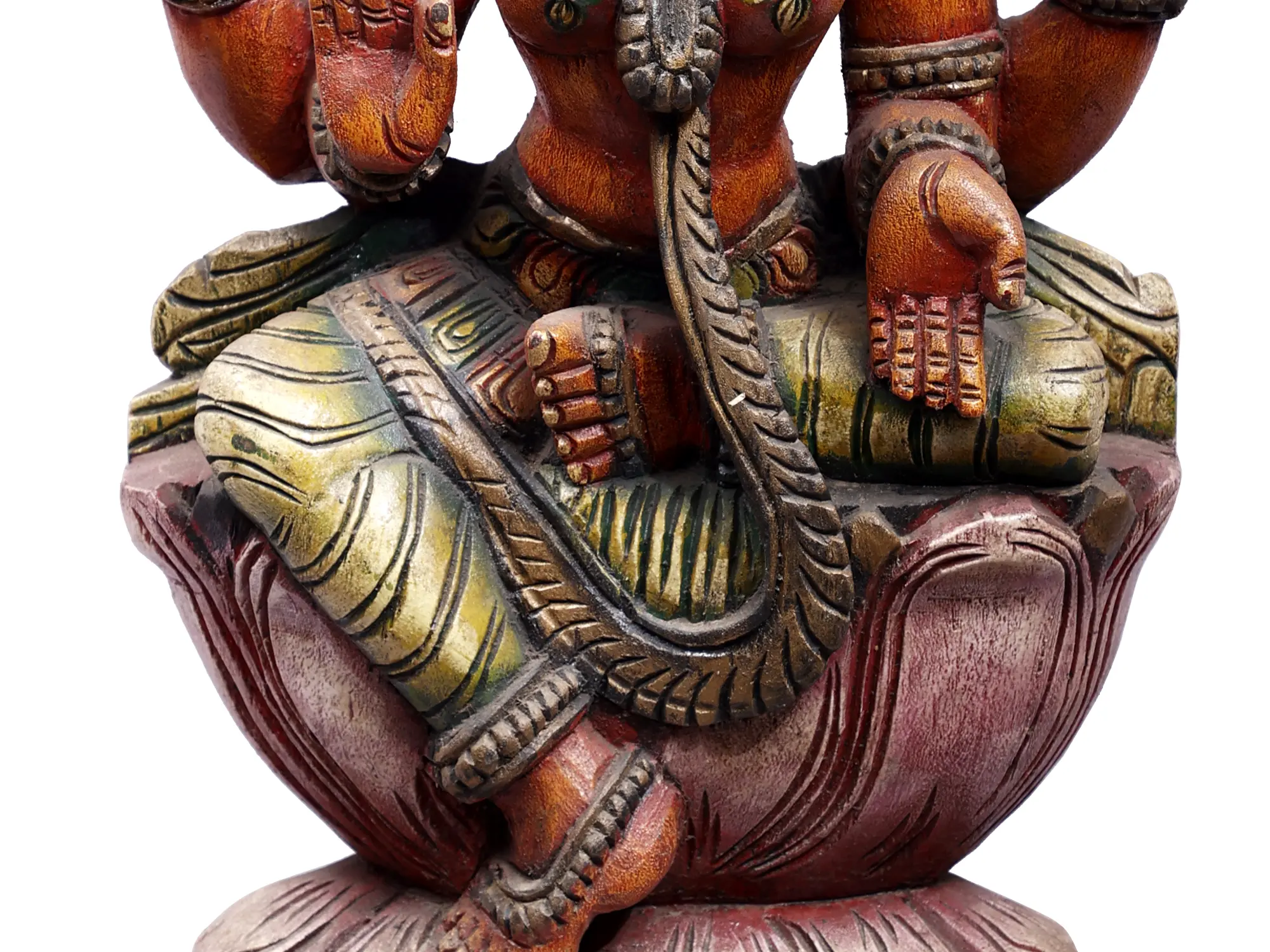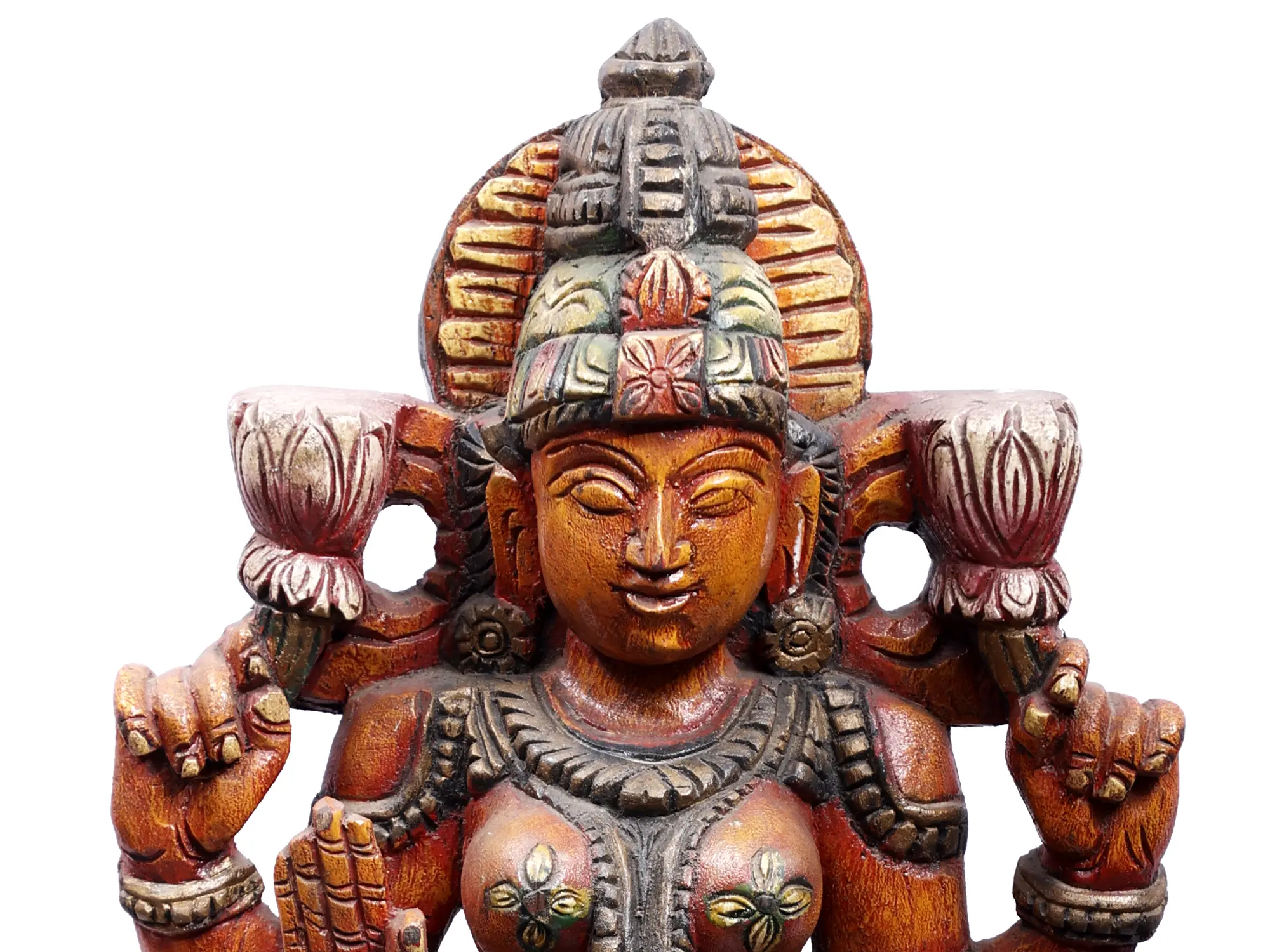Goddess Lakshmi, the queen of Vaikuntha and the supreme mother whose powers run the three realms is an auspicious image in Hindu art. This wooden statue of Devi Lakshmi captures her popular iconography with an aesthetic richness. The four-armed Devi sits on a lotus or Padma, adorned marvelously. She holds two lotuses, symbols of the origin of the Universe, and has her primary hands in the gesture of giving boons and dispelling fear. A finesse in carving is displayed in this wooden artwork, which is embellished with fine polish and beautiful colors, bringing the heavenliness of Lakshmi to earth.