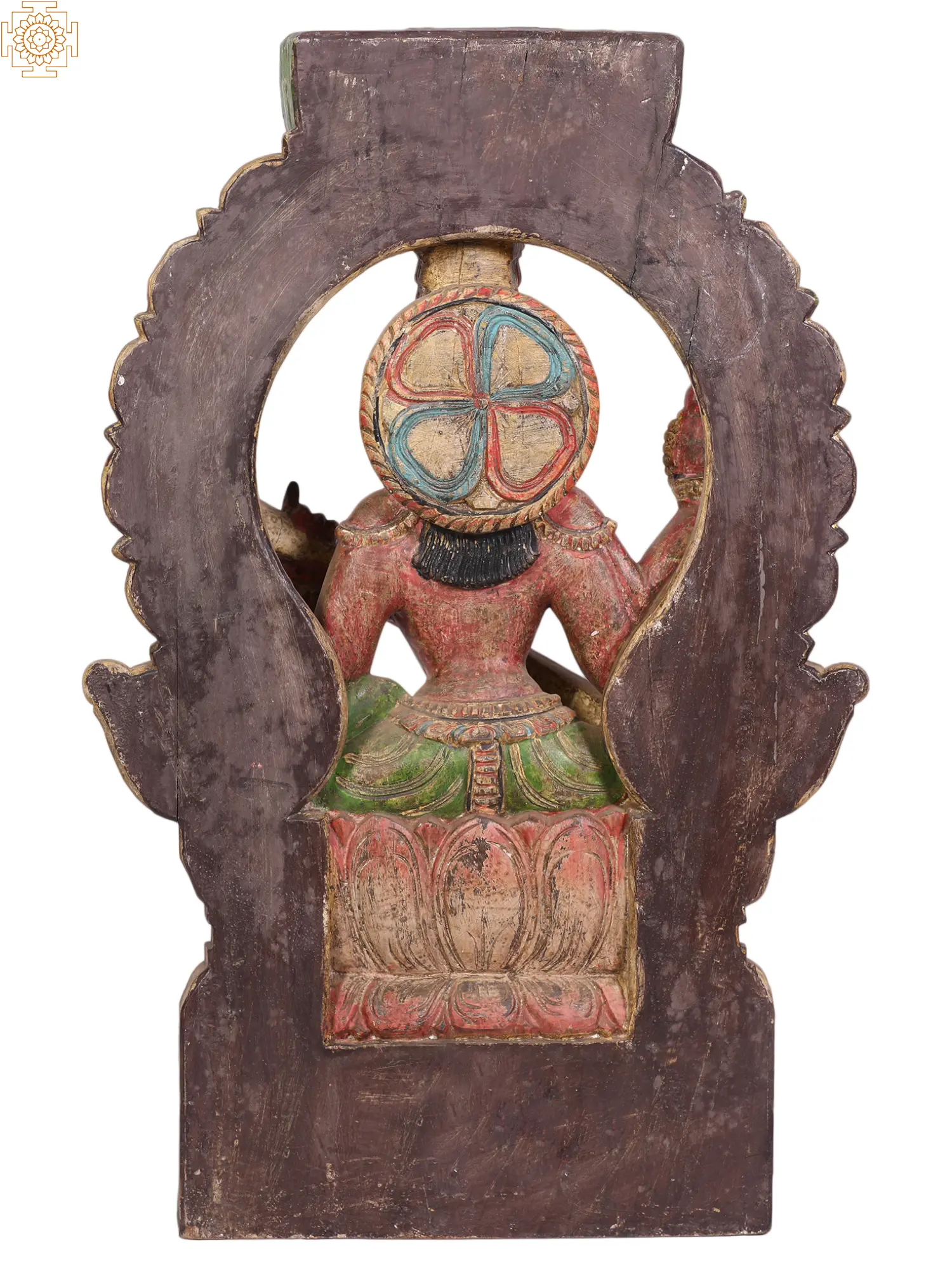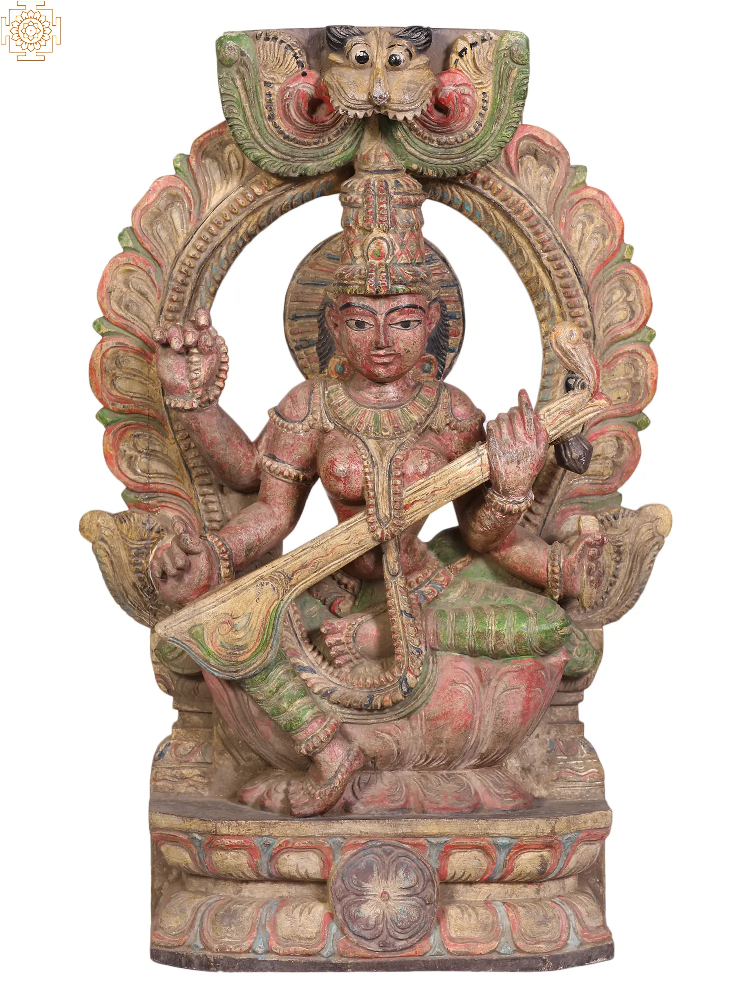 The ancient sculptors paid tribute to the great mother goddess, the source of their inspiration and expertise, by carving symbols of the goddess Saraswati on the walls of the sanctums they built. This wooden statue evokes the essence of Devi Saraswati, drawing inspiration from the same temple artworks. The lotus pedestal, pillars between the two, and Kirtimukha aureole, which are the secondary features of the statue, all exude beauty.
