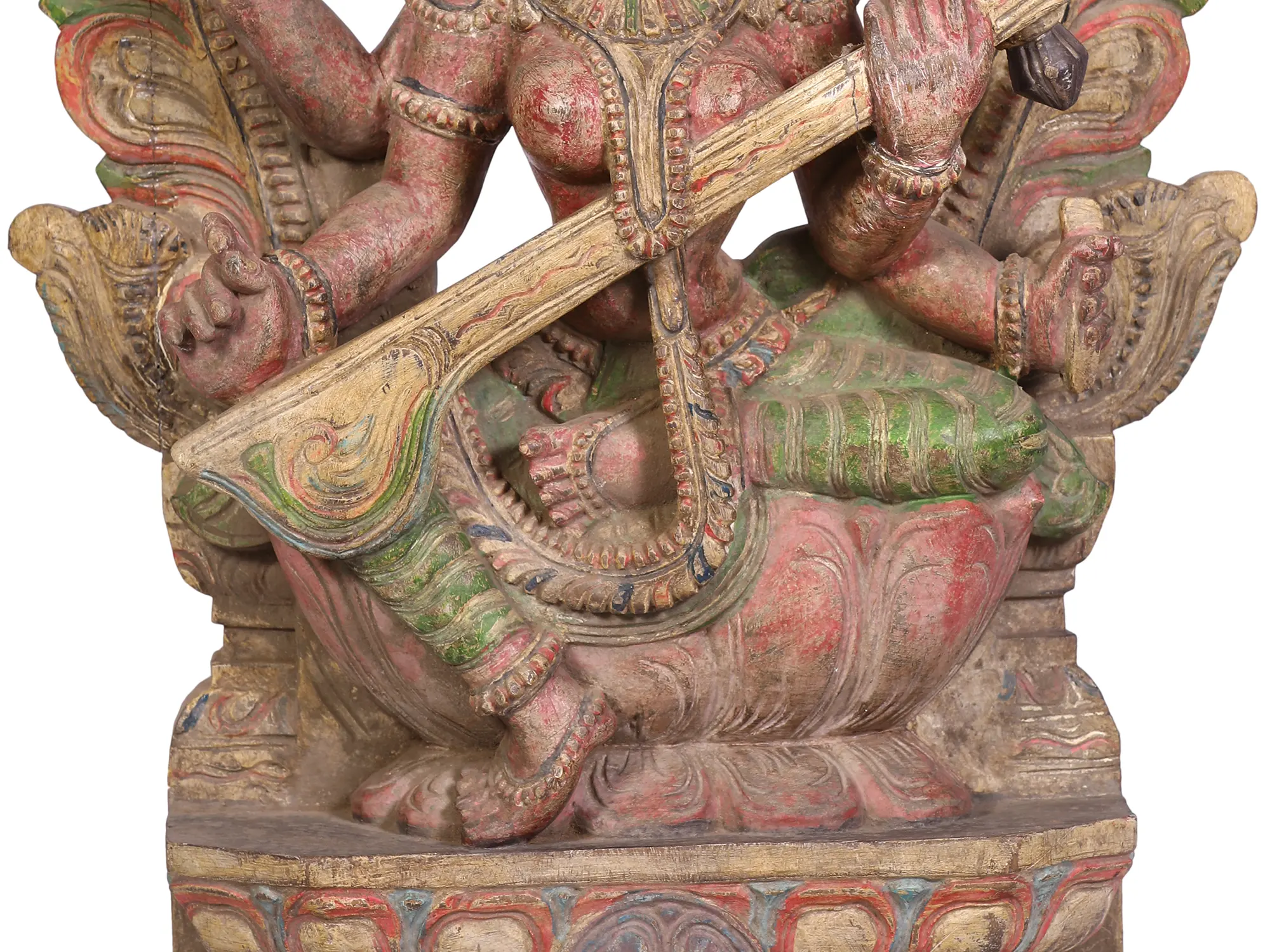 Padmasana Devi Saraswati sitting on a lotus or Padma throne decked out like a queen. In Indian art, the sign of Makara, which she is carrying, denotes divinity and majesty. The Shakti or energy of Saraswati is expressed by the lovely red hue of her skin, which becomes exquisitely embellished with a multitude of soft colors, infusing in wood the presence of Veenavadini.