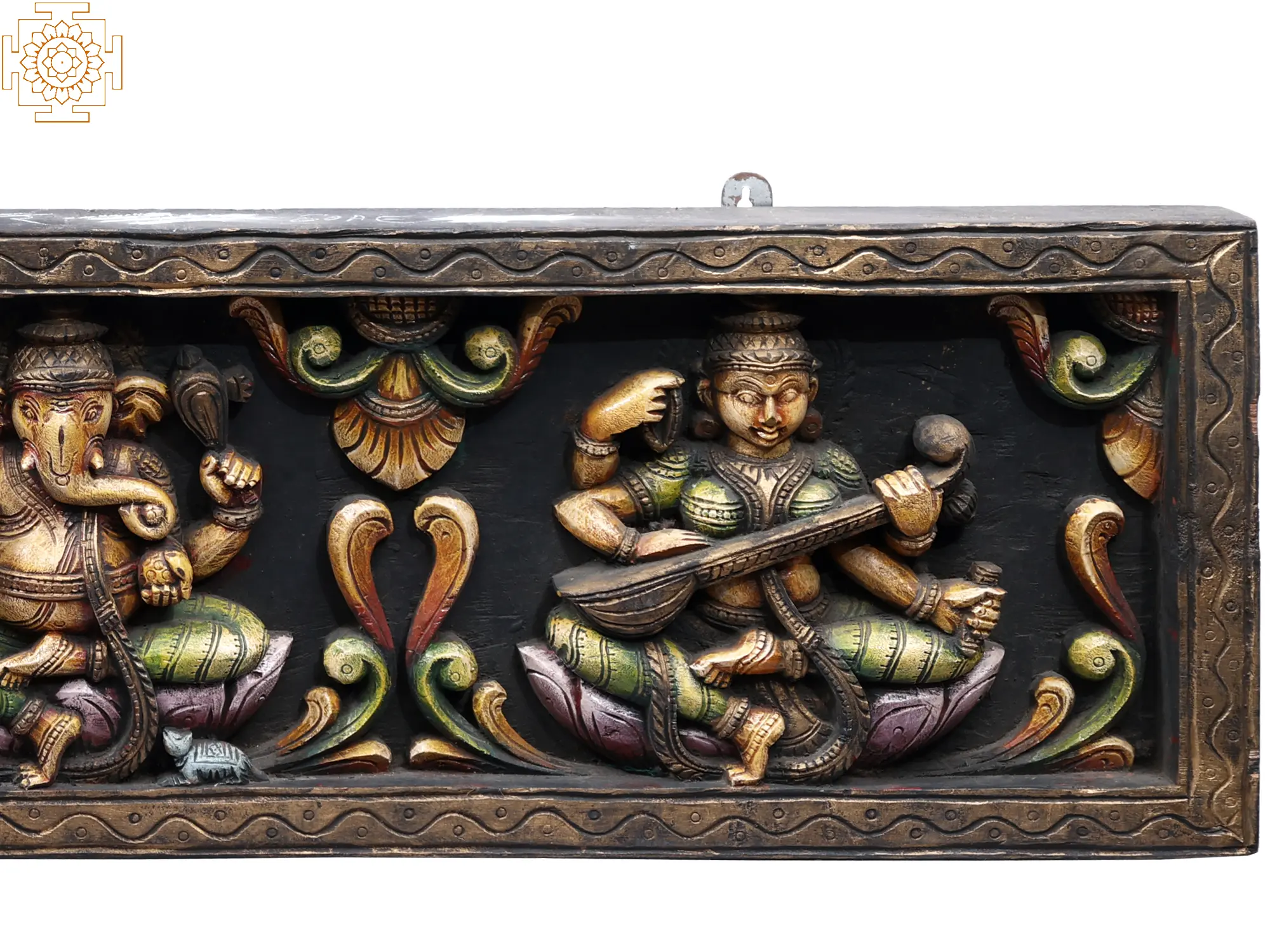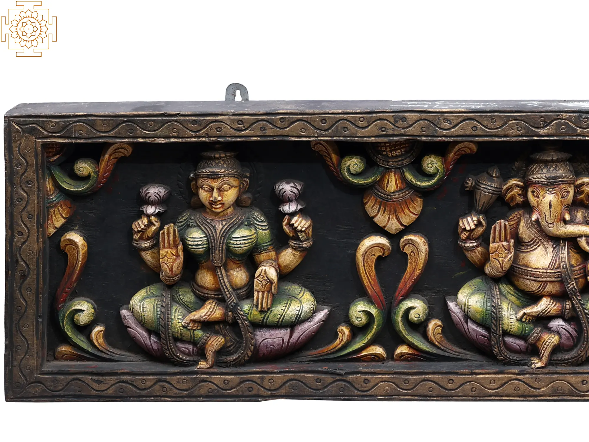 This exquisite wooden wall panel is a masterpiece of traditional Indian artistry, meticulously carved to depict three of the most revered deities in Hinduism: Goddess Lakshmi, Lord Ganesh, and Goddess Saraswati. Each figure is seated gracefully upon a blooming lotus, a symbol of purity, enlightenment, and spiritual awakening. The intricate details of their divine forms, the rich textures of the wood, and the vibrant yet harmonious color palette come together to create a truly captivating piece that radiates an aura of peace and prosperity. The panel is framed by a border of ornate carvings, adding to its regal presence and making it a statement piece for any home or sacred space. The dark, rich background makes the golden hues of the deities and the subtle splashes of color truly pop, drawing the viewer’s eye to the divine figures. This piece is more than just a decoration; it is a conduit to the divine, inviting blessings of wealth, wisdom, and auspicious beginnings into your life.