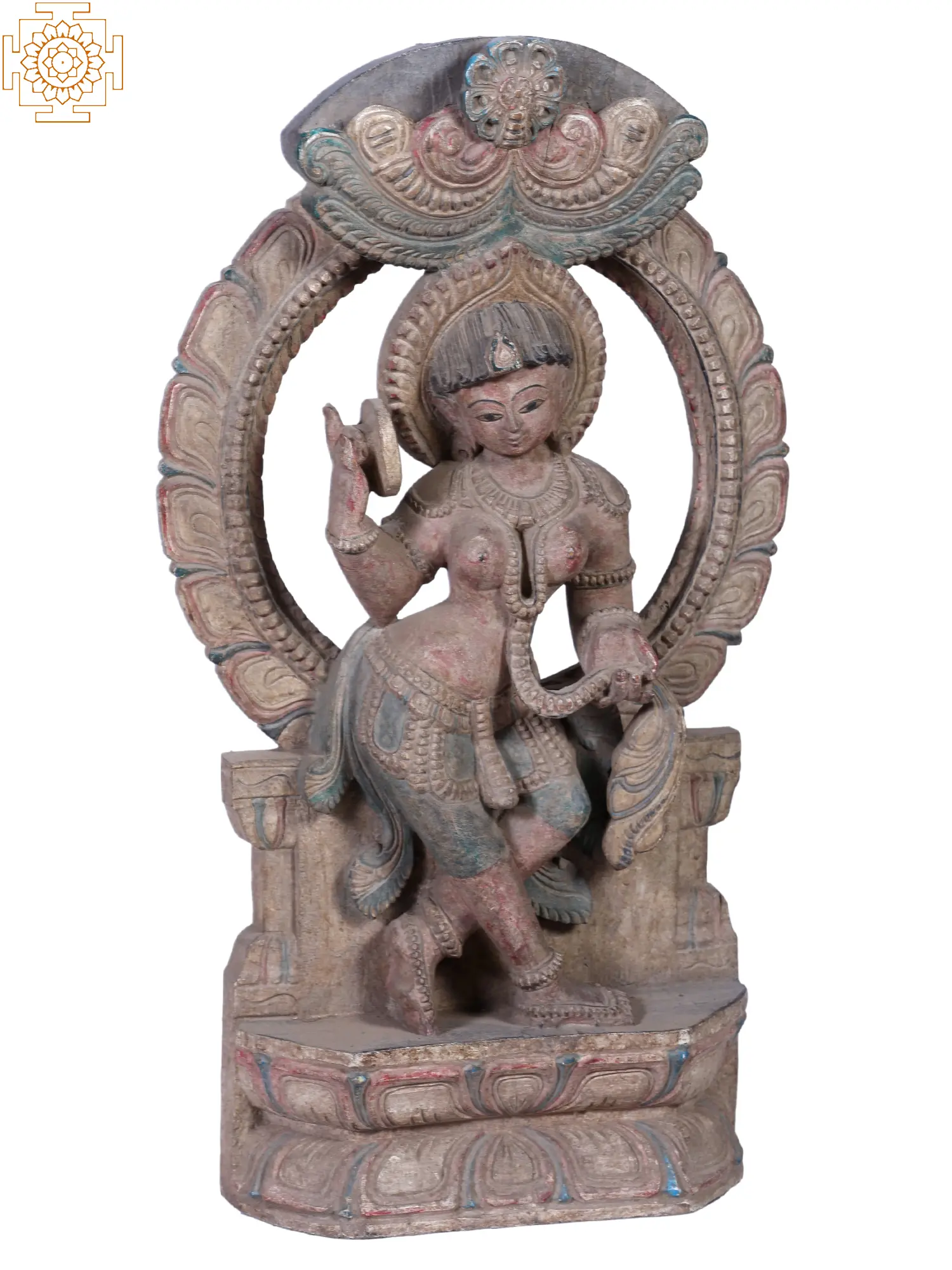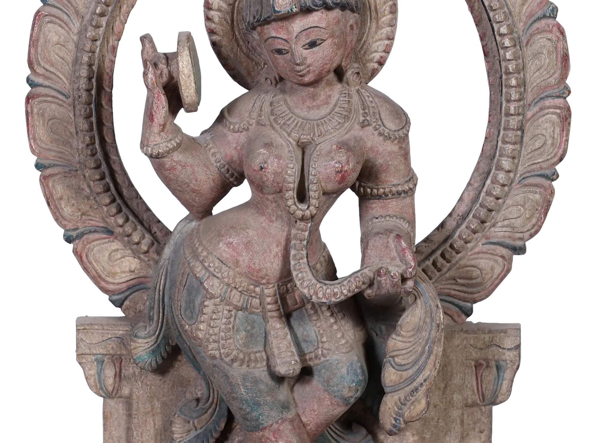 This exquisite wooden sculpture captures the essence of celestial beauty and divine artistry, presenting a captivating figure that transcends mere representation to embody a spirit of grace and movement. Carved with meticulous detail from rich wood, this piece evokes the transcendent beings that inhabit the heavens in Indian mythology, inviting viewers into a realm of timeless elegance. The central figure, reminiscent of an Apsara, the celestial nymphs of Hindu and Buddhist mythology, is depicted in a dynamic pose. Apsaras are known for their unparalleled beauty, grace, and their role in entertaining the gods in their heavenly abode. They are often associated with arts, music, and dance, and their presence signifies auspiciousness and divine favor. This sculpture, with its fluid lines and expressive posture, seems to embody the very spirit of these heavenly dancers, caught in a moment of ethereal performance. The intricate prabhavali, or halo, that frames the figure serves to amplify its divine aura. This decorative arch, often seen behind deities and significant figures in Indian art, symbolizes the cosmic energy and radiance emanating from the divine. The detailed carvings within the prabhavali suggest a celestial garden or a cosmic expanse, further enhancing the otherworldly nature of the piece. The delicate painting, though aged, hints at vibrant colors that once adorned this sacred representation, adding to its antique charm and historical depth. The craftsmanship displayed in this sculpture speaks to a tradition of artistry honed over centuries. The carving of the garments, the jewelry, the facial features, and the very posture of the figure reveal a profound understanding of both form and emotion. Each element is rendered with a sensitive hand, from the subtle curve of the body to the delicate ornamentation. The artist has managed to imbue the wood with a sense of life, making the static material appear to sway and dance. This piece is more than just a decorative item; it is a connection to a rich cultural heritage, a tangible piece of spiritual art that can bring a sense of peace, beauty, and divine presence to any space. Whether displayed in a serene living room, a meditative sanctuary, or an art collector's prized display, this wooden lady with her celestial halo is sure to captivate and inspire.