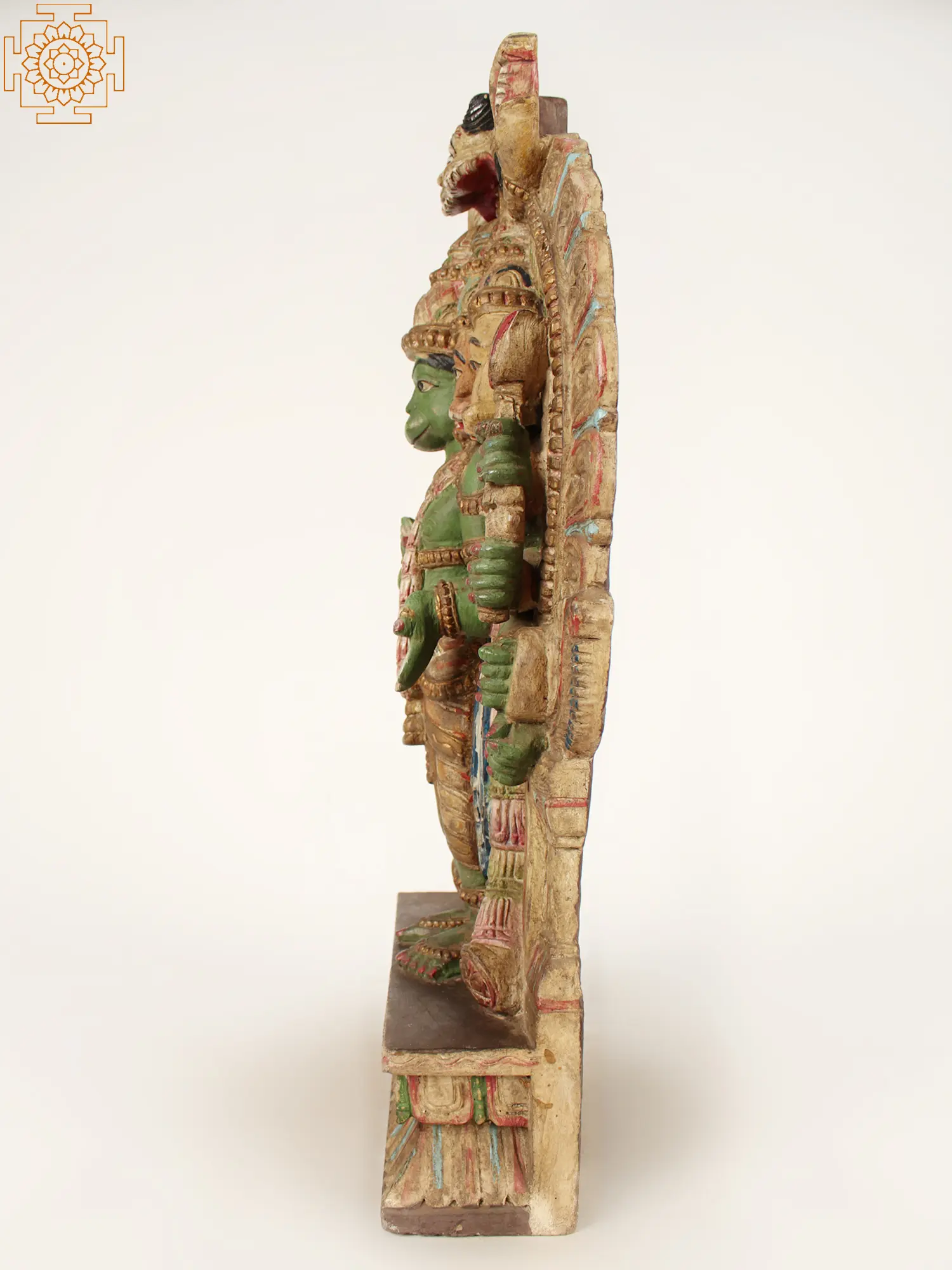 Hayagriva Mukha (horse face) - This divine face bestows knowledge, wisdom, and eloquence. This intricately carved panel showcases Hanuman with multiple arms, each holding various divine attributes and weapons, further emphasizing his multifaceted powers. The central figure, with its striking green hue, is adorned with traditional ornaments and a garland, reflecting his divine status. The Kirtimukha, a decorative architectural motif often found in Hindu art, graces the apex of the panel, symbolizing glory and protection. The detailed carving and vibrant, yet aged, colors evoke a sense of timeless spirituality and artistic mastery. –––––––––––––––––––