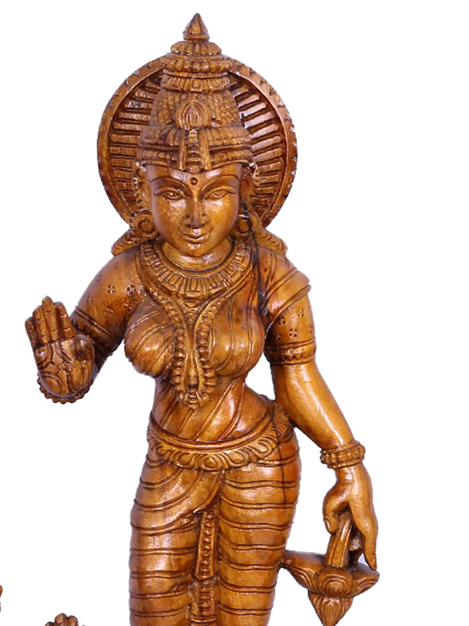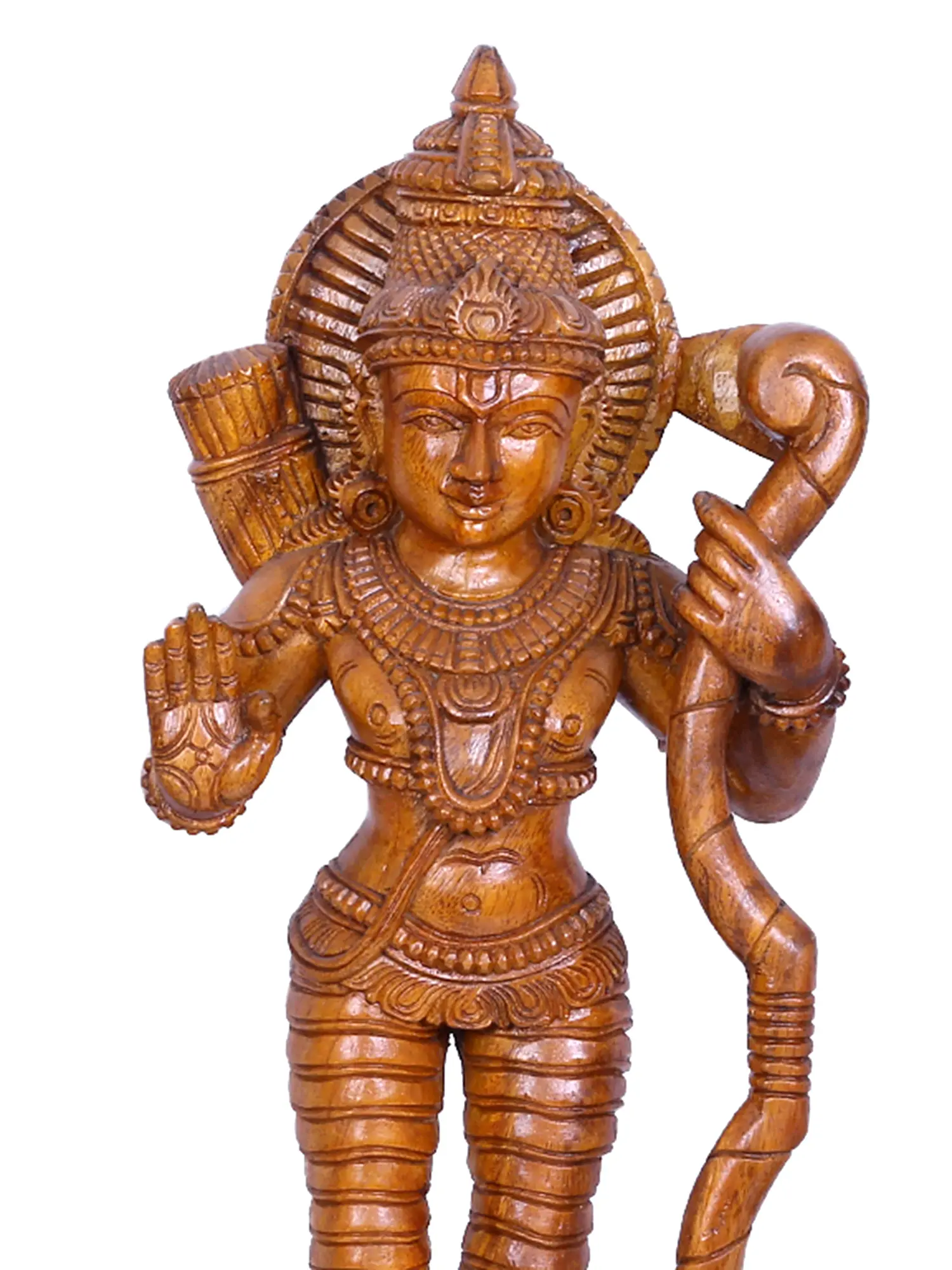 Placing his Dhanusha or bow on his pedestal, Rama raises his hand in Abhaya or the gesture of fearlessness, telling his subjects to get rid of fear and welcome auspiciousness along with their rightful king. Lakshmana like a devoted brother follows the posture and mood of his brother, and Devi Sita, who is Lakshmi on Earth, adorned in queenly attire and holding a lotus accompanies her beloved. Refined lines and a seamless polish add to the beauty of the subject of this wooden artwork, making this a masterpiece of celebration of Rama’s return to Ayodhya.