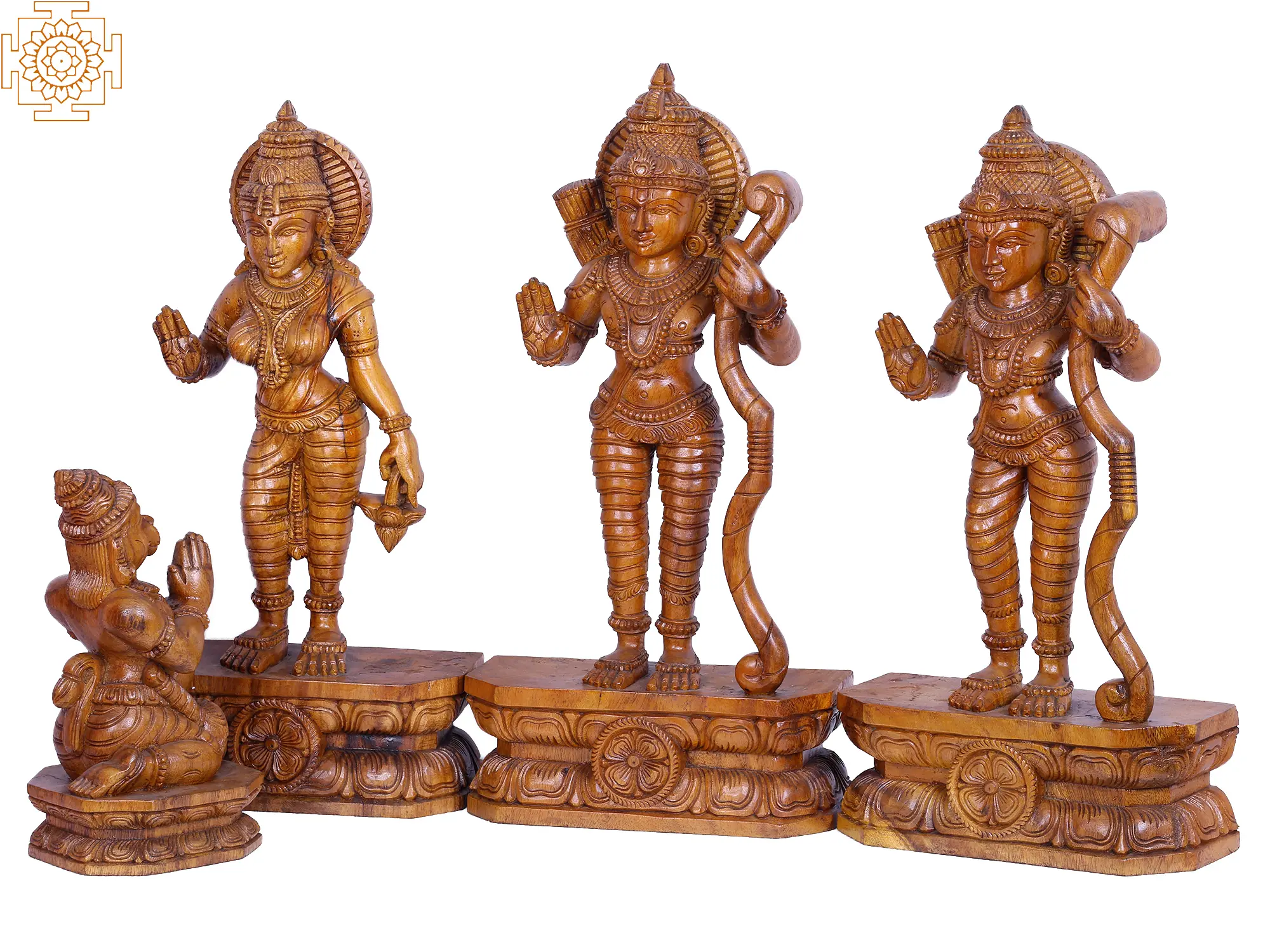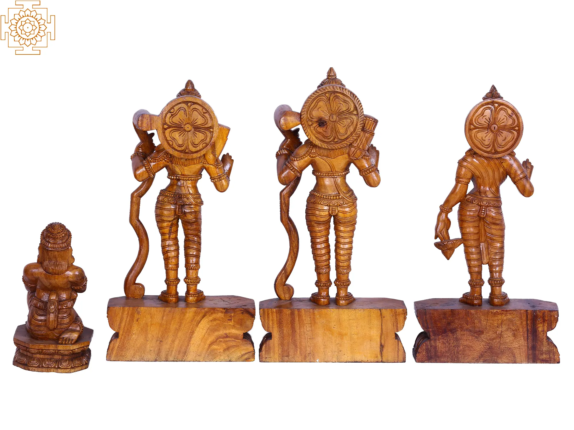 In Hindu art, Ram Darbar—the scene following Sri Rama's return to Ayodhya and his coronation—celebrates Dharma's triumph. Lord Hanuman, accompanied by his loyal companion Sita, brothers, and all the wealth and prosperity of the universe, is a representation of the ultimate ruler. This wooden composition is a divine representation of Sri Rama's court, or Darbar, with Lord Hanuman in the gesture of devotion known as Anjali mudra and Rama, Lakshmana, and Devi Sita on separate pedestals.