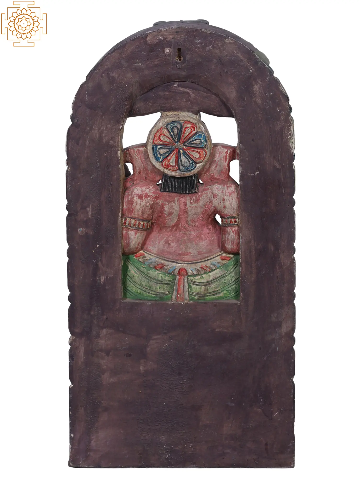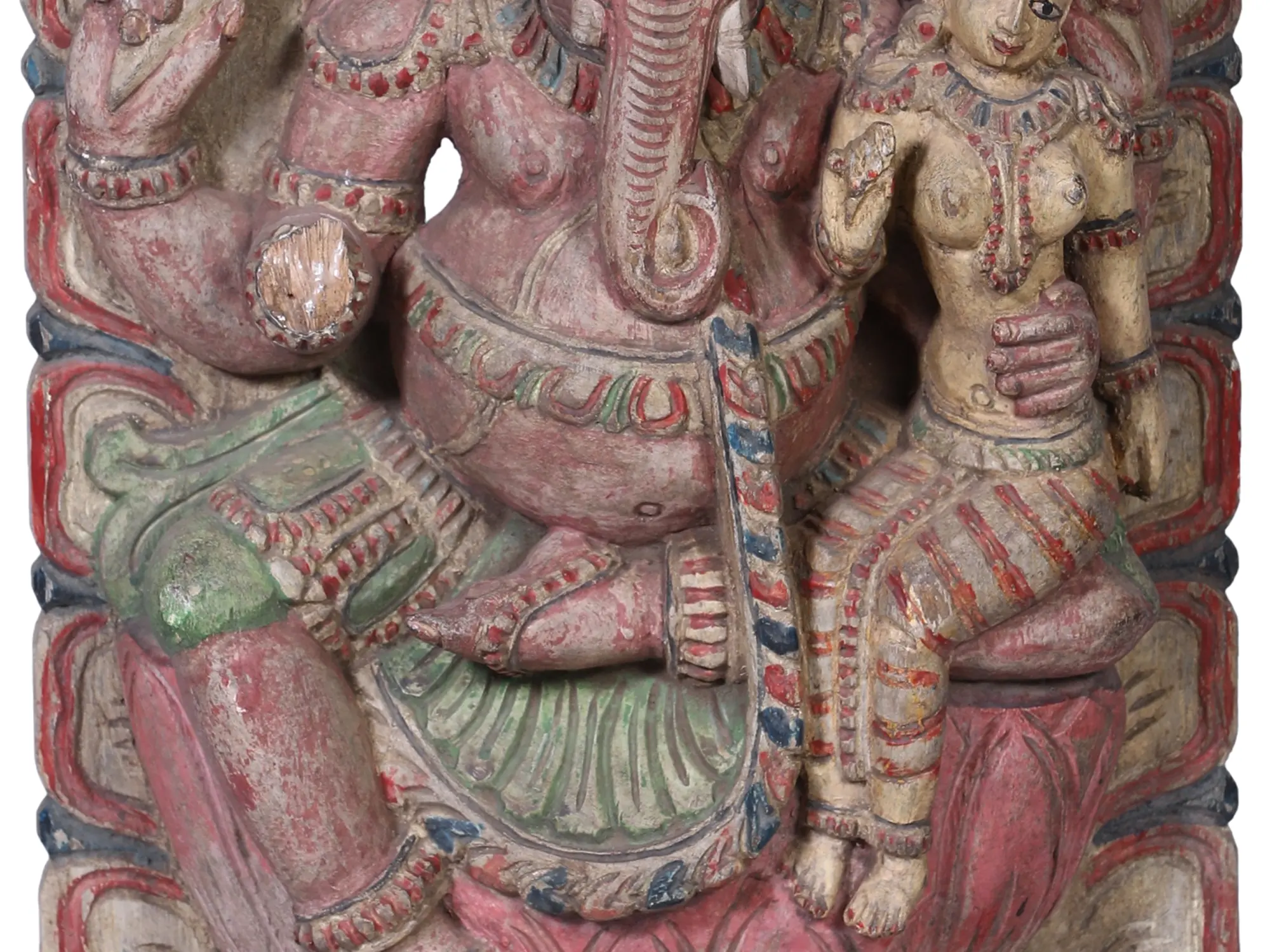 In the heart of a sacred wooden sanctuary, “Shakti Ganapati” reigns on a Kirtimukha throne, a symbol of unparalleled majesty. Seated with his radiant consort, “Shakti Devi”, nestled on his left lap, they embody an eternal union of power and grace. His hand, adorned with jewels, wields a symbolic goad, gently guiding souls on their spiritual journey. The right hand, raised in the “Abhaya Mudra”, reassures devotees, offering refuge from life’s tempests. A majestic crown graces his noble head, accentuating his regal aura. With grand ears, a graceful trunk, and a generous belly, Shakti Ganpati symbolises boundless abundance, protection, and the blissful synthesis of masculine and feminine energies.