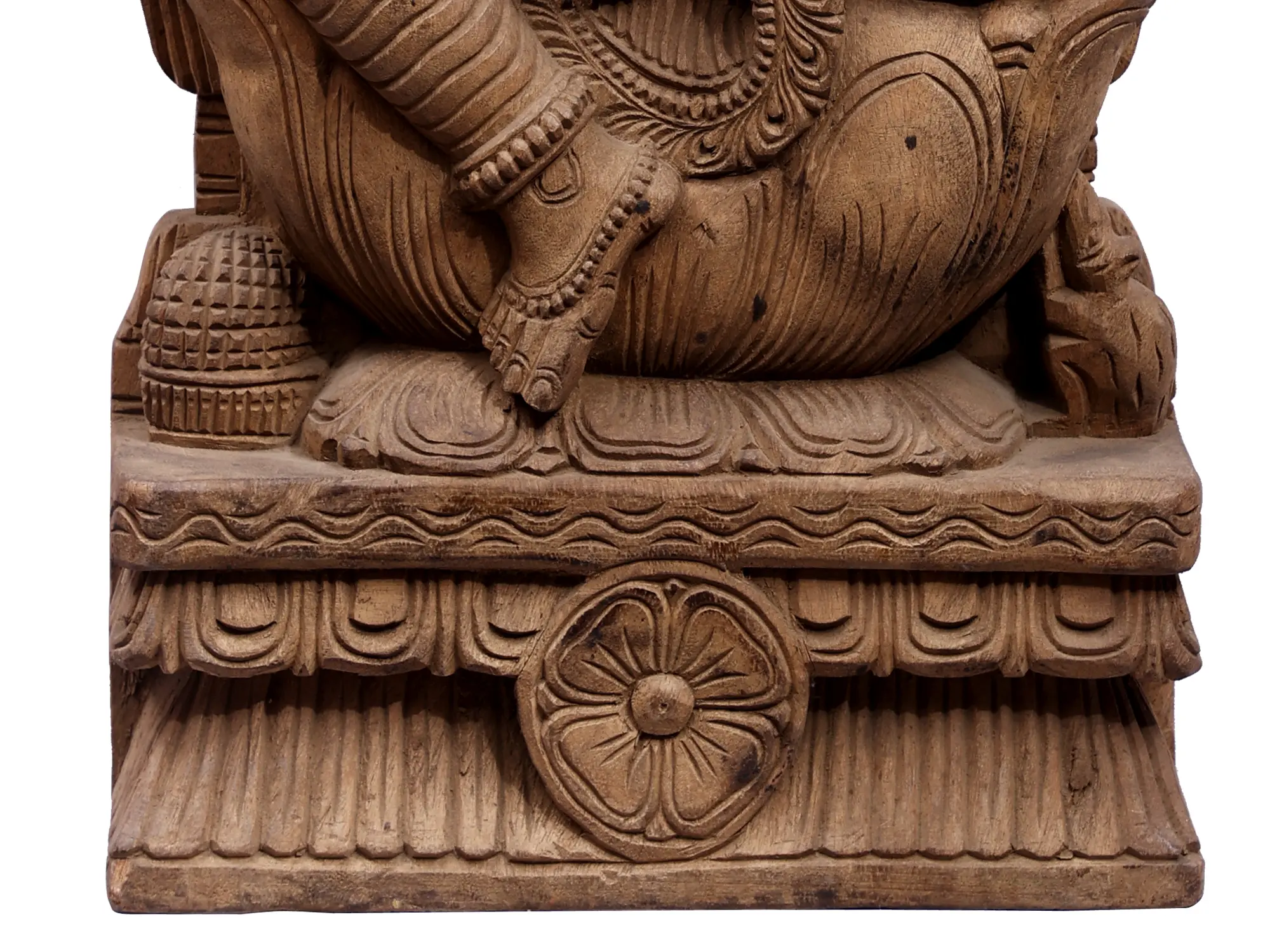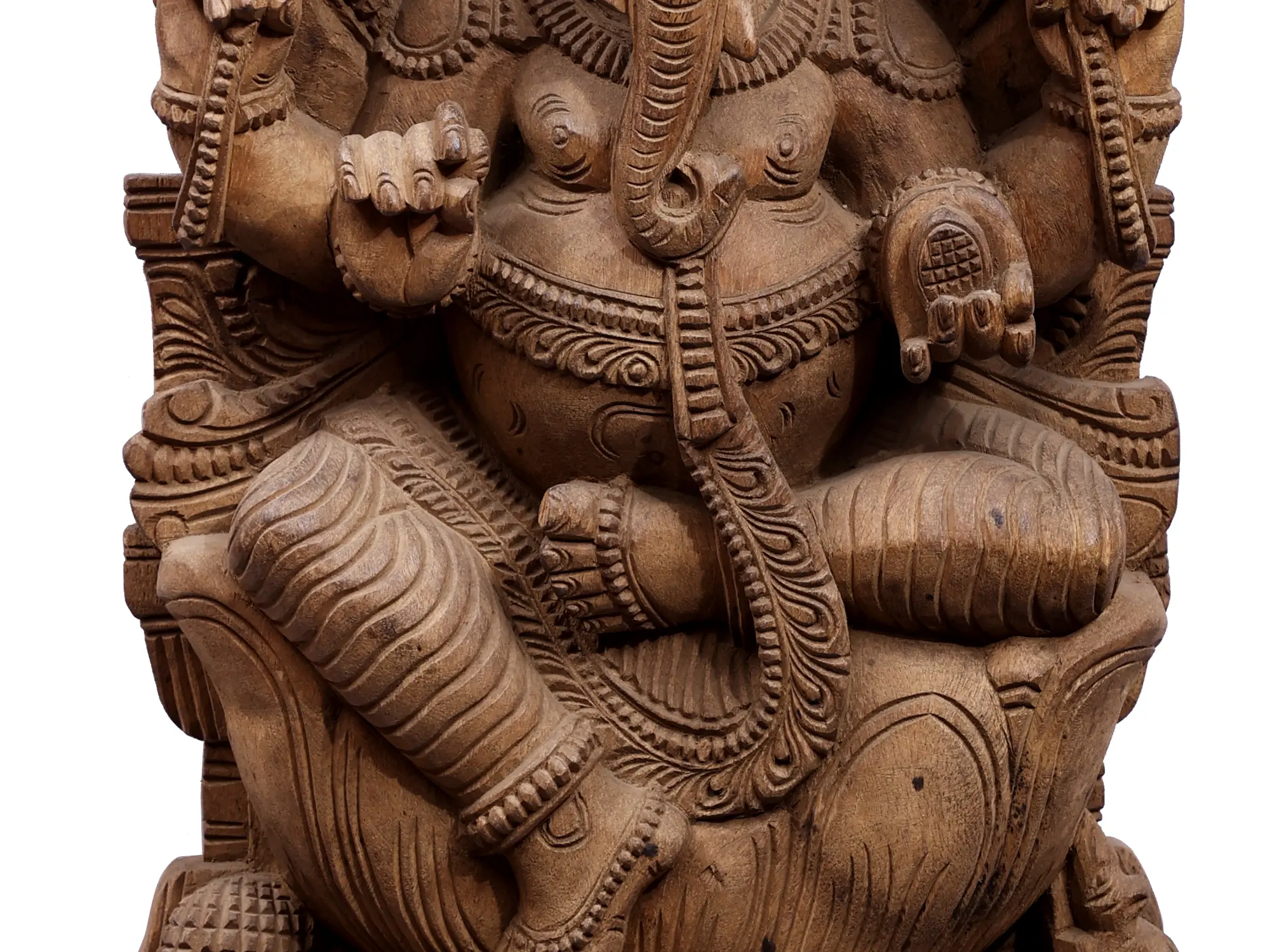 This exquisite wooden sculpture depicts Lord Ganesha, the beloved elephant-headed deity revered as the god of wisdom, intellect, and prosperity. Carved from a single piece of wood, this piece stands as a testament to the skill of the artisan and the timeless devotion to this auspicious deity. Lord Ganesha, with his characteristic large belly and elephantine trunk, is seated serenely upon a lotus flower, symbolizing purity and spiritual enlightenment. His multiple arms, each holding various symbolic objects, convey his divine power and his role as the granter of boons and the remover of obstacles.