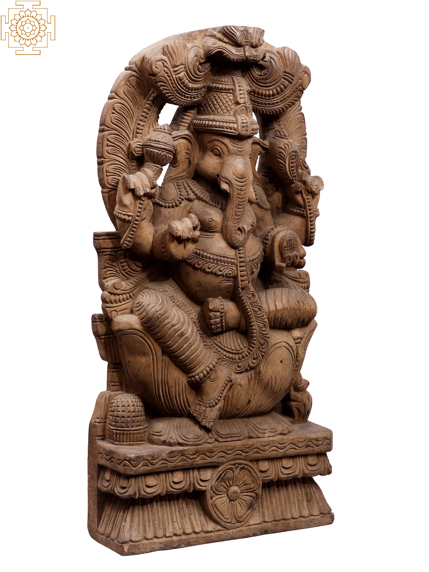 24" Wooden Sitting Lord Ganapati with Kirtimukha