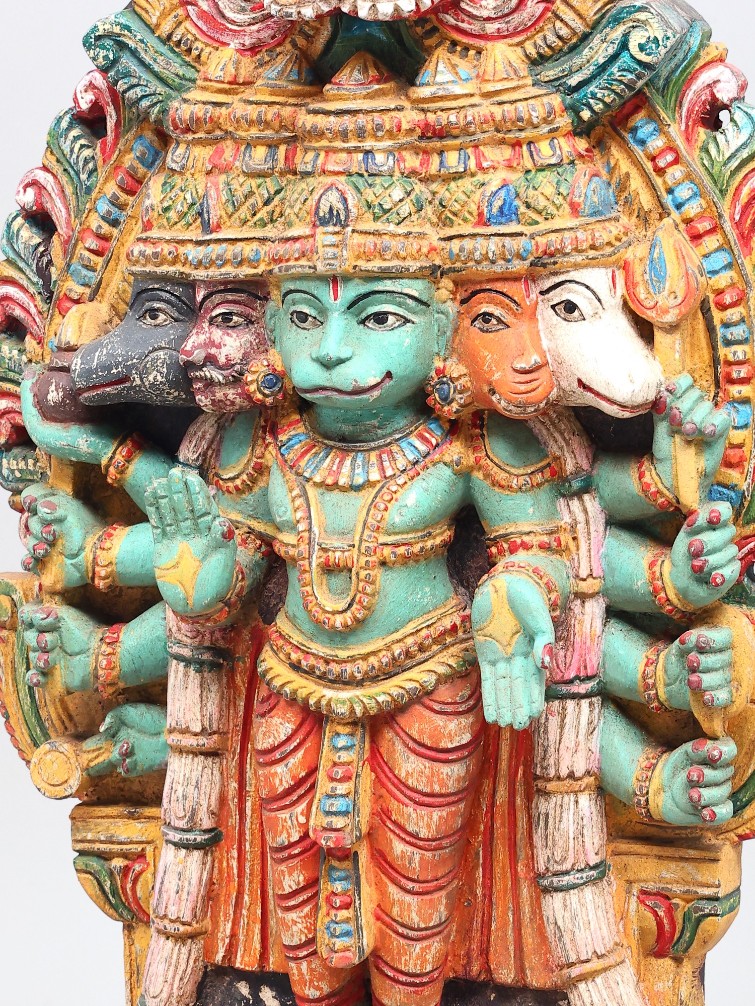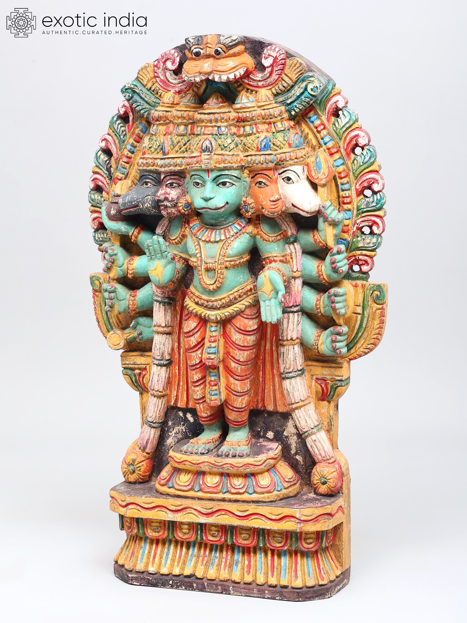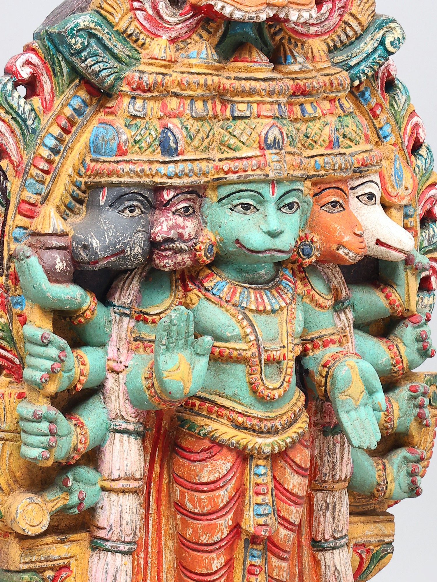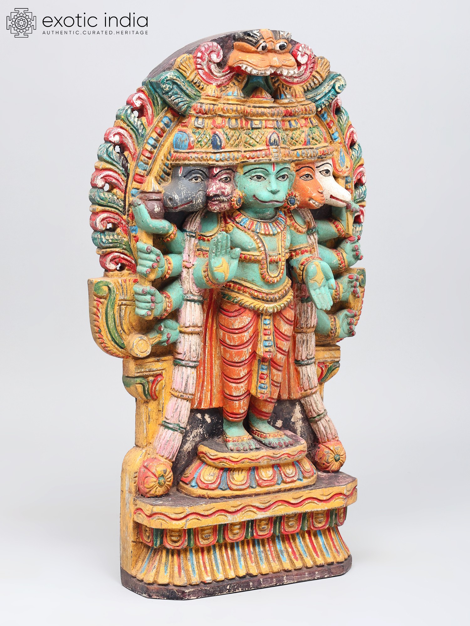 This magnificent wooden sculpture captures the awe-inspiring form of Panchamukhi Hanuman, a powerful manifestation of Lord Hanuman, the devoted disciple of Lord Rama. Revered for his strength, loyalty, and unwavering courage, Hanuman is an iconic figure in Hindu mythology, celebrated in epics like the Ramayana. This representation, with its five faces and multiple arms, signifies his omniscient and all-pervading nature, capable of confronting any challenge from any direction. The central face, often depicting Hanuman in his serene and compassionate form, radiates an aura of wisdom and grace. The other four faces represent his formidable aspects: the fierce Narasimha, the divine Garuda, the compassionate Varaha, and the horse-headed Hayagriva. Together, these faces symbolize his mastery over different energies and his ability to overcome obstacles and protect devotees from all forms of negativity. The intricate carving and vibrant, aged colors bring to life the divine essence of this powerful deity. Each detail, from the serene expressions to the dynamic postures of the hands holding various symbolic objects, speaks of the artisan's deep understanding and reverence for the subject.