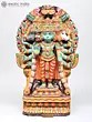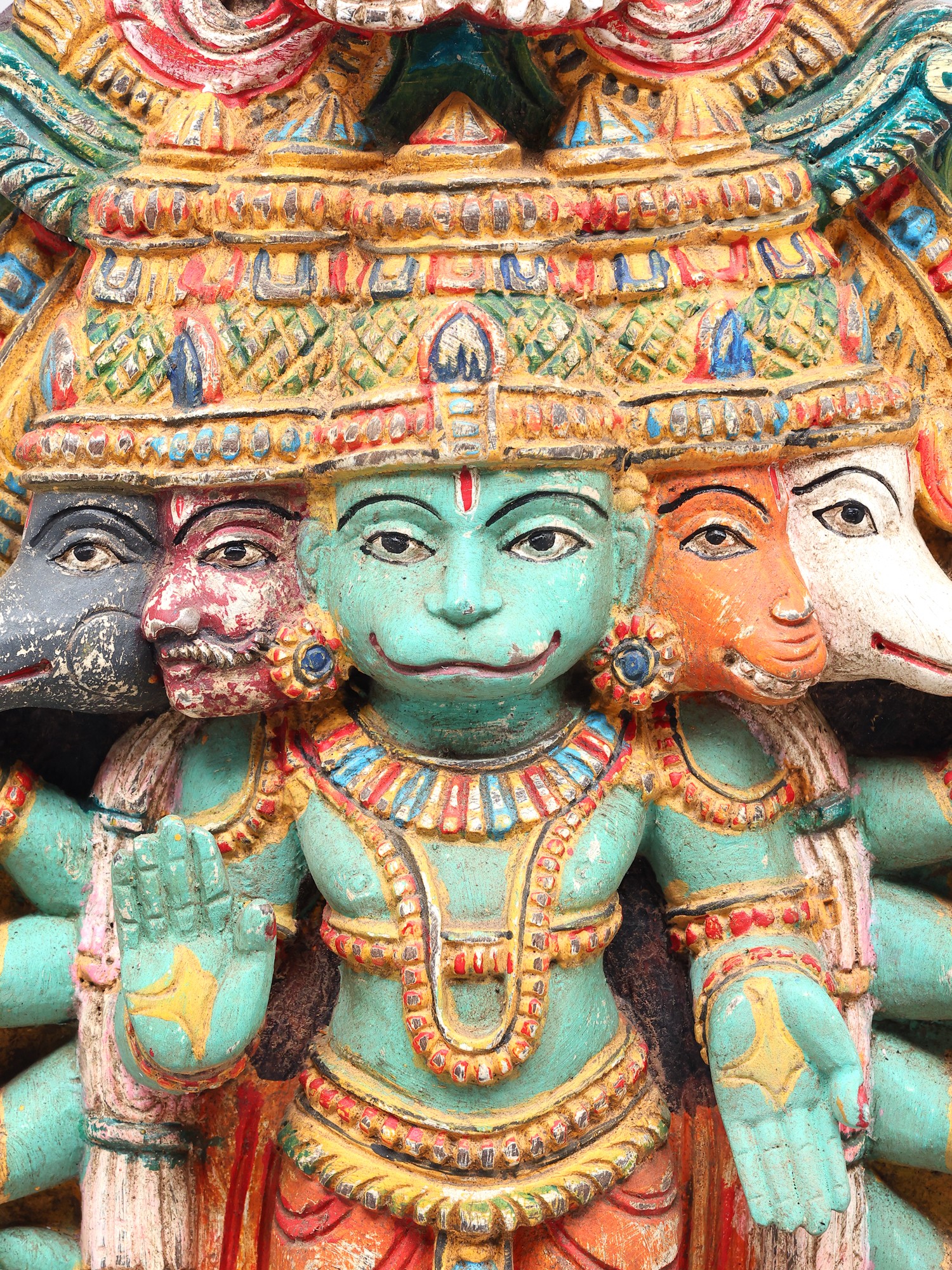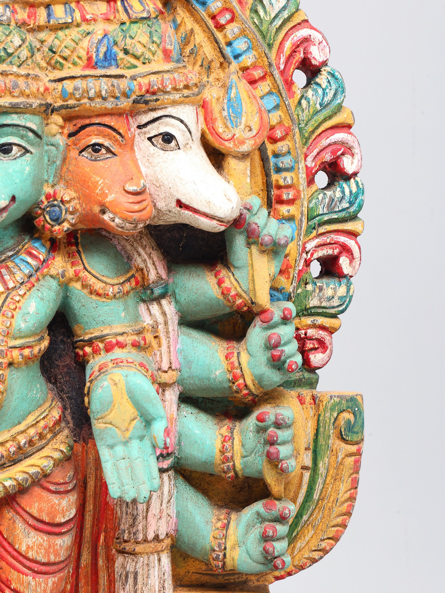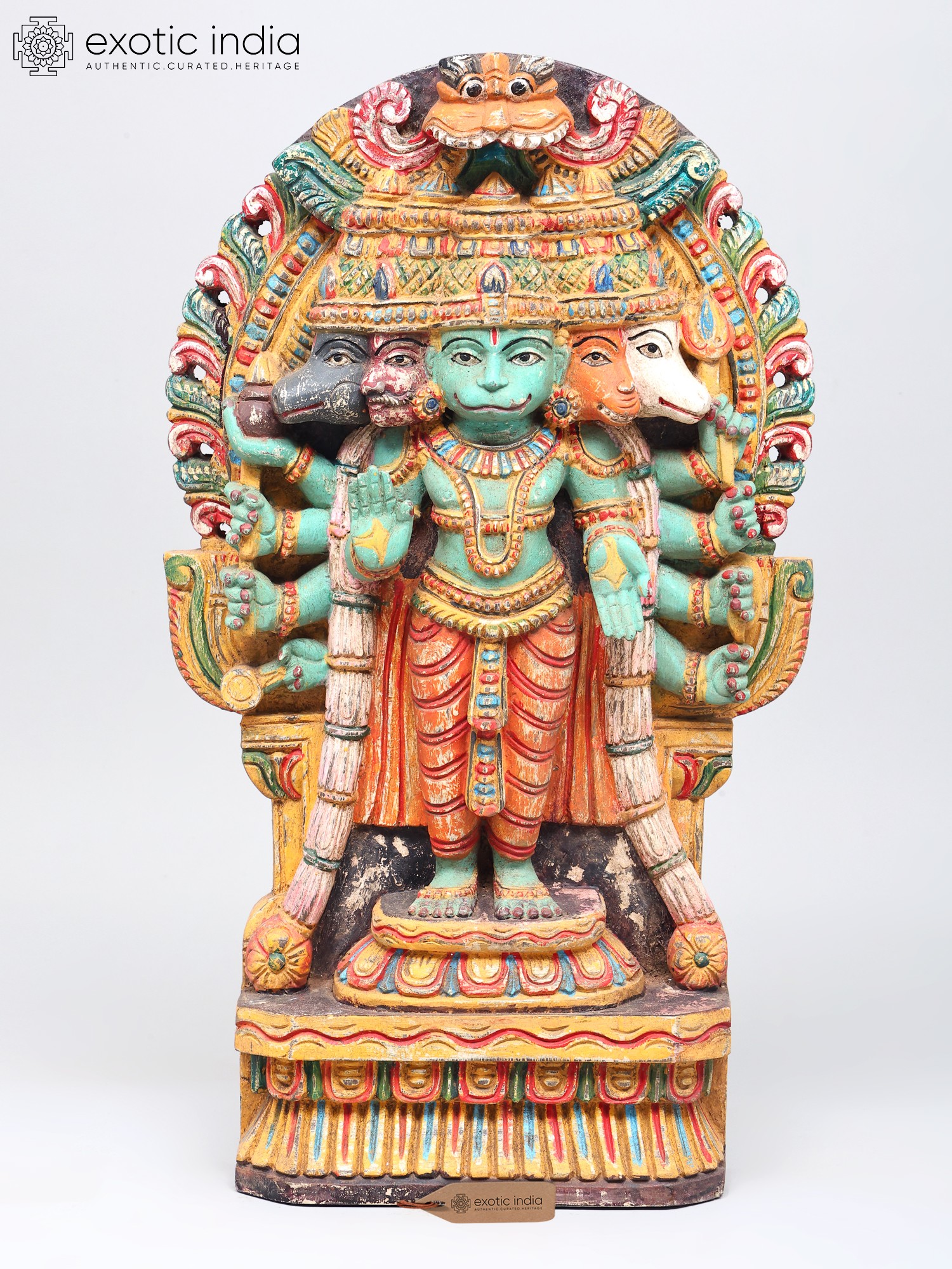 This magnificent wooden sculpture captures the awe-inspiring form of Panchamukhi Hanuman, a powerful manifestation of Lord Hanuman, the devoted disciple of Lord Rama. Revered for his strength, loyalty, and unwavering courage, Hanuman is an iconic figure in Hindu mythology, celebrated in epics like the Ramayana. This representation, with its five faces and multiple arms, signifies his omniscient and all-pervading nature, capable of confronting any challenge from any direction. The central face, often depicting Hanuman in his serene and compassionate form, radiates an aura of wisdom and grace. The other four faces represent his formidable aspects: the fierce Narasimha, the divine Garuda, the compassionate Varaha, and the horse-headed Hayagriva. Together, these faces symbolize his mastery over different energies and his ability to overcome obstacles and protect devotees from all forms of negativity. The intricate carving and vibrant, aged colors bring to life the divine essence of this powerful deity. Each detail, from the serene expressions to the dynamic postures of the hands holding various symbolic objects, speaks of the artisan's deep understanding and reverence for the subject.