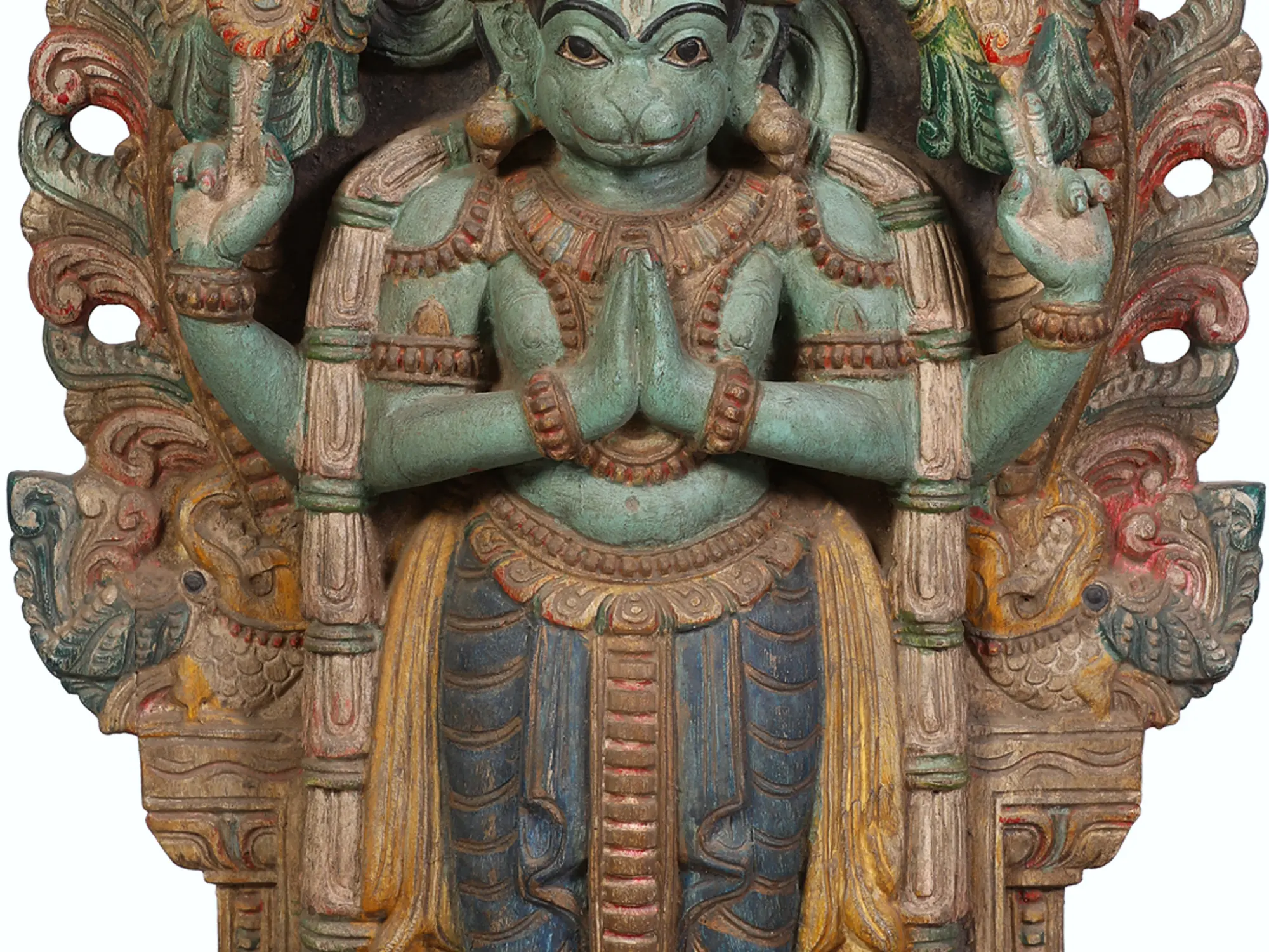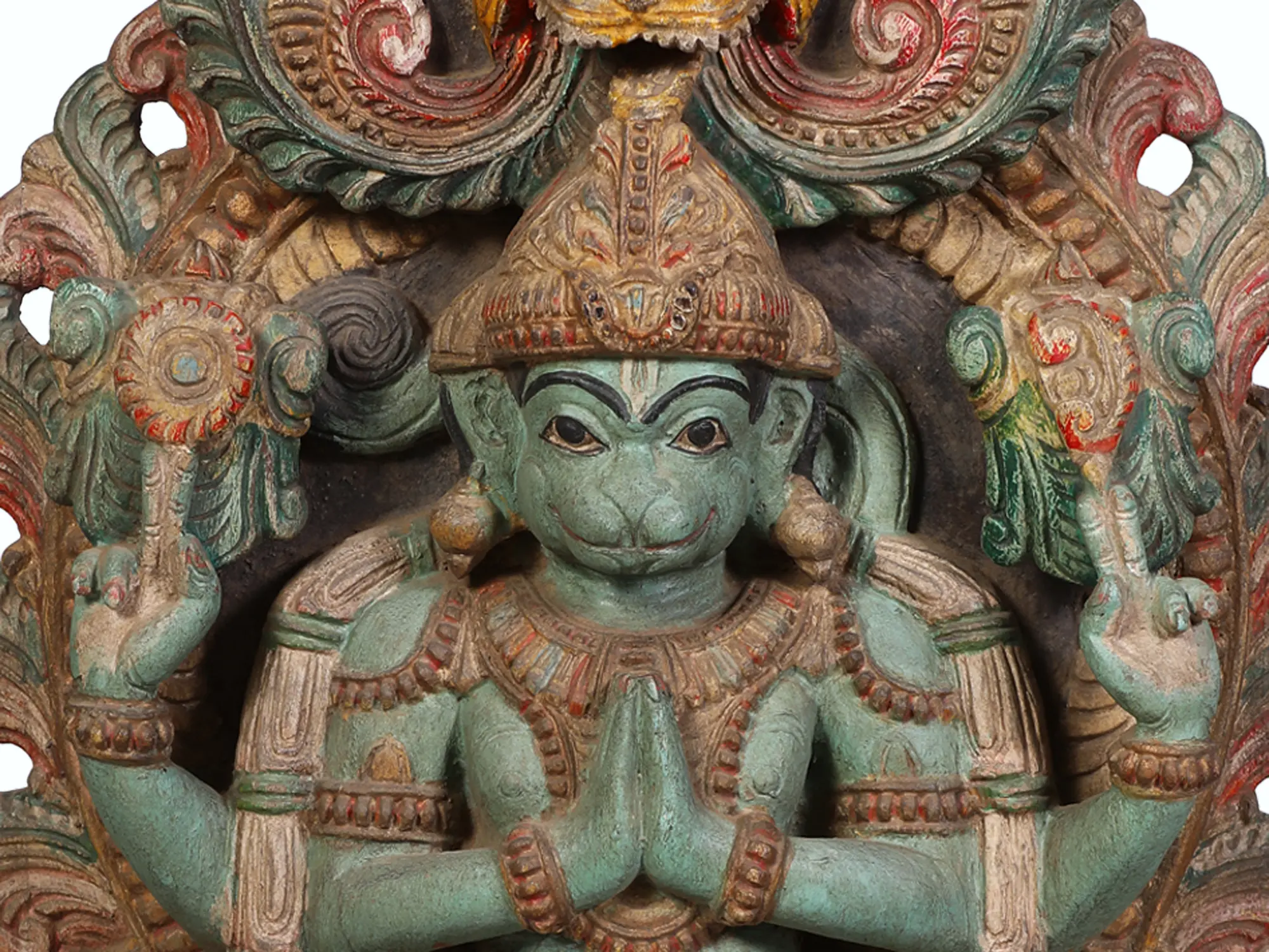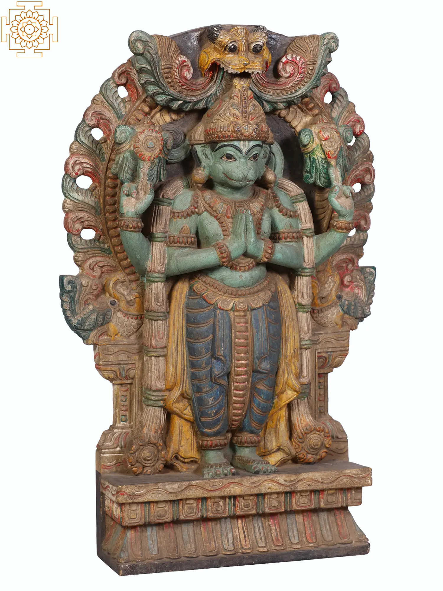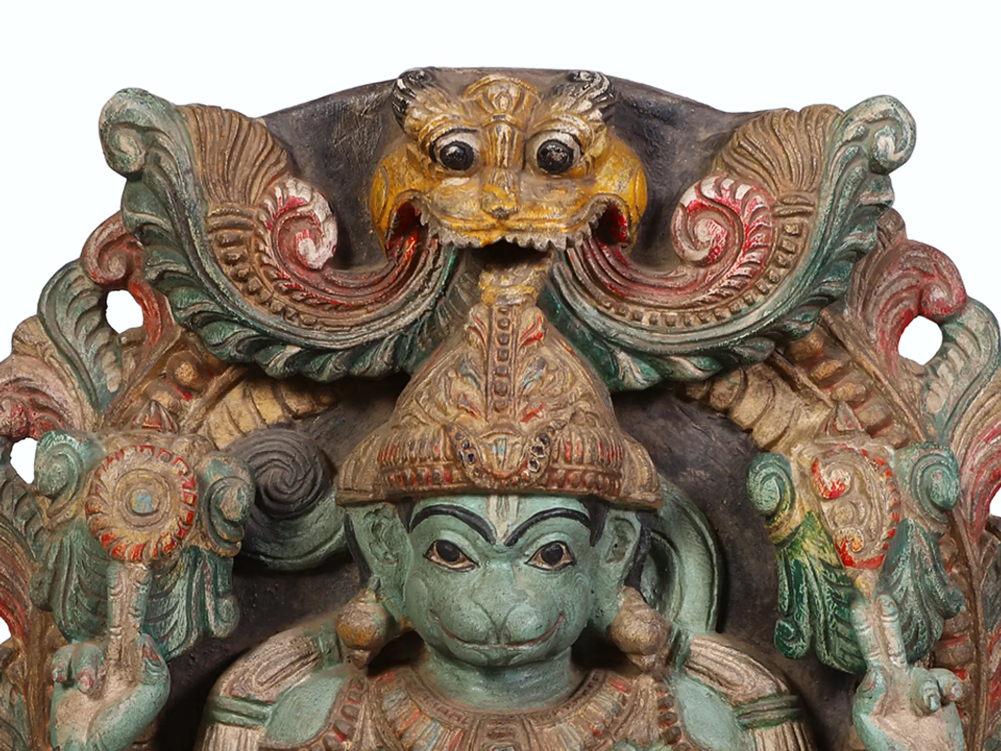 Hanuman is widely revered as Sankat Mochan, the remover of troubles and obstacles. This sculpture embodies that protective spirit. The intricate details of the carved ornamentation surrounding him, from the stylized floral motifs to the fierce visage at the apex of the arch, all contribute to the sense of divine protection. His multi-armed depiction, a common iconography for powerful deities, suggests his immense strength and ability to overcome any challenge. The vibrant, yet aged, coloring adds a layer of character and history to this powerful depiction, hinting at the many blessings it has bestowed.