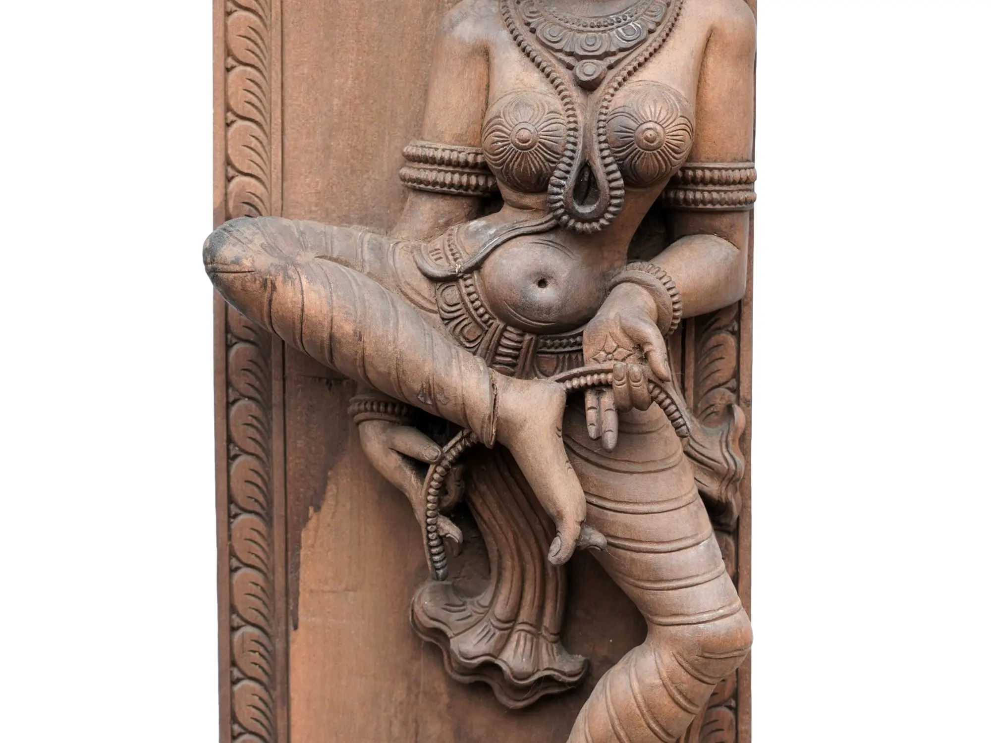 Behold the enchanting sight of an apsara, a celestial nymph, poised in celestial splendor, delicately attempting to adorn herself with her ghumru (ghungroo) while standing. Adorned with divine attire hat seems to sway with every graceful movement, she exudes an ethereal allure that captivates the beholder’s gaze.