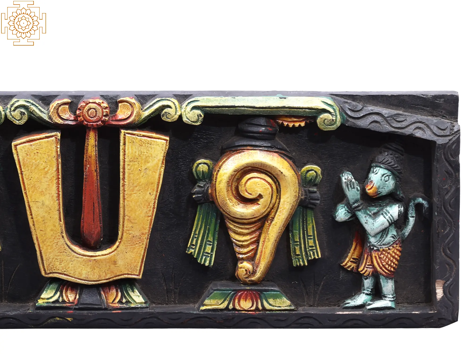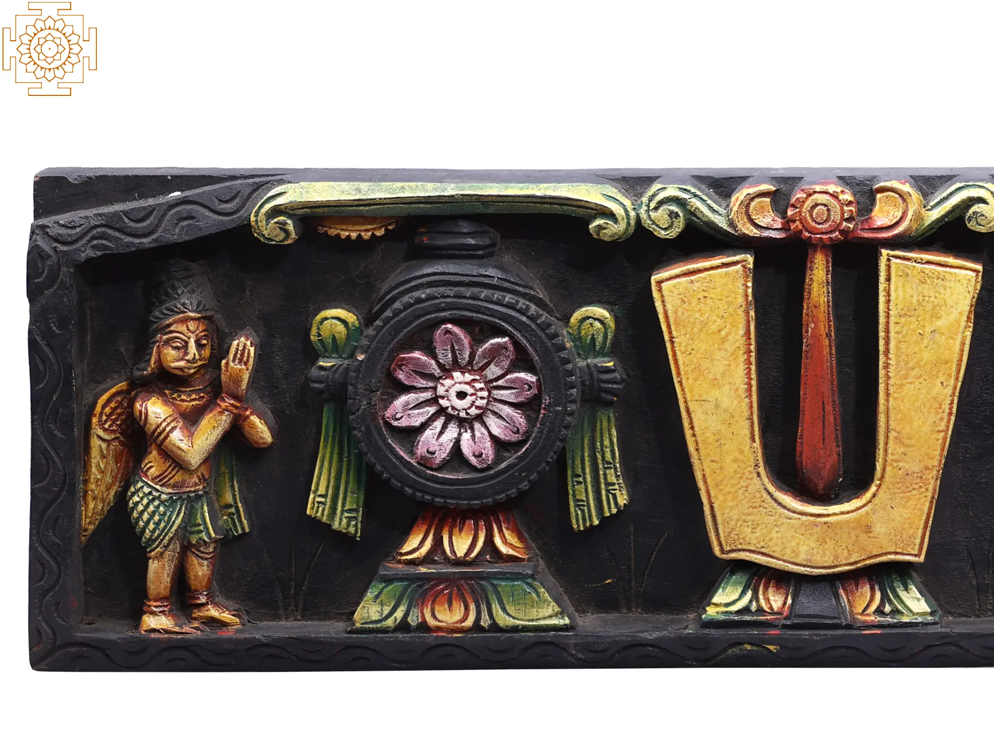 24" Wooden Vaishnava Symbols (Chakra, Tilak & Shankh) Wall Panel