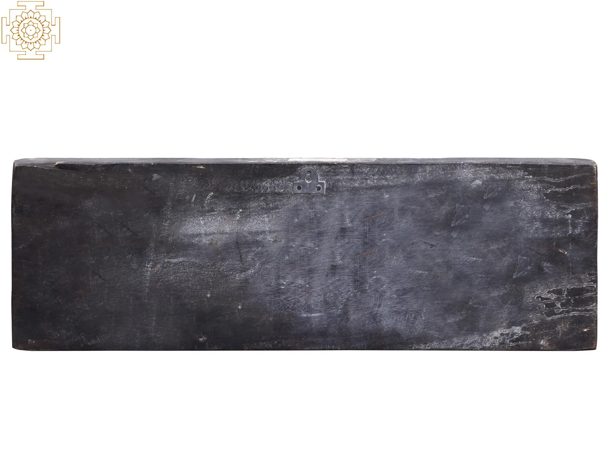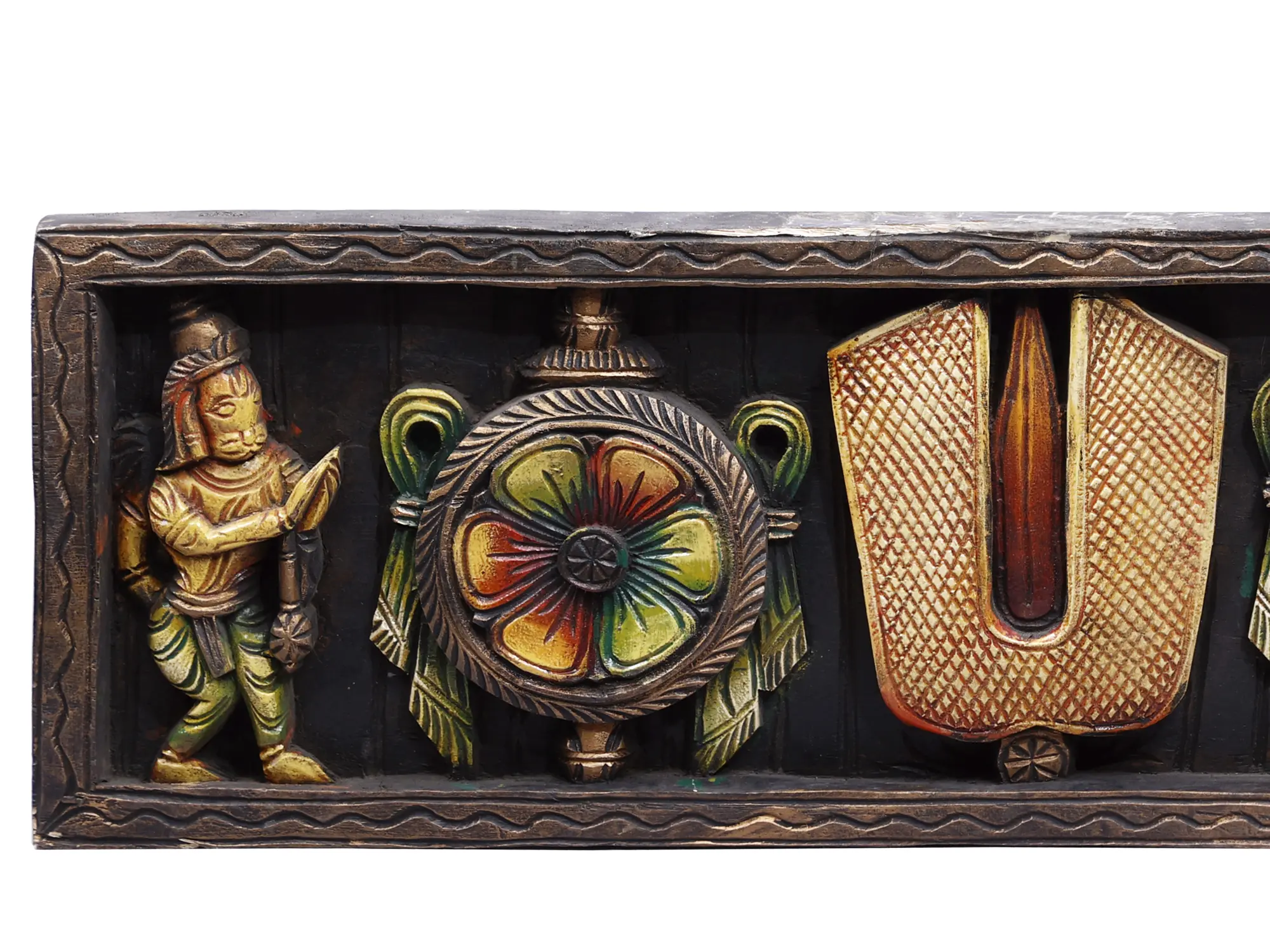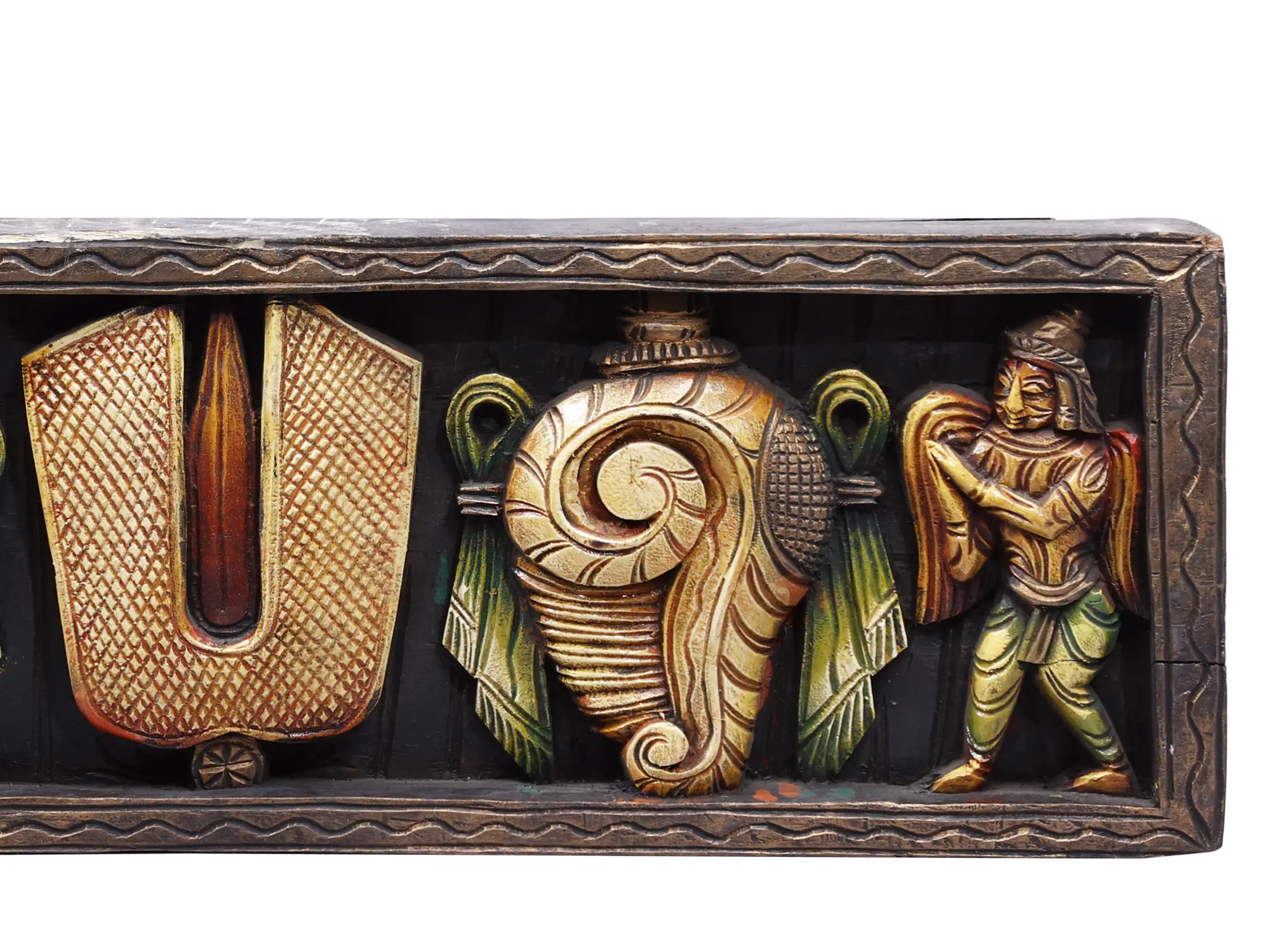 The entire panel is framed within a rustic, carved border, further enhancing its handcrafted appeal. The dark wood base provides a striking backdrop, allowing the richly colored and textured carvings to stand out. This piece is not merely an adornment for your walls; it's an invitation to connect with the profound philosophies and devotional practices of Vaishnavism. Imagine the serene and sacred ambiance it will bring to your home or meditation space, a constant reminder of the divine presence and the virtues represented by each sacred symbol. This wall panel is a beautiful fusion of art, spirituality, and tradition, perfect for anyone seeking to infuse their surroundings with a sense of peace, devotion, and divine grace.