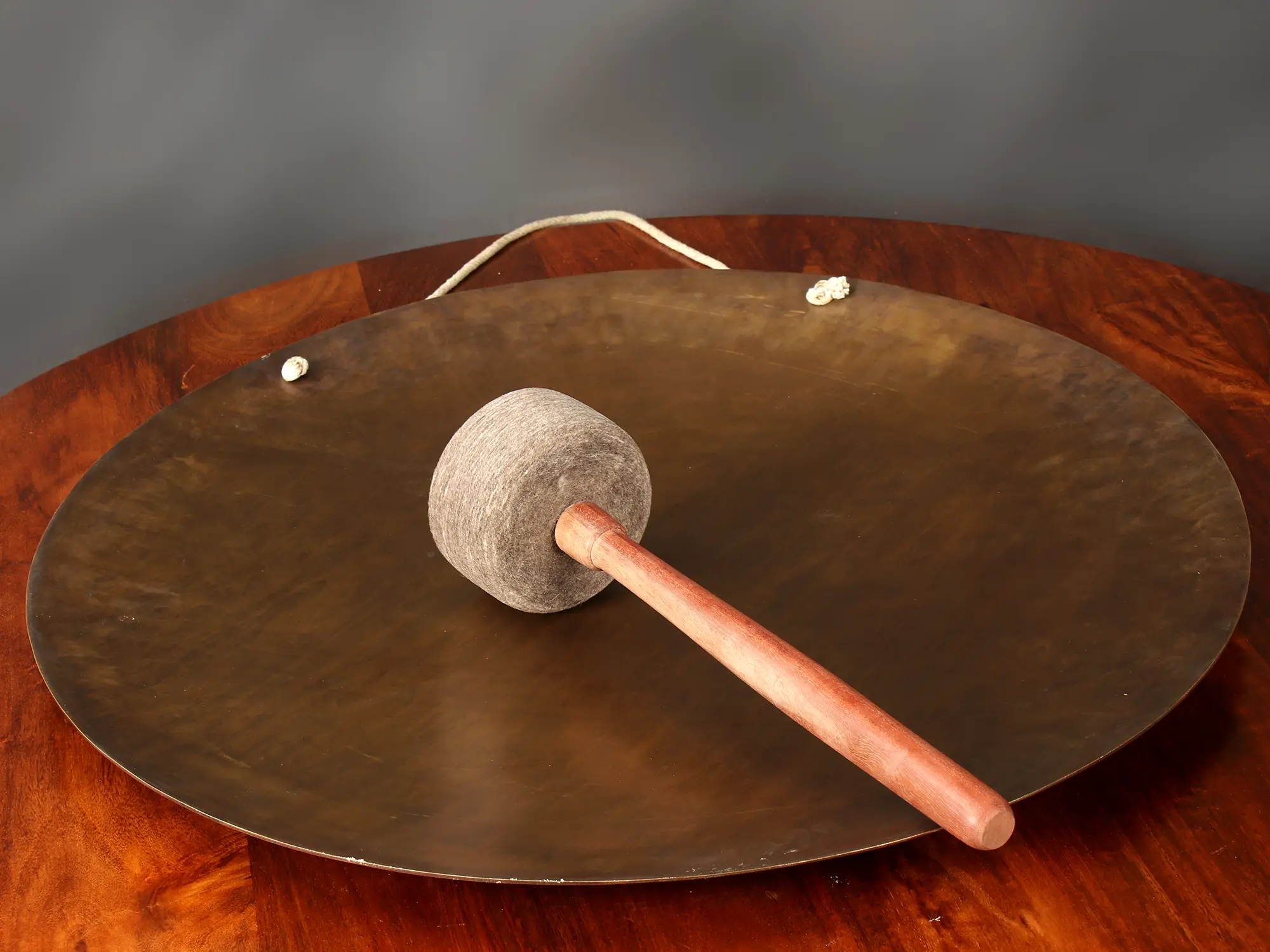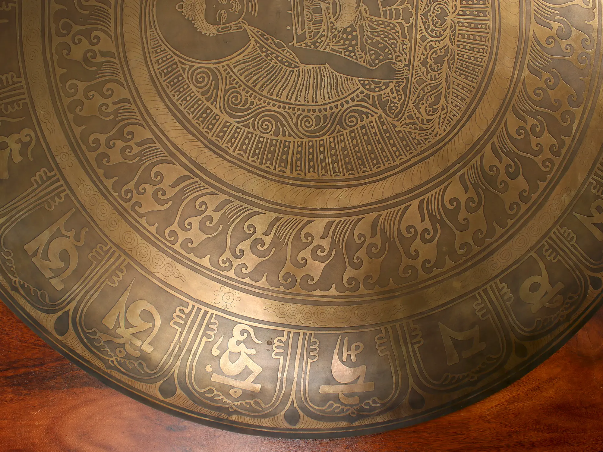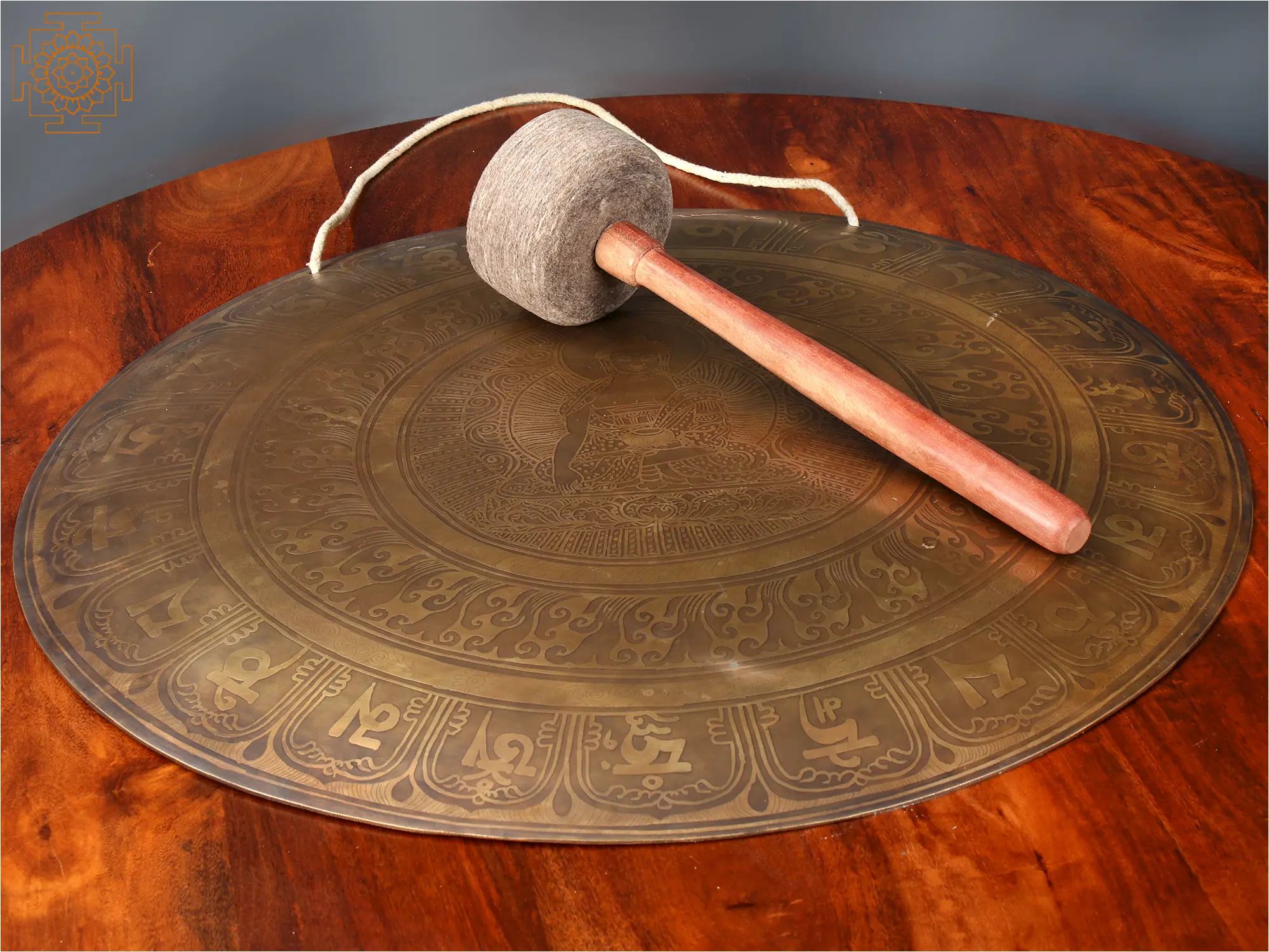 This Gong is made of Bronze and is used in contemplative sessions and festivals to promote mind-body healing. With a central image of Bhumisparsha Mudra, the Gong symbolizes perseverance and wisdom. The central image of Buddha is encircled with a ring of clouds and further decorated with clockwise running of the Mani Mantra alphabets. The gong's look comprises a dark brown body and light golden chiseling of symbols, thus exuding an old-world charm. A thread is attached at the back of the gong for the easy handling of the instrument. A wooden handle with a soft fleece head accompanies the Gong to create the sound. It is believed that using this Gong in meditative occasions would bring peace and tranquility to a space.
