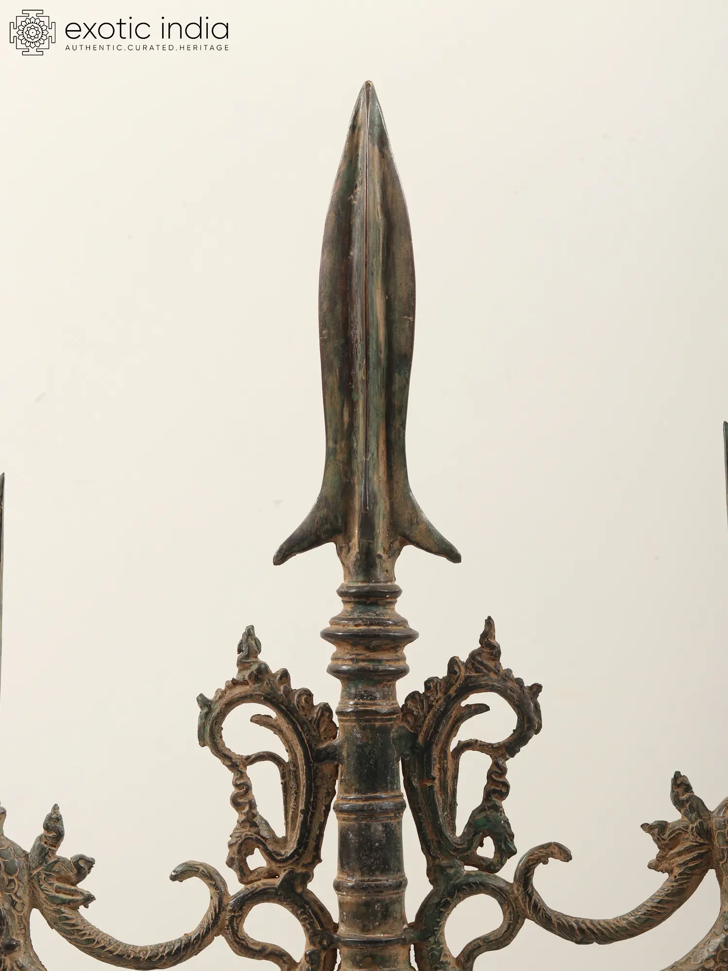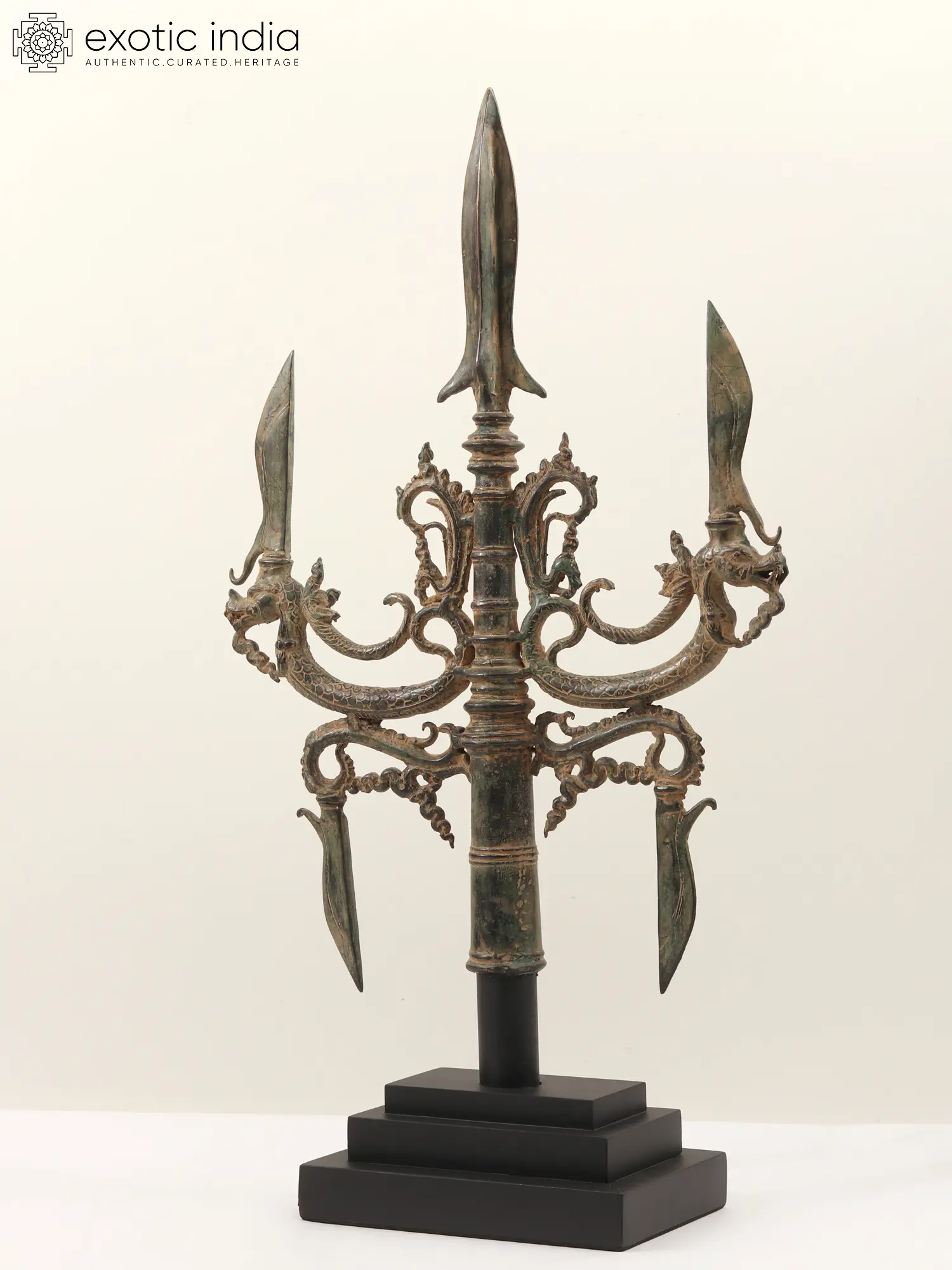 This Brass Trident Sculpture is the weapon of Lord Shiva also identified as a Halberd Head. This Halberd Head with Nagas and Blades is a distinctive and symbolic weapon component. A halberd is a polearm with an axe blade, a spear, and sometimes a hook or spike on the top, and this particular one features intricate embellishments. The inclusion of nagas, serpent-like mythological creatures, adds a mythical and cultural touch.