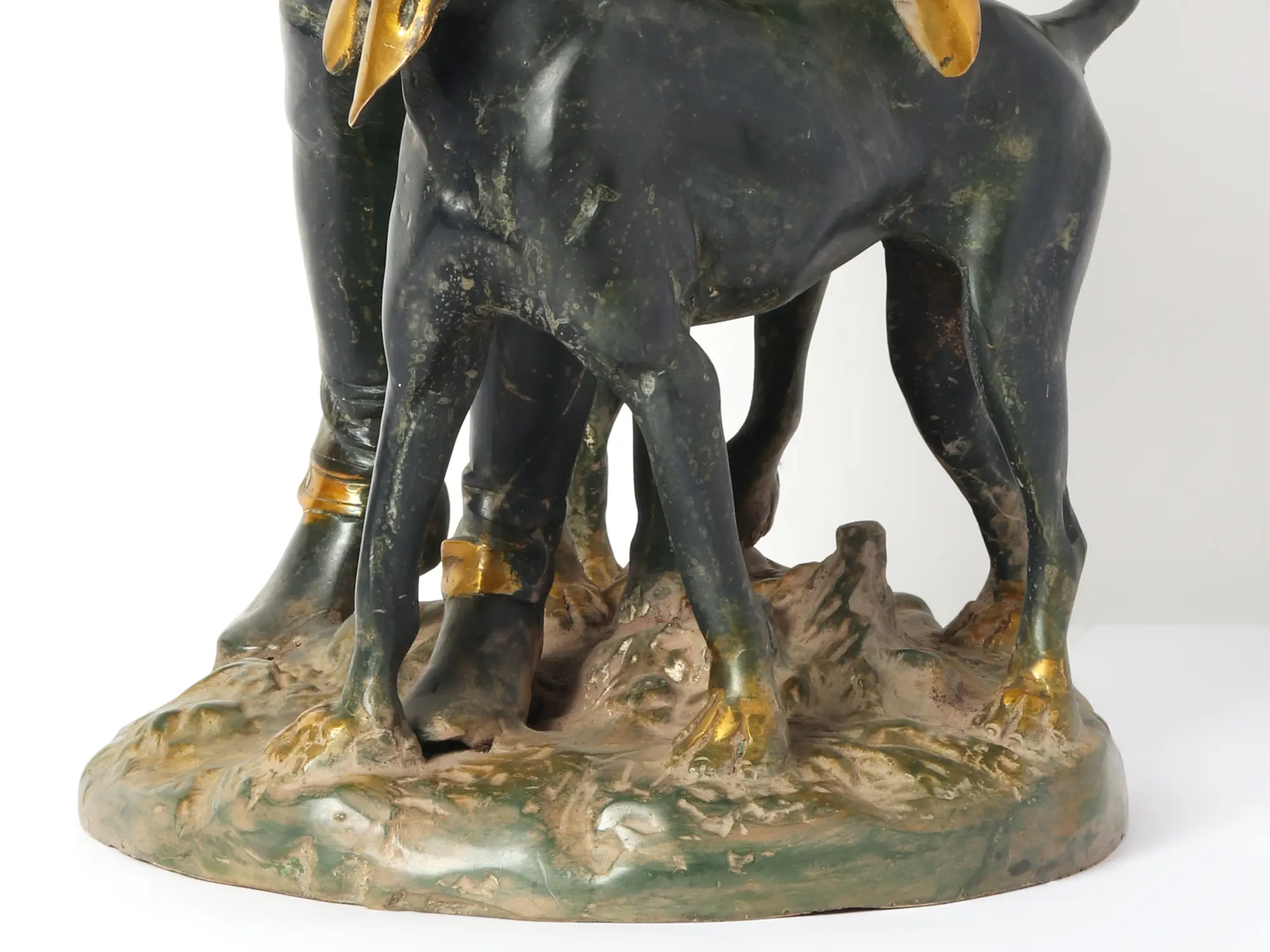 Flanking the huntsman are two magnificent hounds, their muscular bodies and alert expressions perfectly capturing the breed's inherent loyalty and remarkable agility. These hounds were frequently depicted in 18th-century French art, often appearing alongside noble huntsmen. Hounds were not merely working animals; they were symbols of companionship, representing the strong bonds between man and beast. In mythology and folklore, dogs often act as guides and protectors, linking the human world to the spiritual realms. These hounds, faithfully rendered in bronze, mirror this rich symbolism, adding a layer of depth and meaning to the overall composition.