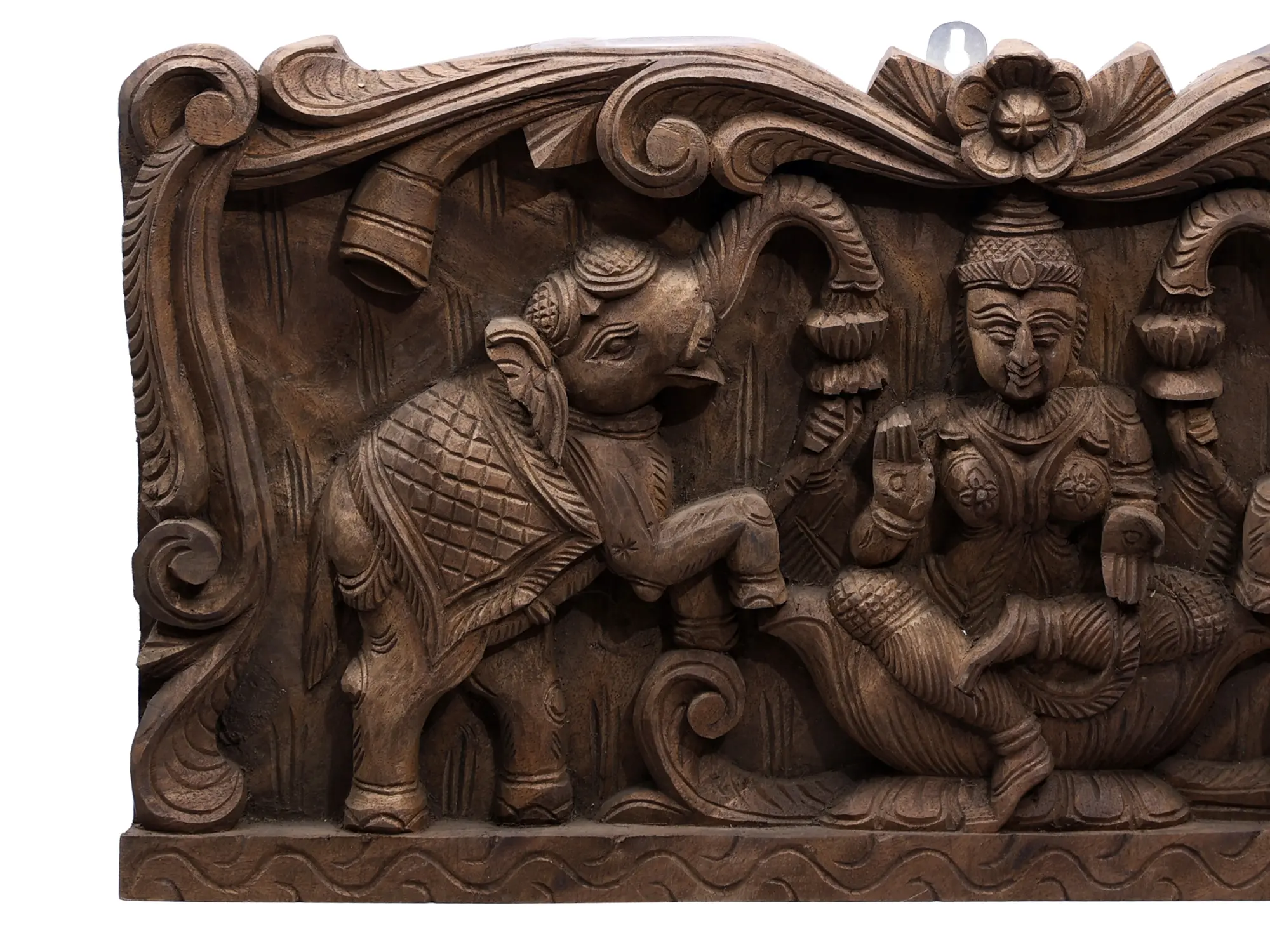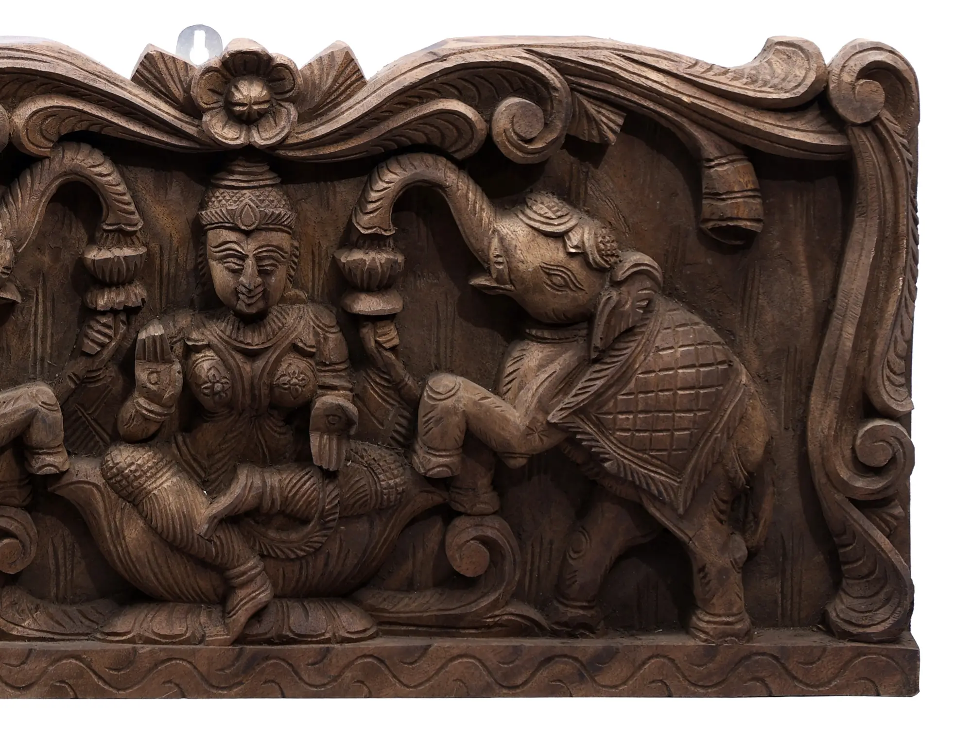 Gaja Lakshmi, also known as “Kelbai” or “Bhauka Devi”, a vision of divine grace, graces the heart with her ethereal presence. Enshrined at the centre, She sits upon a lotus, a symbol of purity and prosperity. Majestic elephants, adorned with regal elegance, honour her with a sacred ritual, showering her with pristine waters from their noble trunks. Her right hand, raised in “Abhaya Mudra”, offers assurance and protection, while her left hand, extended in “Varada Mudra”, bestows boundless blessings upon those who seek her benedictions. Carved with exquisite artistry, this wood panel captures the enchanting essence of Gaja Lakshmi, a goddess of abundance and prosperity.