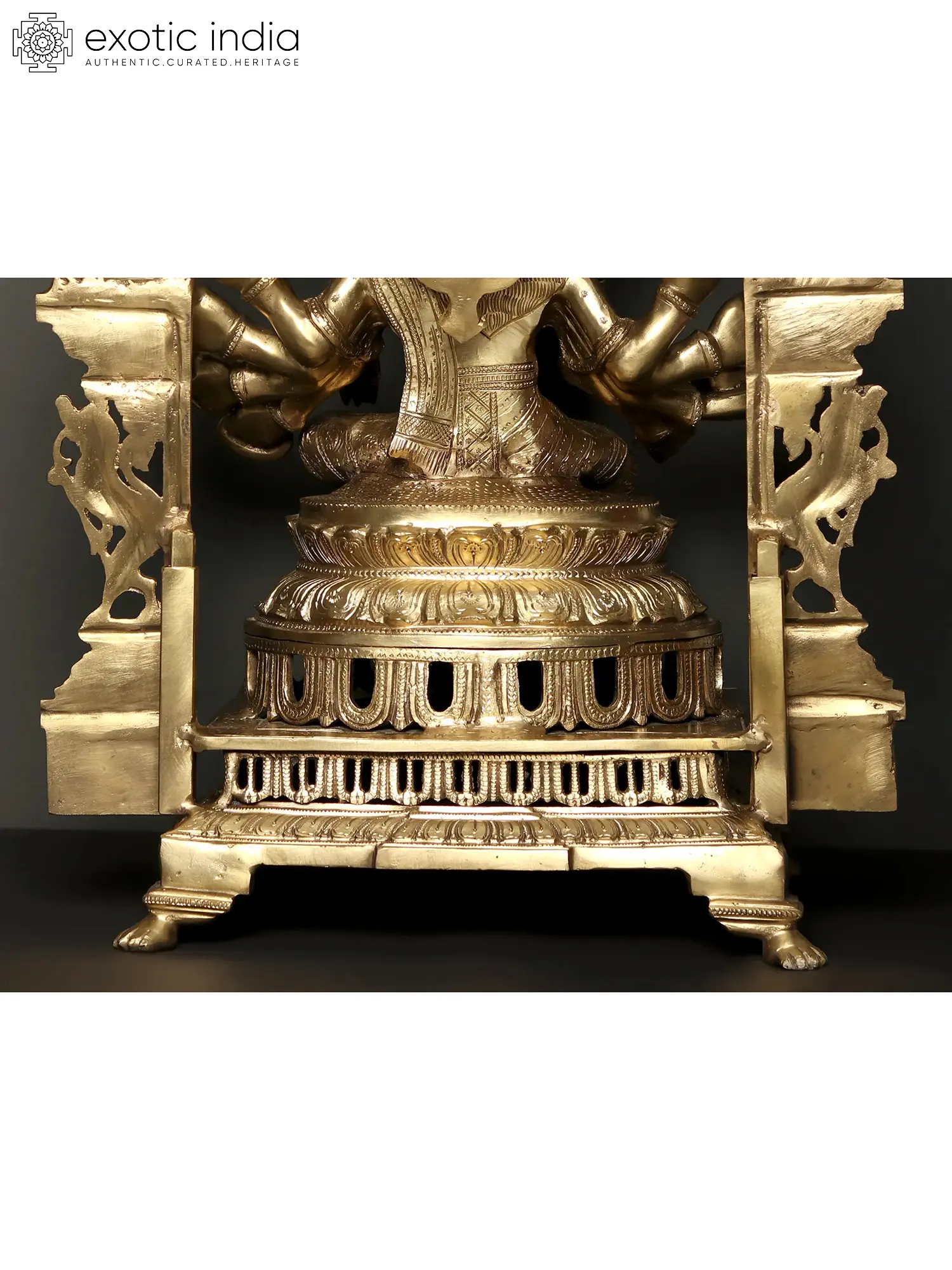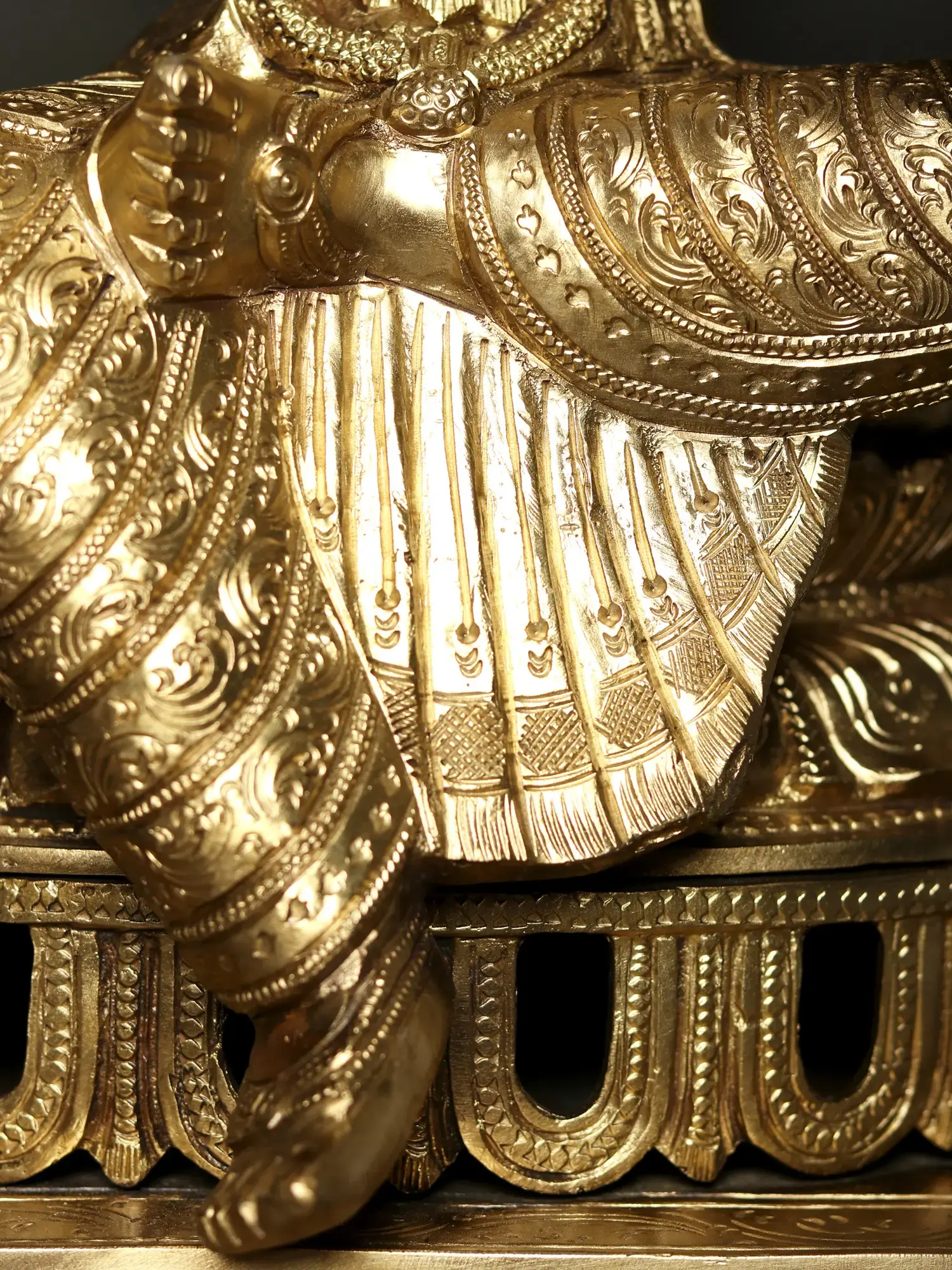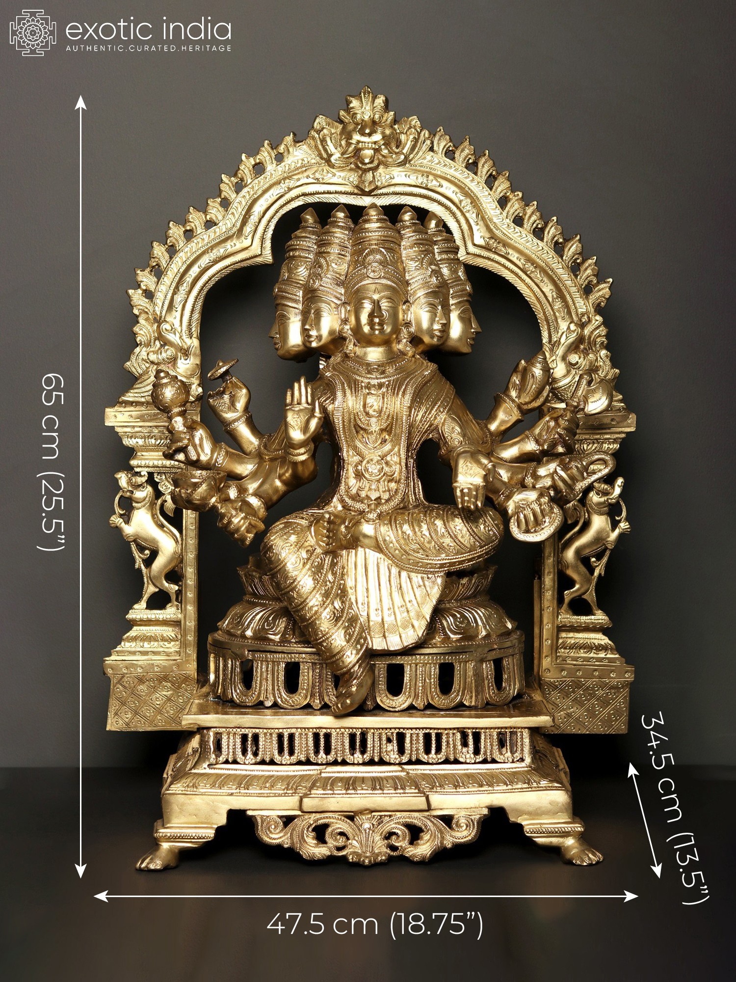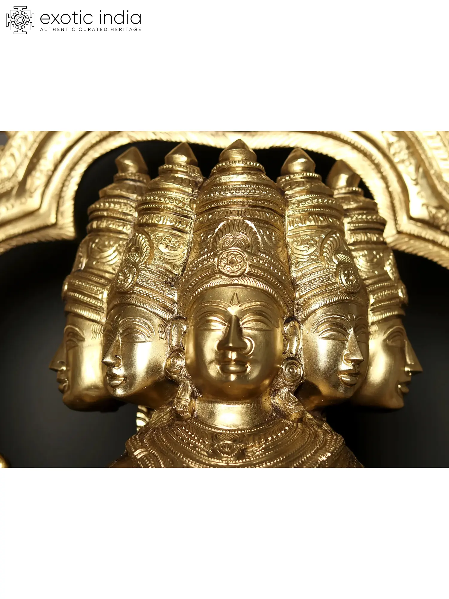 Goddess Gayatri or Vedamata (mother of Vedas), is an ancient Indian mother goddess, revered from the time of the Vedic period as the source of supreme wisdom and divinity in a person. She is the manifestation of the energies of Brahma-Vishnu-Shiva and is the materialization of the Vedic Gayatri mantra, chanting which brings the eternal brilliance of Gyan in one’s life. In this stunning bronze statue, goddess Gayatri is placed on a two-layered lotus throne, inside an ornate Prabhavali, marked by Kirtimukha, Makara, and Yalis. Devi Gayatri is presented as a youthful woman, brimming with beauty which is enhanced by her attire and exquisite ornaments. Panchamukhi (five-headed) and Dashabhuja (ten-armed), Maa Gayatri fills the atmosphere with a solar radiance, reminiscent of the vitalities that she bestows on her devotees.