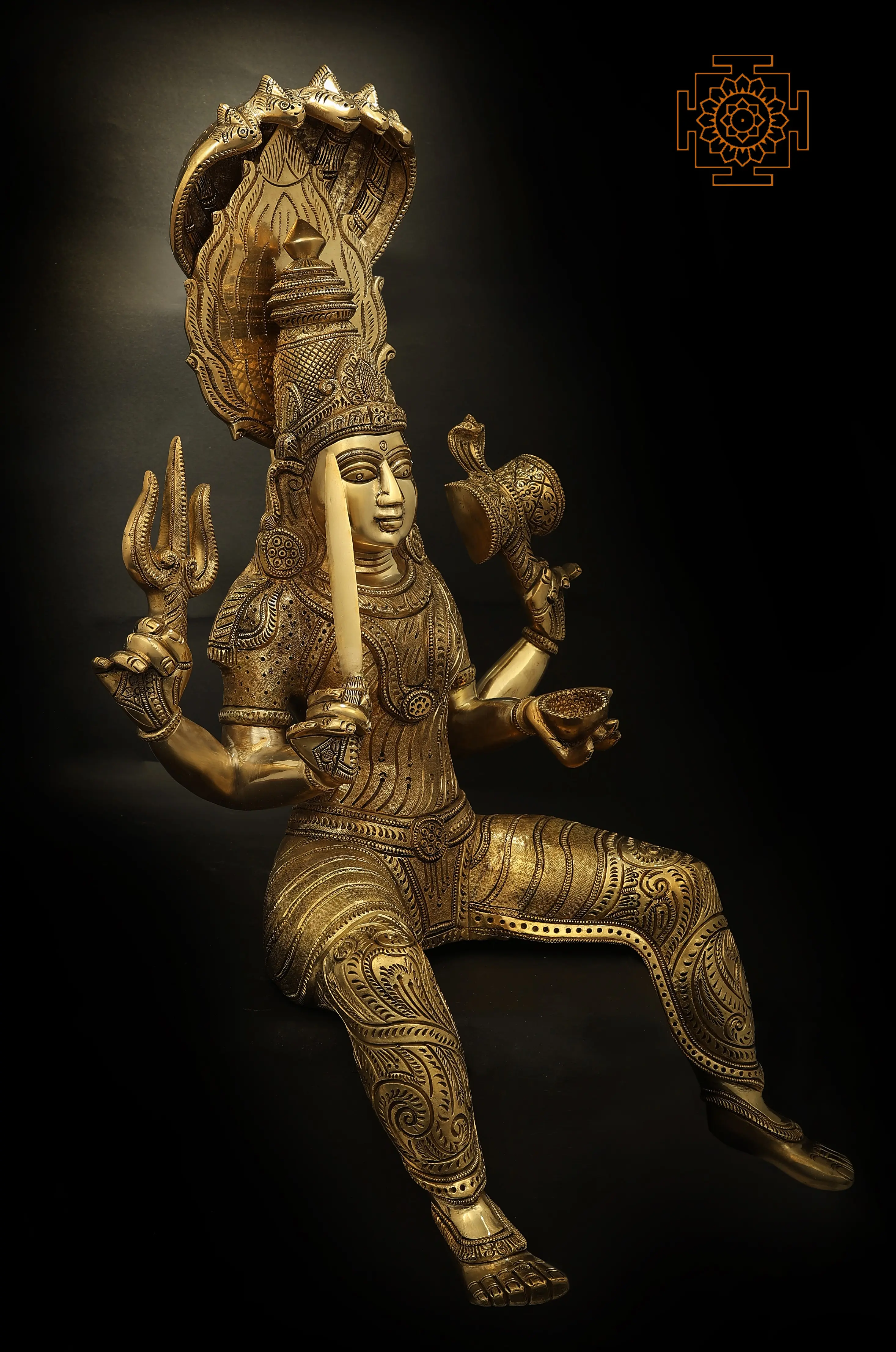This exquisite brass statue captures the essence of Goddess Mariamman, a revered deity in Hinduism, particularly in South India. Known as the "Mother Goddess," she is worshipped as a protector against diseases, a dispeller of evil, and a bestower of boons. The intricate craftsmanship of this piece brings to life her divine presence, making it a truly captivating addition to any sacred space or home decor. The warm, lustrous gleam of the brass, meticulously sculpted, radiates a sense of timeless sanctity and enduring strength. The sculpture depicts Goddess Mariamman seated in a posture of serene authority, her multiple arms holding symbolic objects that represent her multifaceted power. The hooded cobra rising above her head is a powerful motif, signifying protection, primal energy, and the ability to overcome venomous threats, both literal and metaphorical. This imagery connects her to the primal forces of nature and the cyclical nature of life and death, a theme often explored in Tantric traditions. The elaborate adornments and detailed carvings on her attire showcase the artistry and devotion poured into its creation.