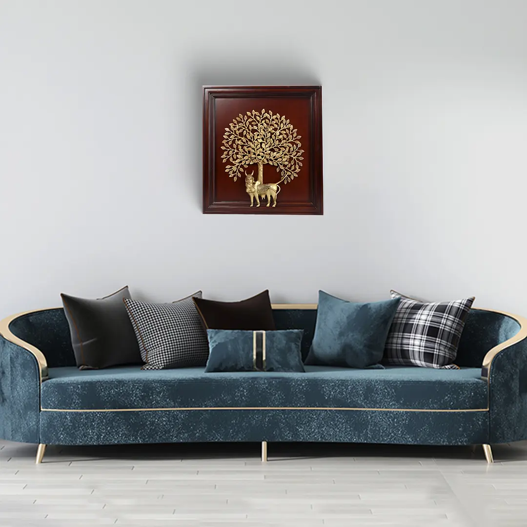 Crafted from a harmonious blend of wood and brass, this artwork unveils the divine “Kamadhenu”, the sacred celestial cow, who grants boundless wishes. With her tranquil gaze, she stands beneath the resplendent “Kalpavriksha”, the tree of wishes. Its branches, adorned with leaves of eternal fulfillment, rustle with the whispers of desires. This wall hanging is a portal to dreams, where every touch resonates with timeless wonder, and where the radiant fusion of materials mirrors the harmonious fusion of heaven and earth.