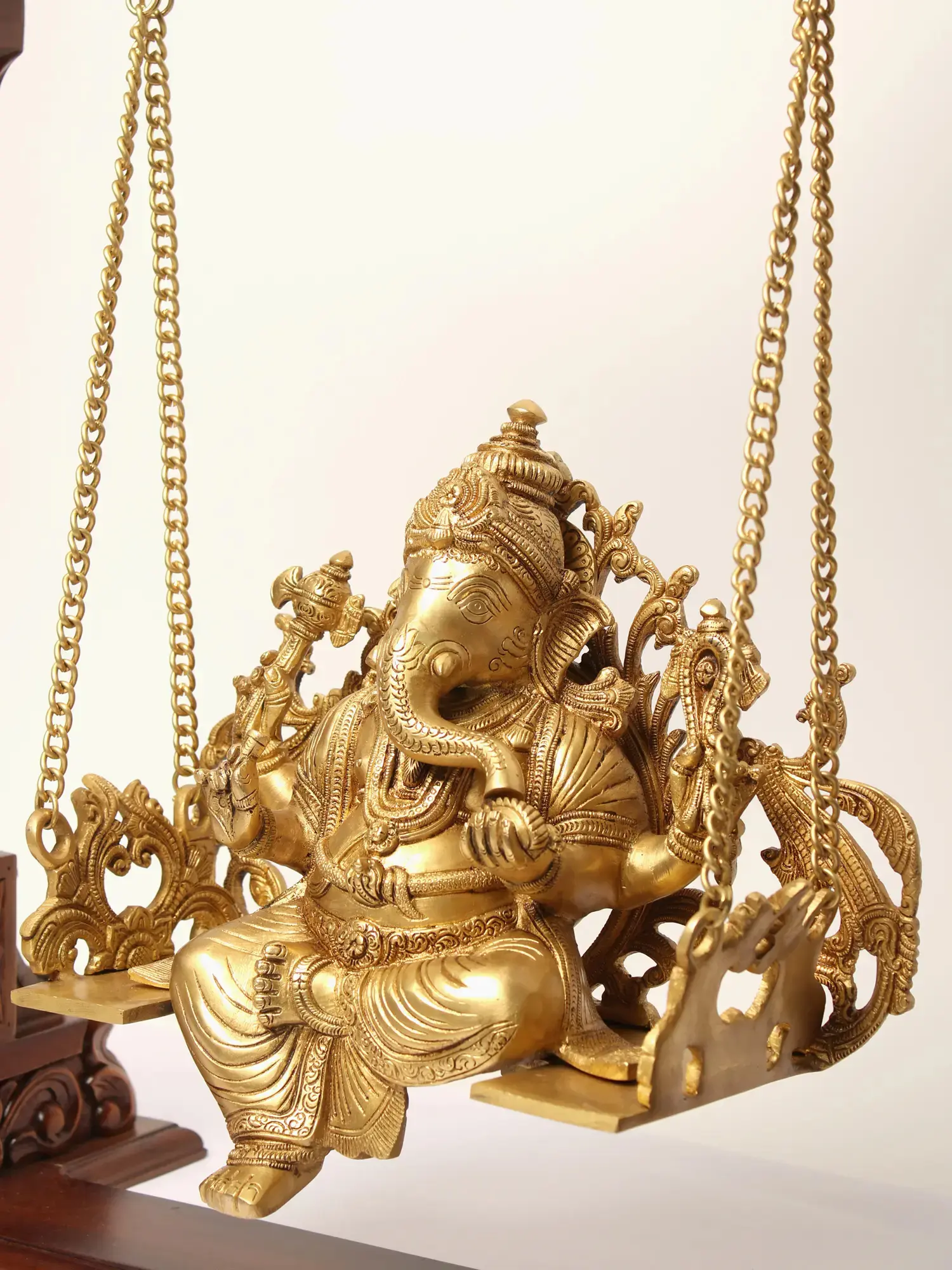 The frame of the swing on which Ganapati is enthroned is masterfully carved and layered with a lacquered finish, giving it a sumptuous appearance, worthy of the Lord.