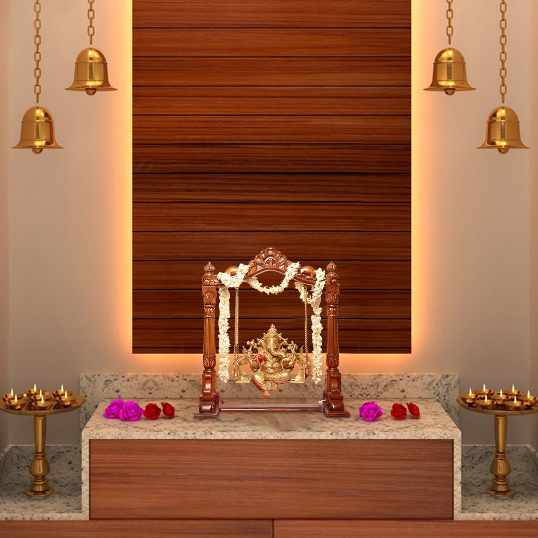 Figures of Mushaka and floral patterns symbolizing abundance embellish the wooden structure, to which is attached the glorious swing-throne of Ganesha.