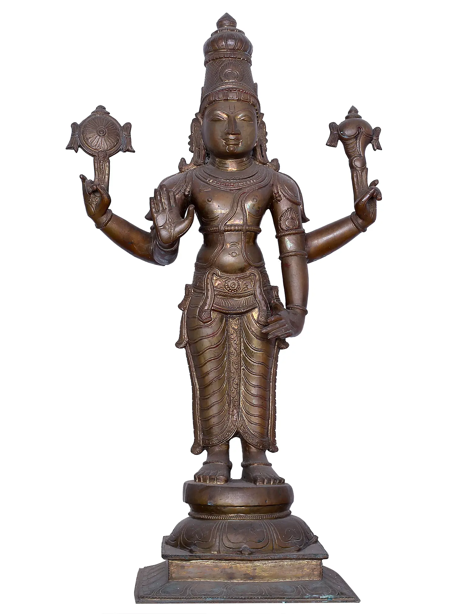 The Lord Vishnu statue with Sridevi and Bhudevi (made of Bronze), which is handcrafted in Swamimalai, captures the essence of divinity. This masterpiece invites worshippers to receive the grace and blessings of Lord Vishnu and his consorts by symbolising cosmic harmony and heavenly love.