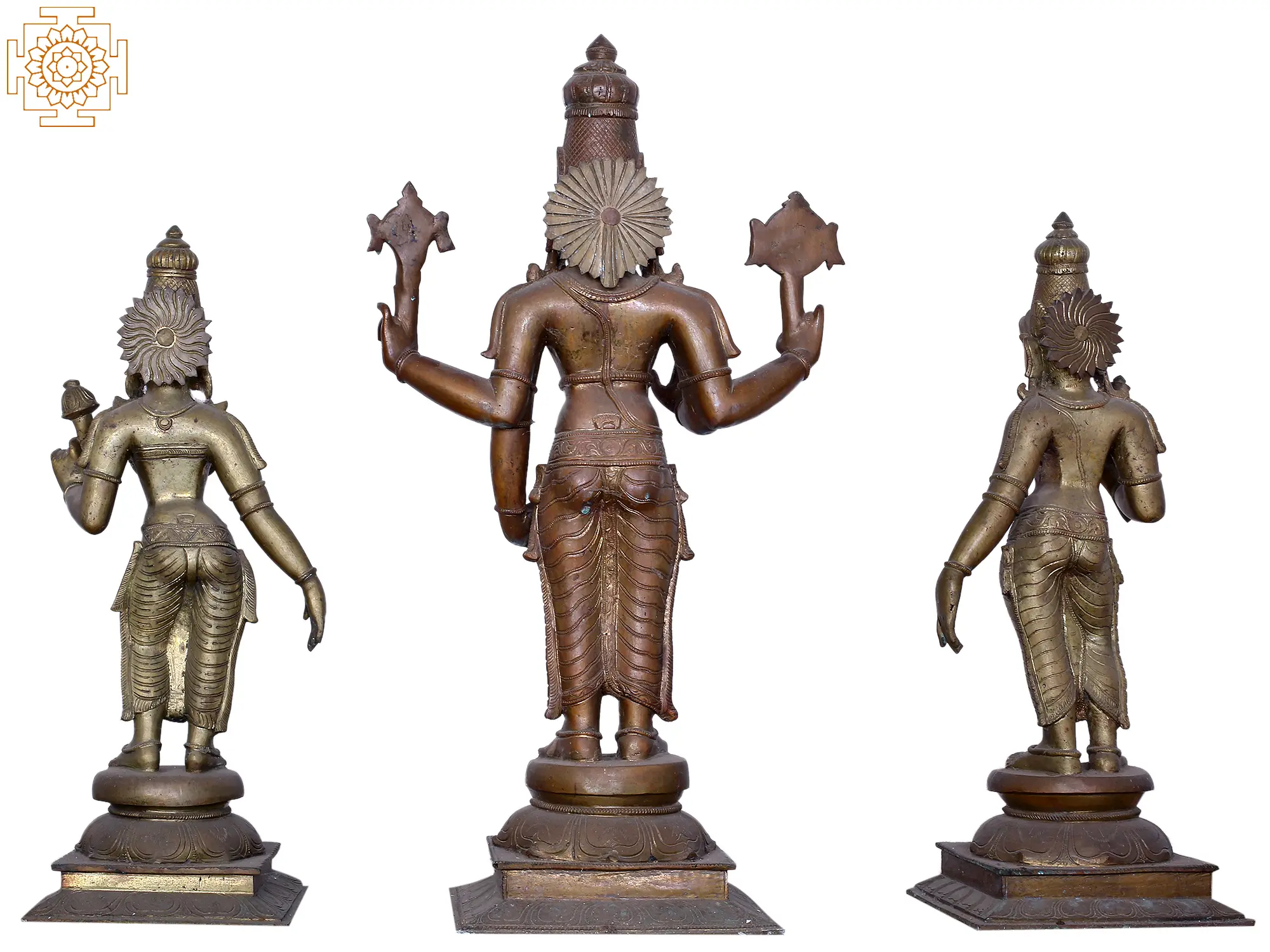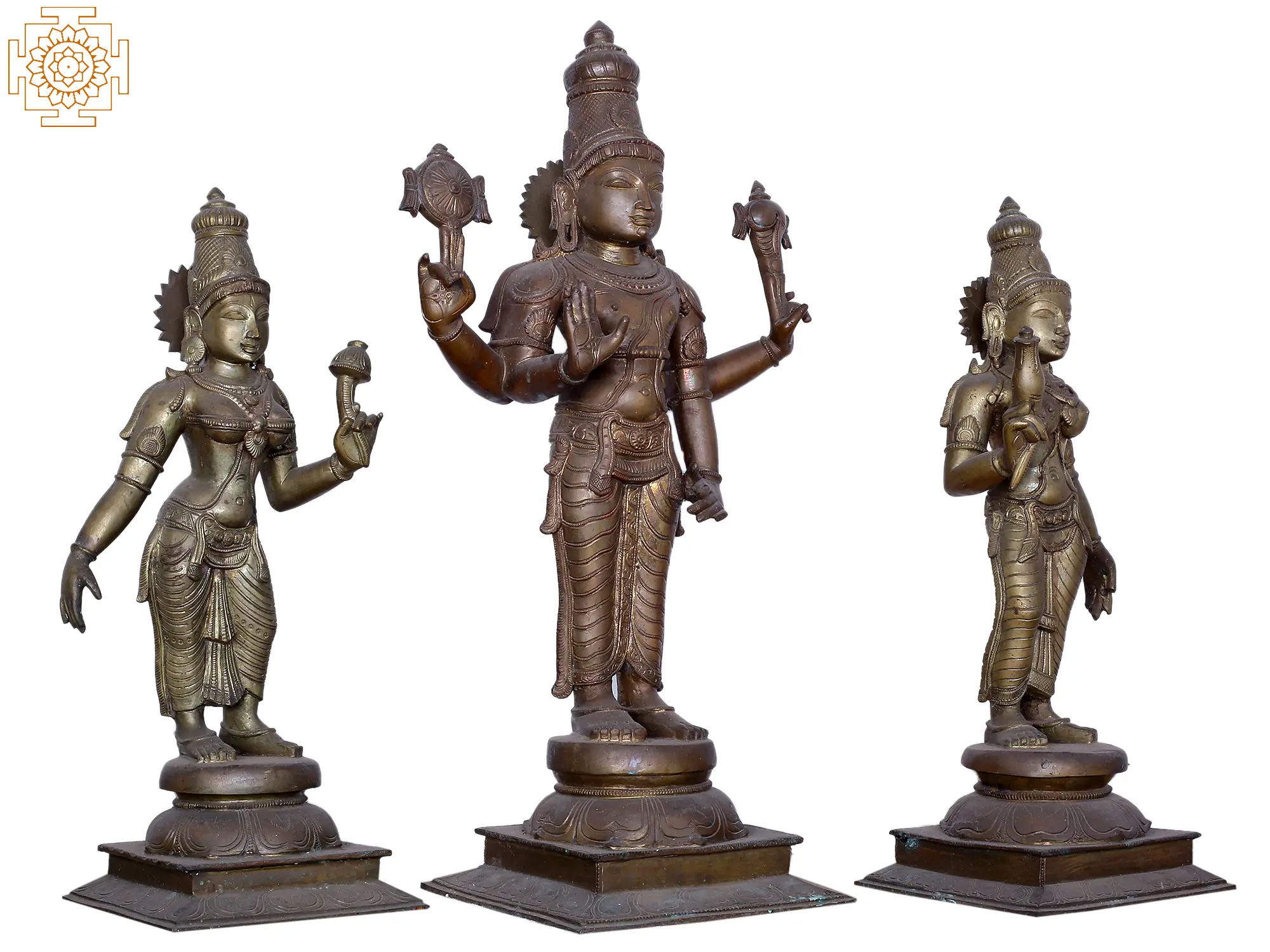 28" Lord Vishnu with Sridevi & Bhudevi | Handmade | Madhuchista Vidhana (Lost-Wax) | Panchaloha Bronze Statues from Swamimalai
